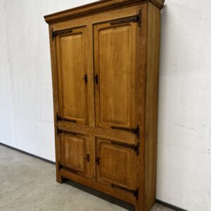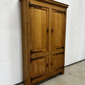 Rustikaalses stiilis massiivsest tammest raamatukapp. Sügavuselt täpselt õige, et oleks mugav raamatuid ühes reas hoiustada. Reguleeritavad riiulivahed. Kenad sepisdetailid. Lukud töökorras, võtmed olemas. Leidub väiksemaid kulumis- ja kasutusjälgi, kuid üldmulje väga hea. Transport ühes osas.