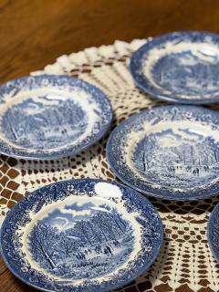 Kuus sinise dekooriga inglise salatitaldrikut. Ühe taldriku servas pisike killuviga. Müügil komplektina.