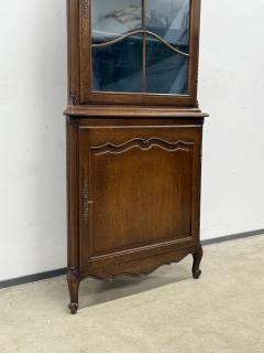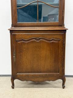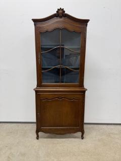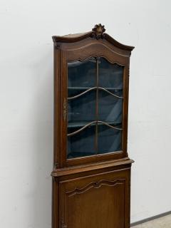 Tammest raamiga nurgavitriin. Kenad nikerdused uksel ja raamil. Klaasi tagant kaetud kangaga. Lukud töökorras, võti olemas. Nurga külgede laius 61 cm, eestvaates laius 85 cm, sügavus 47 cm. Leidub kulumis- ja kasutusjälgi.