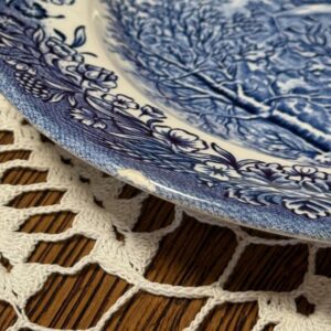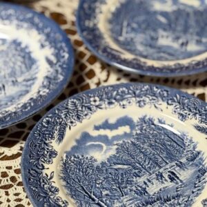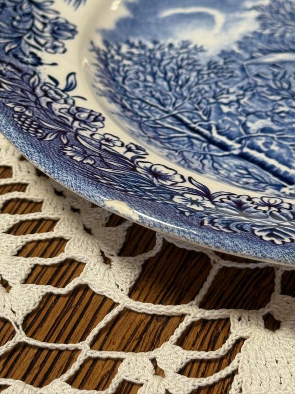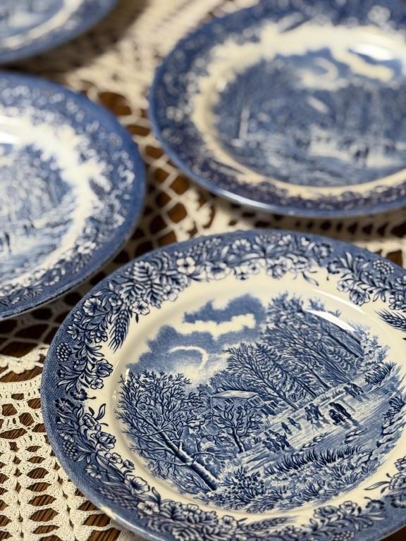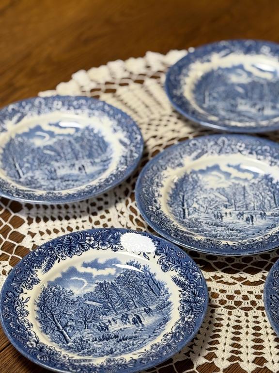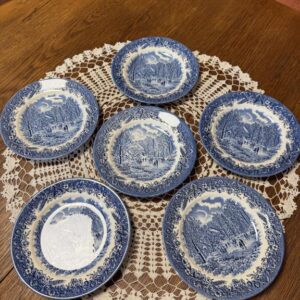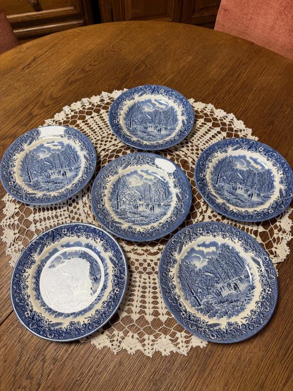 Kuus sinise dekooriga inglise salatitaldrikut. ühe taldriku servas pisike killuviga. Müügil komplektina.