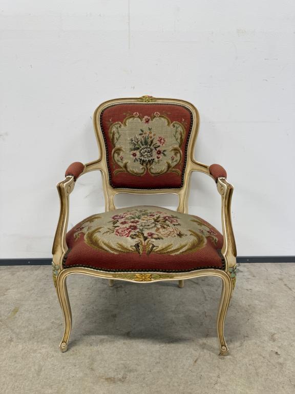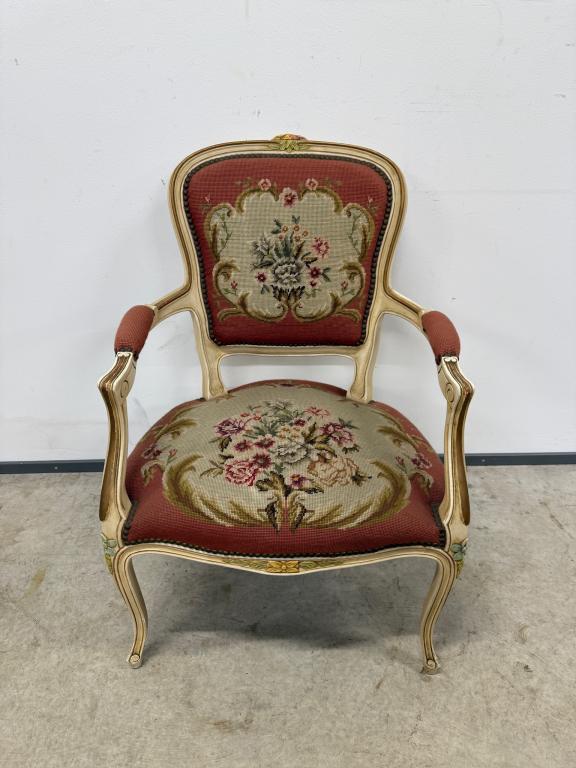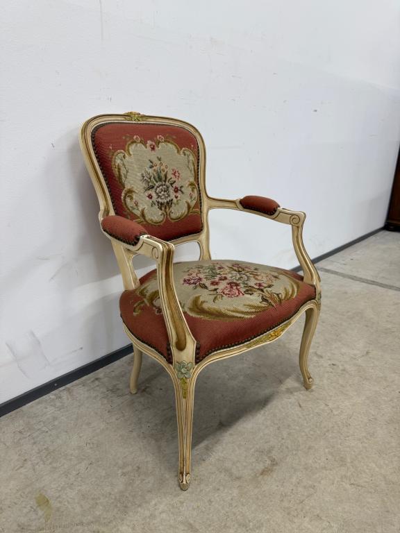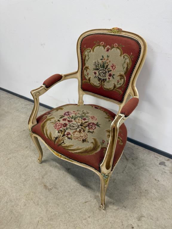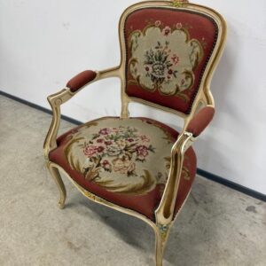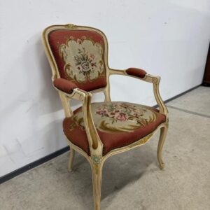 Antiikvalge raamiga tikitud kattega tool. Raam tugev ja stabiilne, polsterdus vajumata, kuid üldmulje veidi määrdunud.
