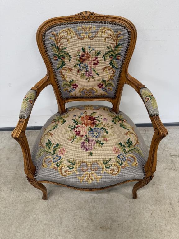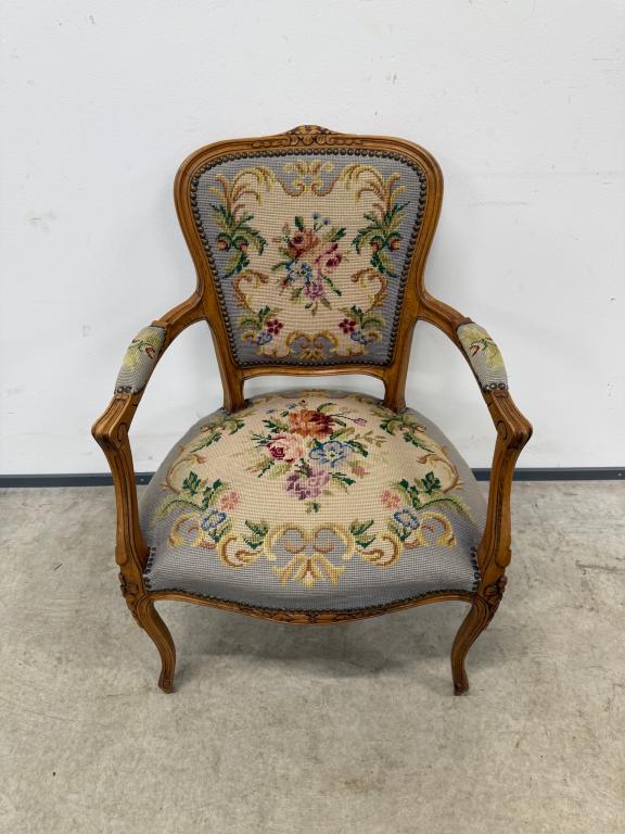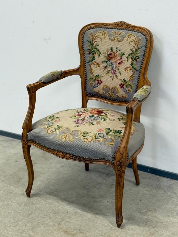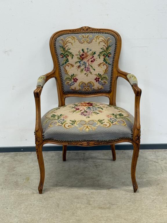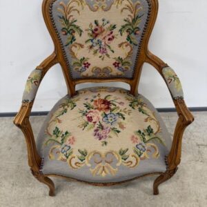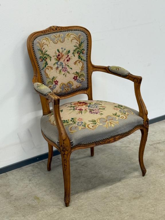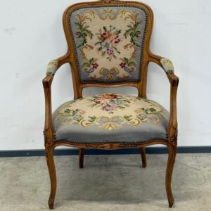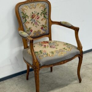 Tikitud kattega käetugedega tool. Raam tugev ja stabiilne, polsterdus vajumata. Kena vaadata ja mugav istuda 🙂
