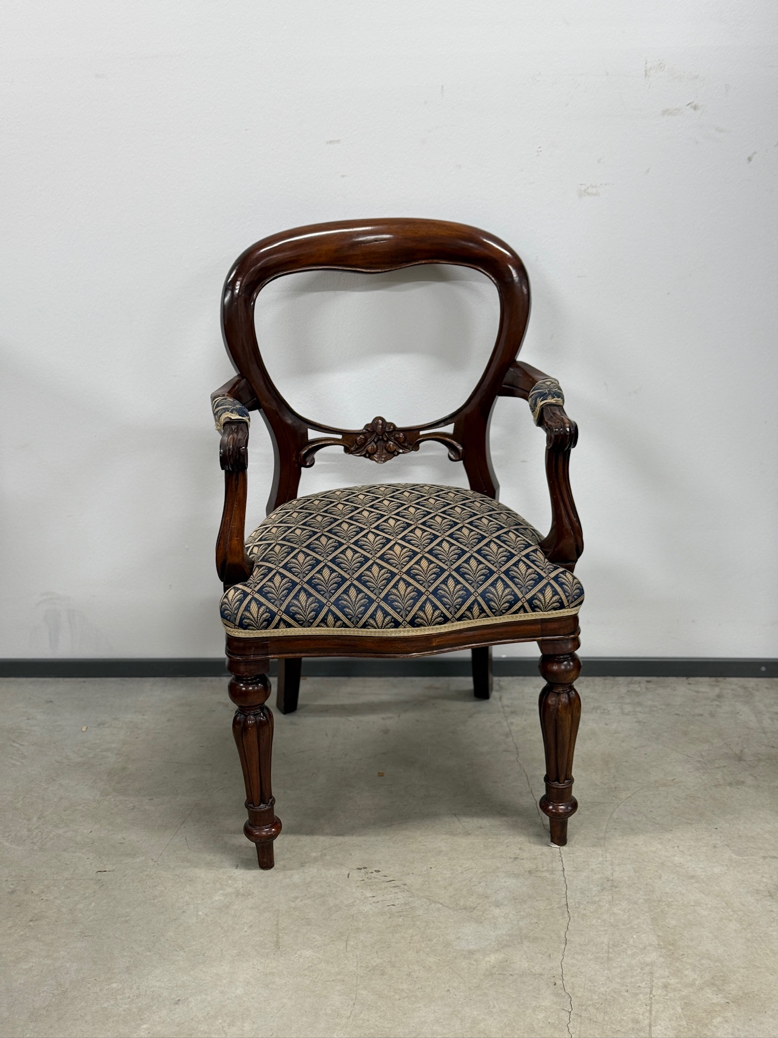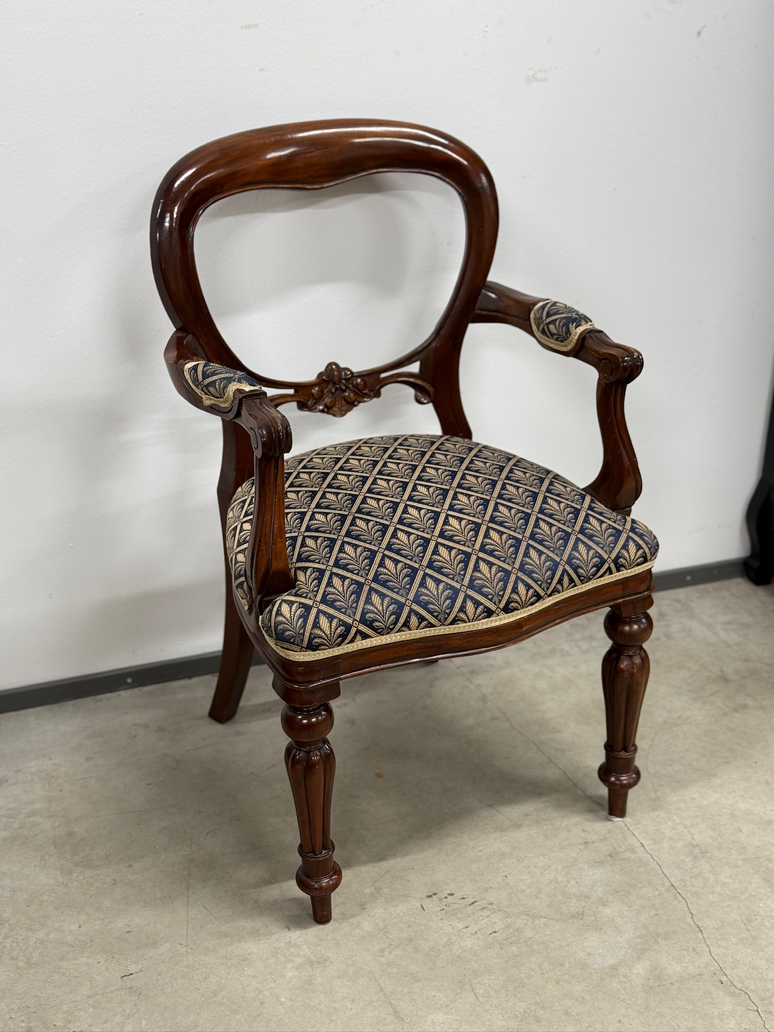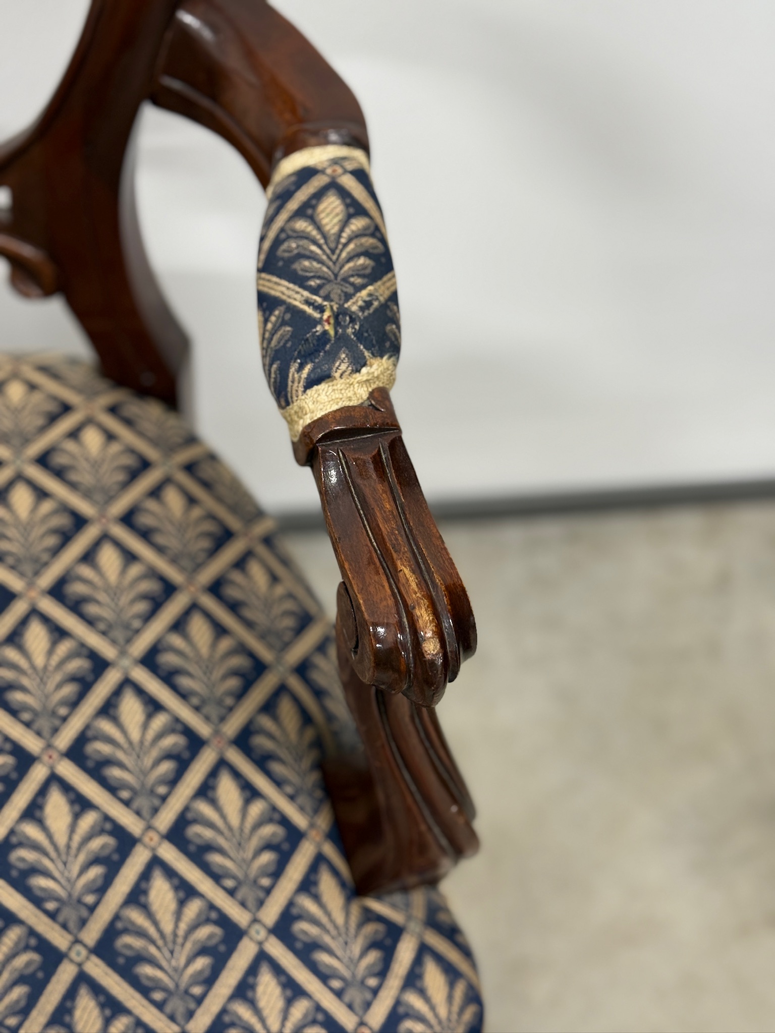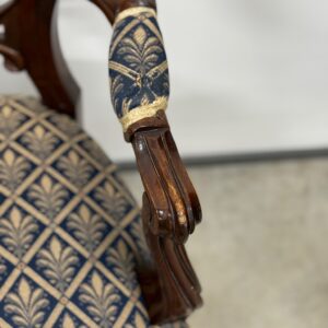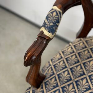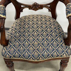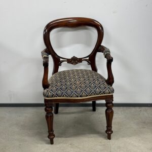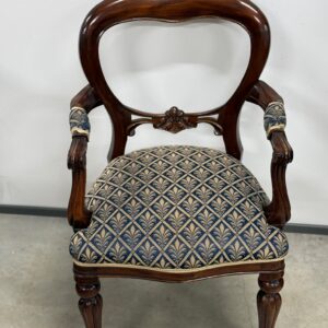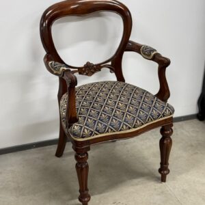Soliidse joonega käetugedega tool. Kangas tumesinise põhjaga, raami värvi pähklipruun. Raam tugev ja stabiilne. Leidub väiksemaid kulumis- ja kasutusjälgi, kuid üldmulje väga hea.