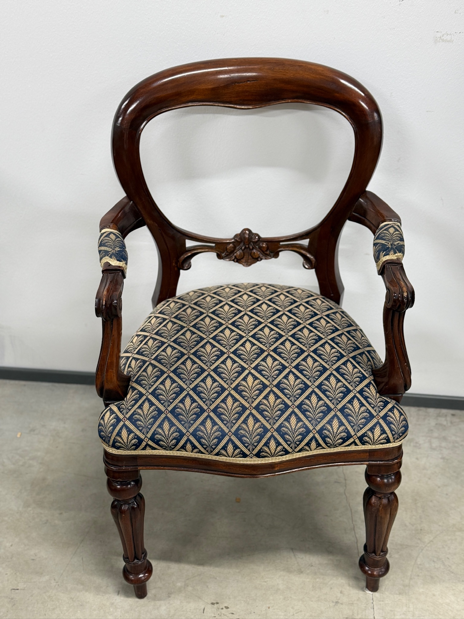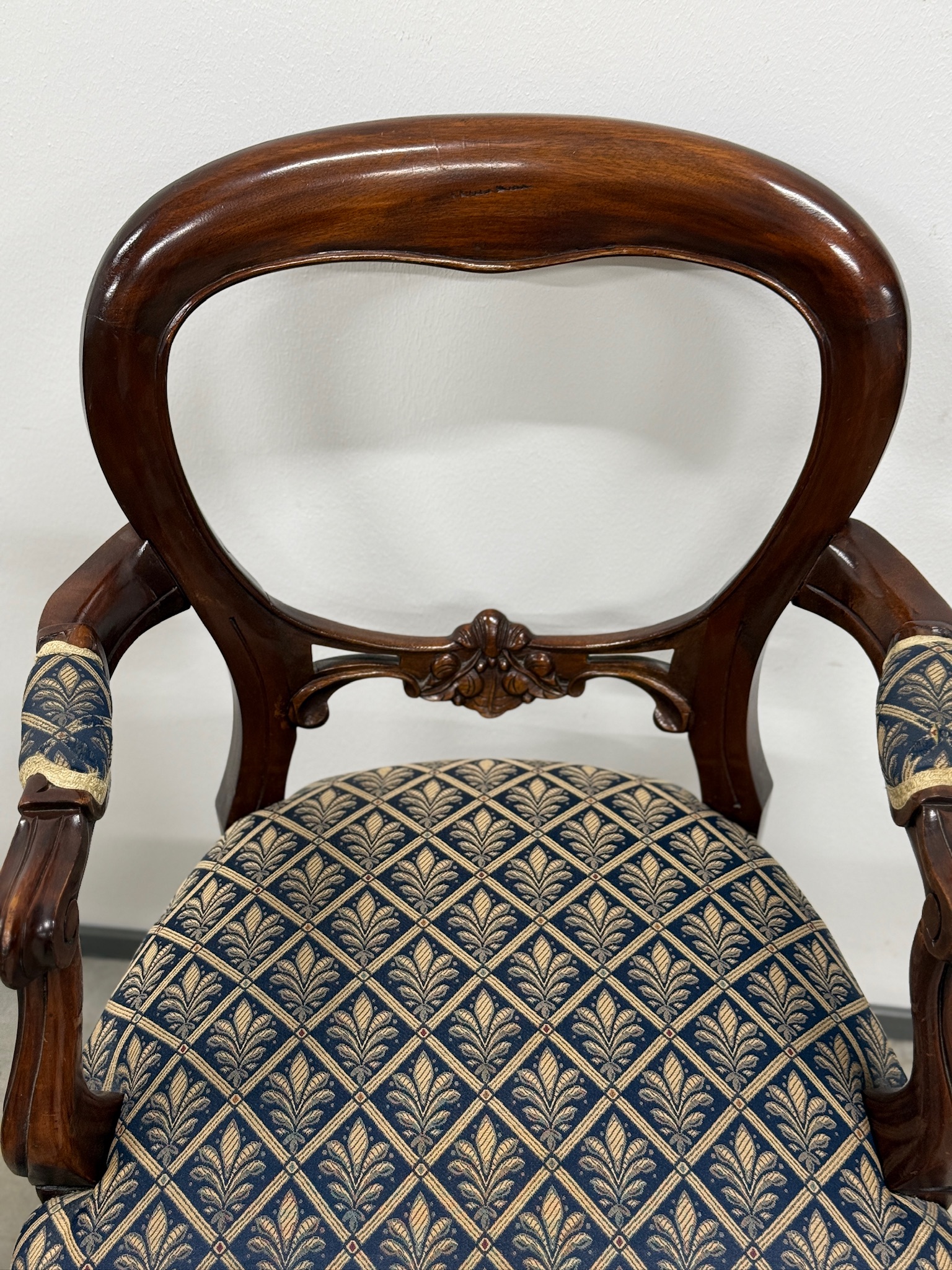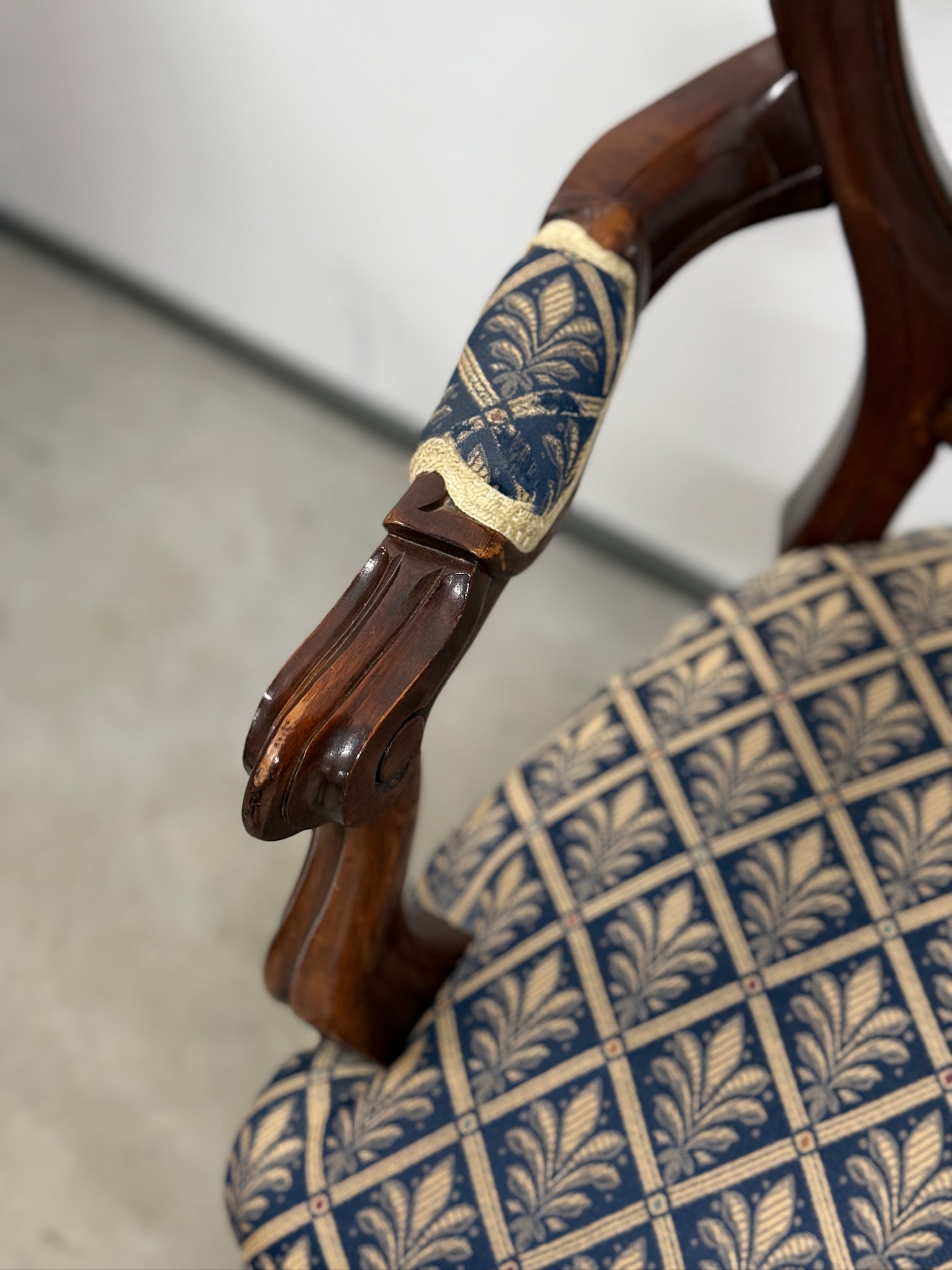 Soliidse joonega käetugedega tool. Kangas tumesinise põhjaga, raami värvi pähklipruun. Raam tugev ja stabiilne. Leidub väiksemaid kulumis- ja kasutusjälgi, kuid üldmulje väga hea.