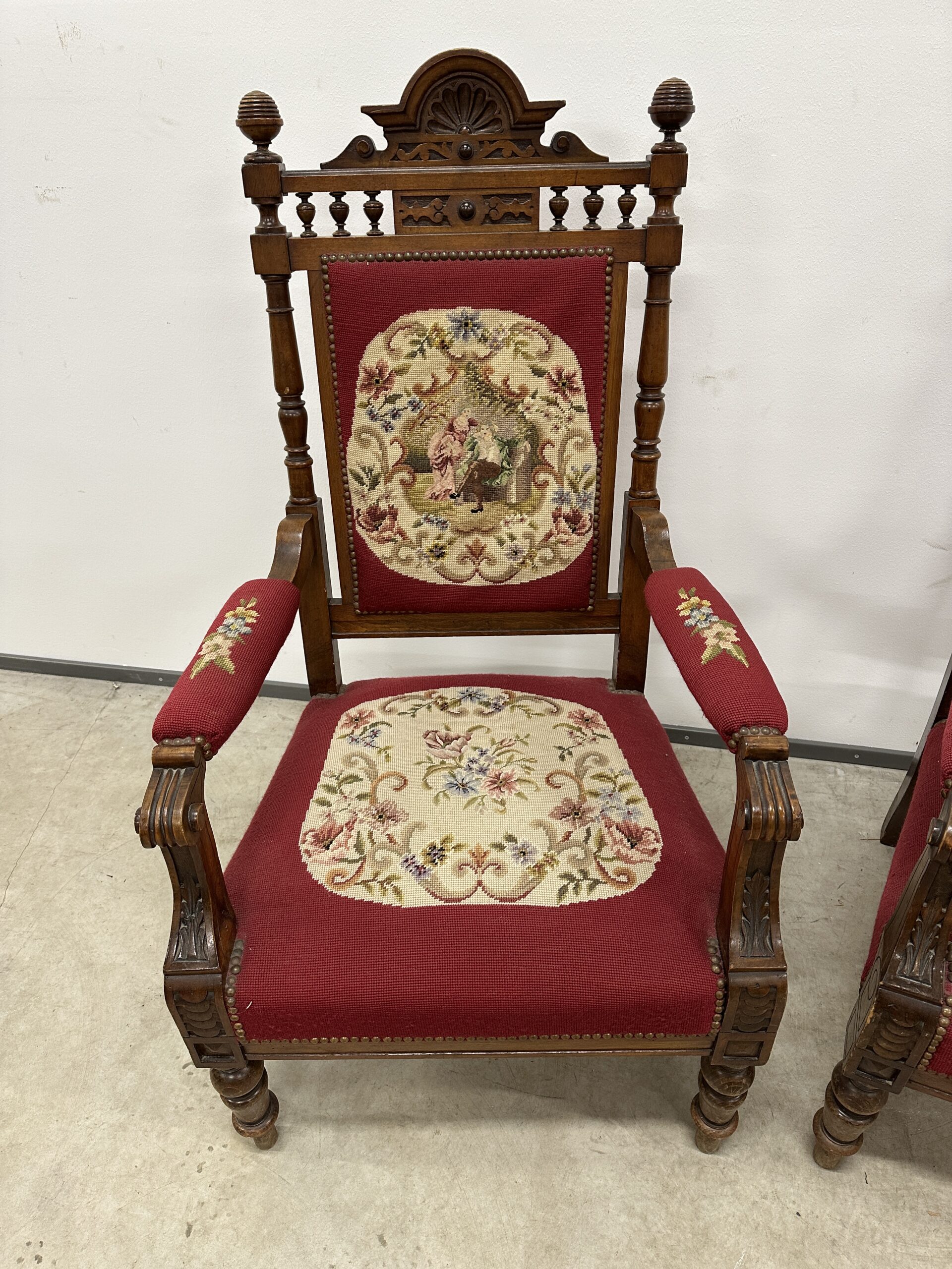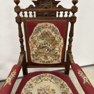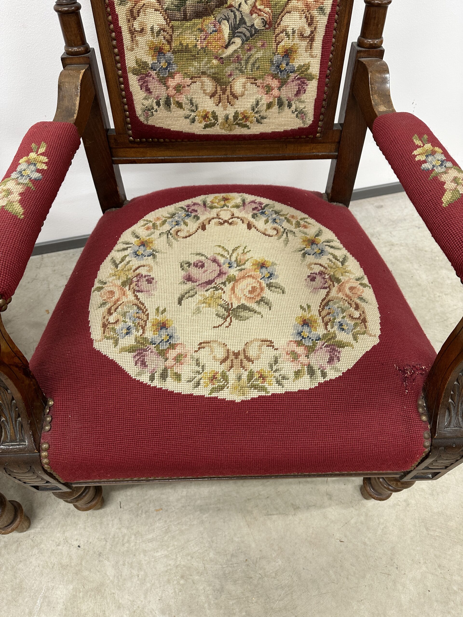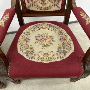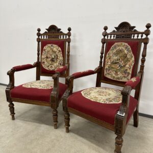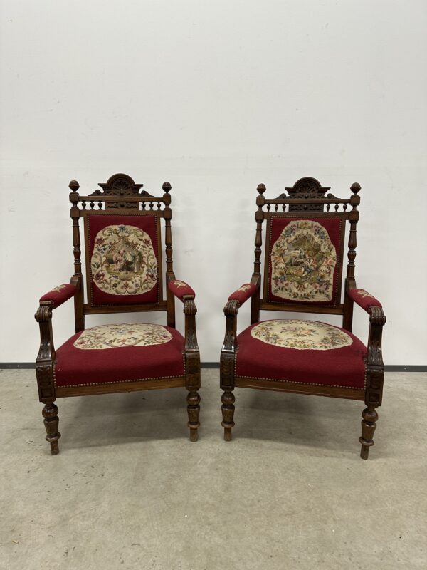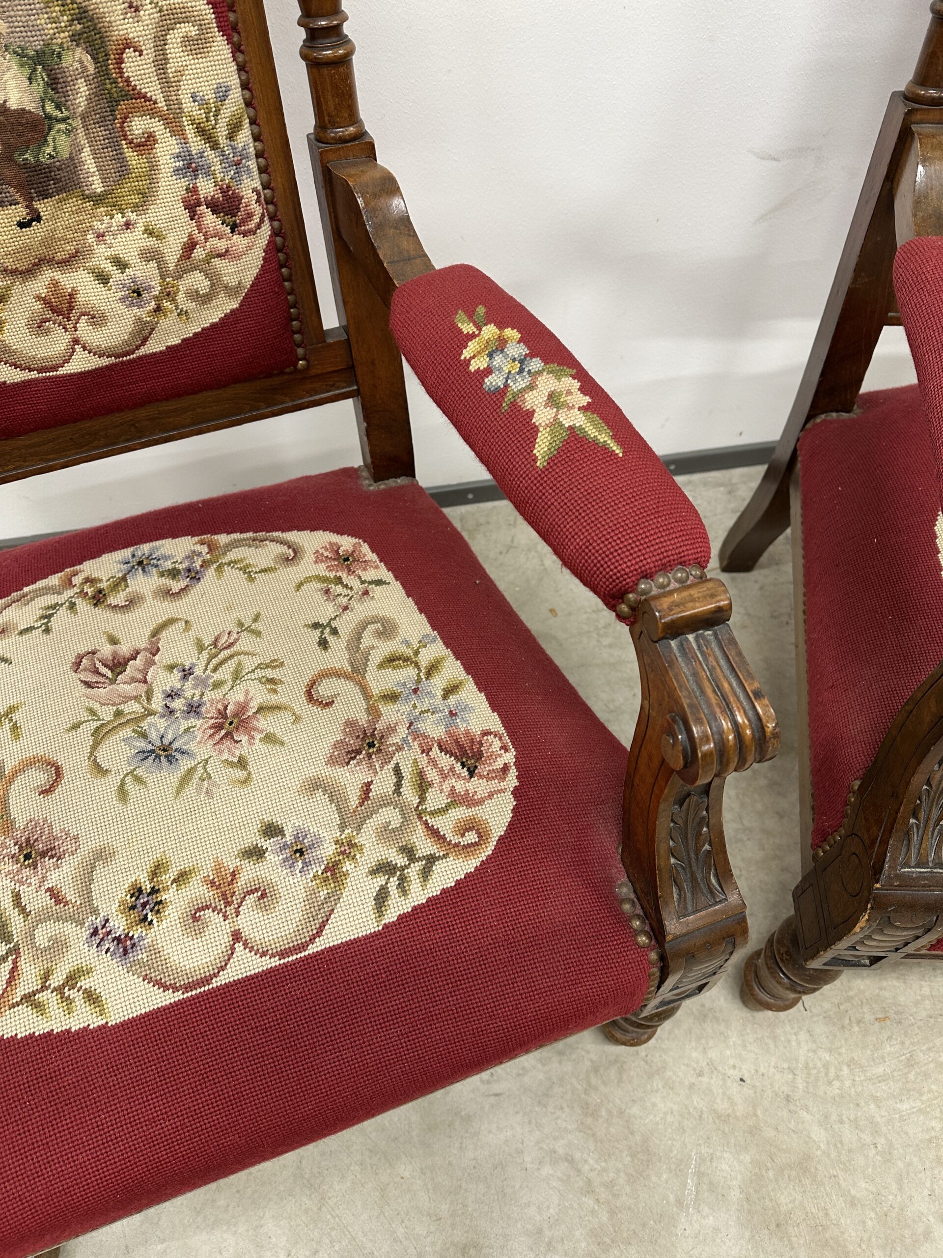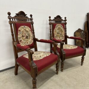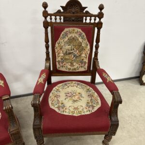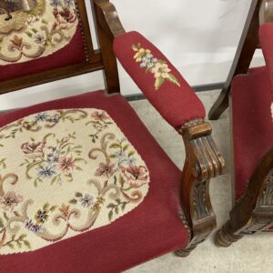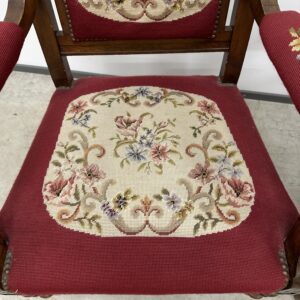 Uhkete nikerdatud raamidega tikitud kattega tugitoolid. Toolid on auväärses vanuses, kuid siiani pilkupüüdvad ja mugavad. Raamid tugevad ja terved, kuid ühel toolil istumisosa katet parandatud – vt pilt. Müügil komplektina.