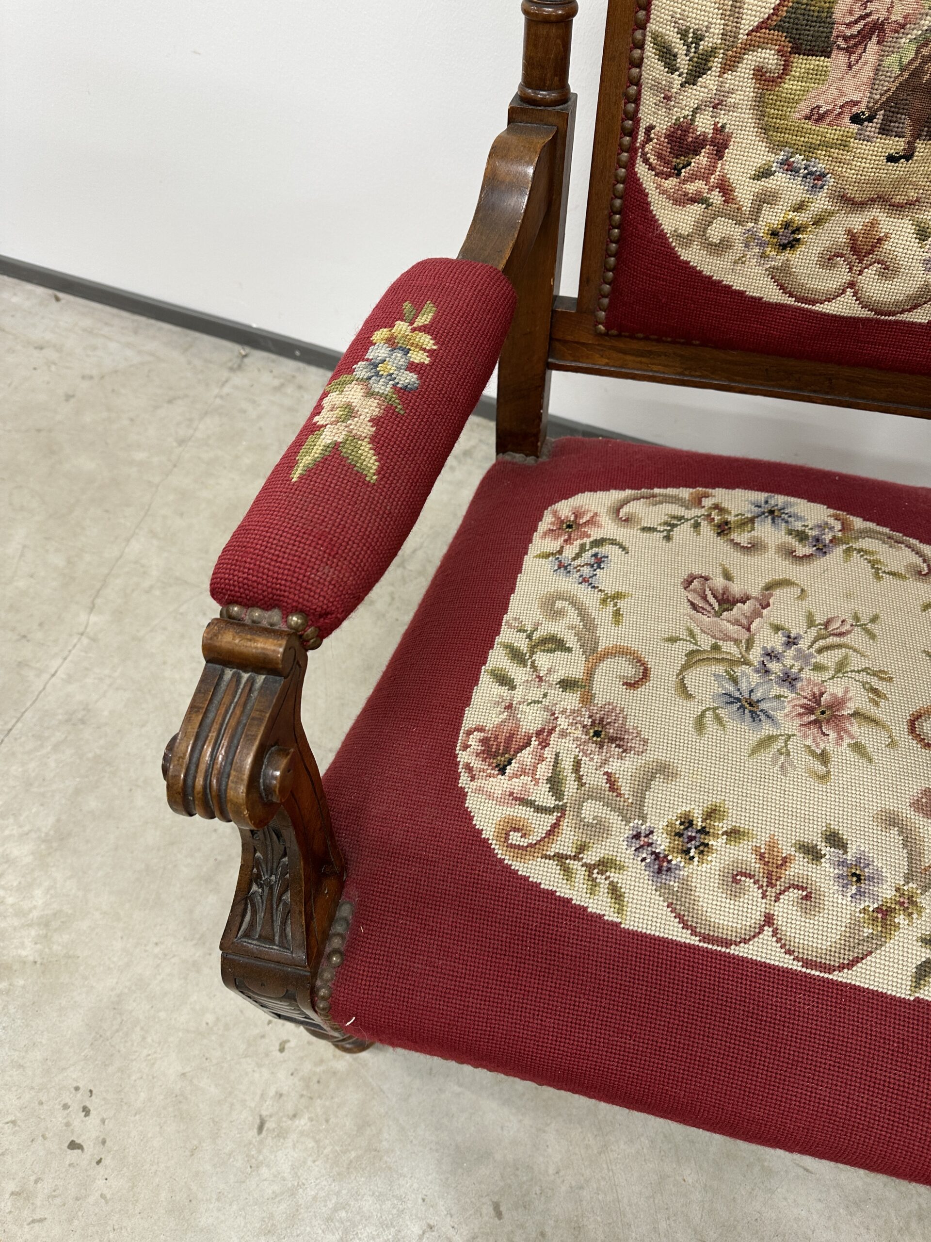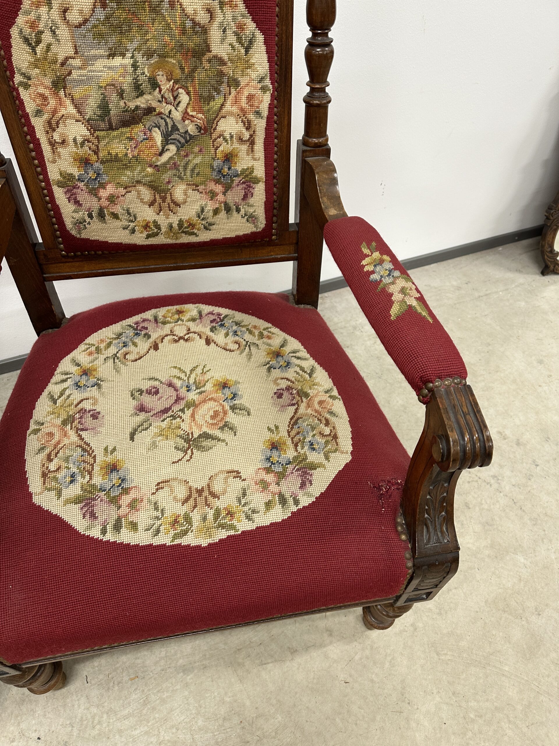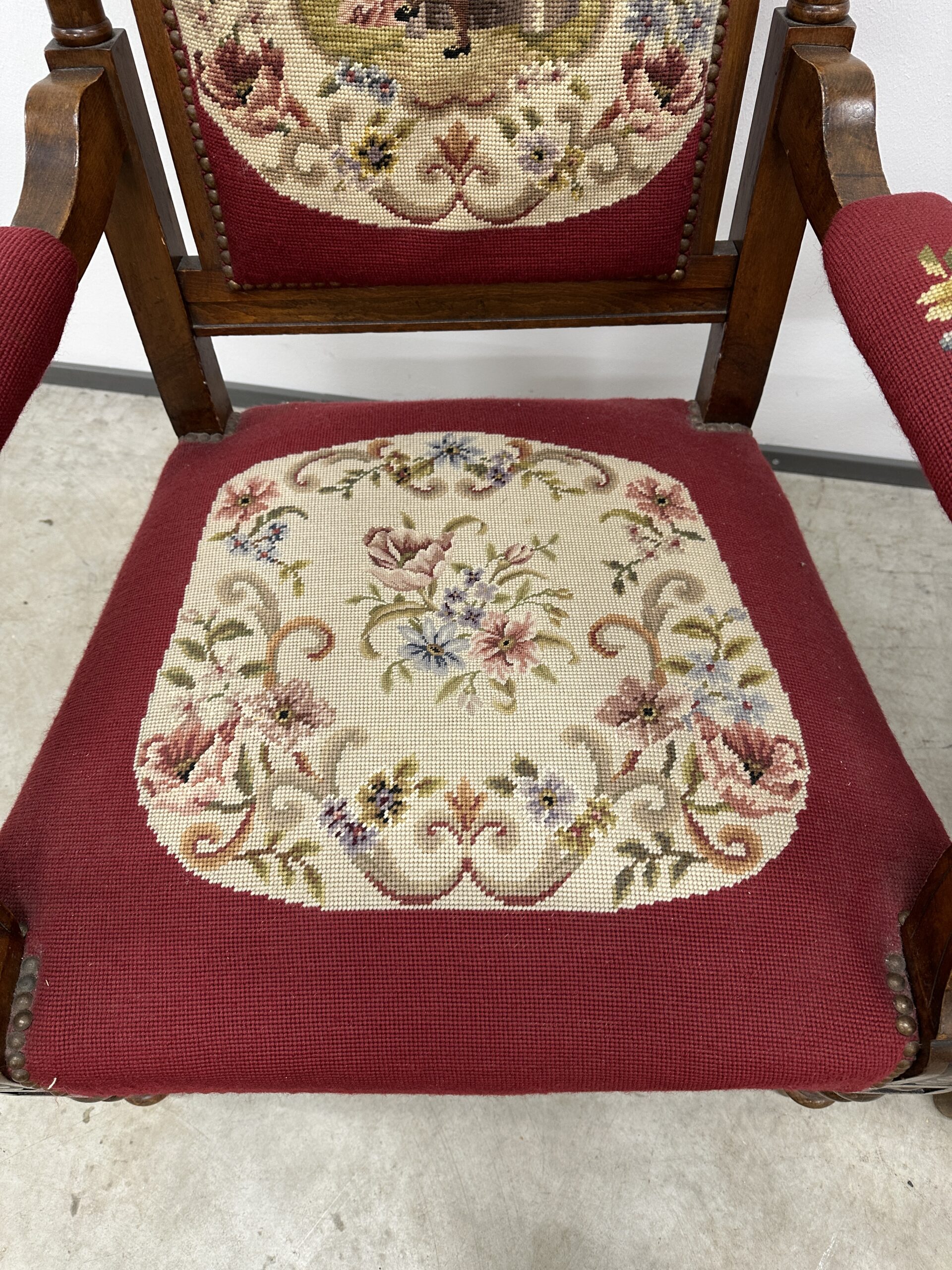Uhkete nikerdatud raamidega tikitud kattega tugitoolid. Toolid on auväärses vanuses, kuid siiani pilkupüüdvad ja mugavad. Raamid tugevad ja terved, kuid ühel toolil istumisosa katet parandatud – vt pilt. Müügil komplektina.
