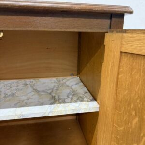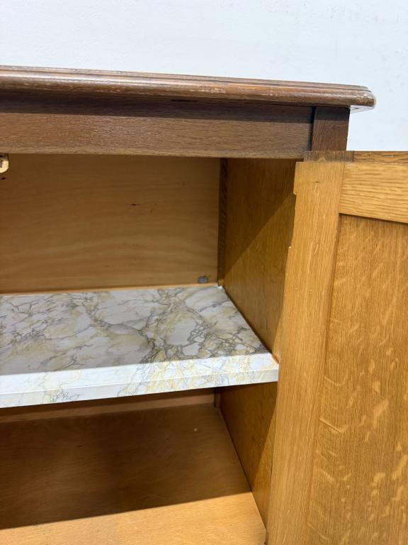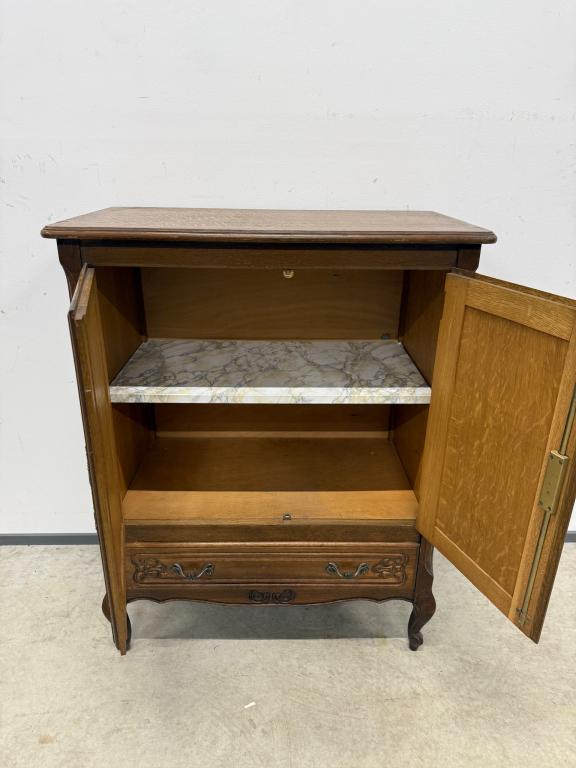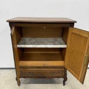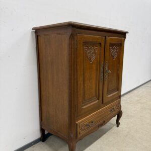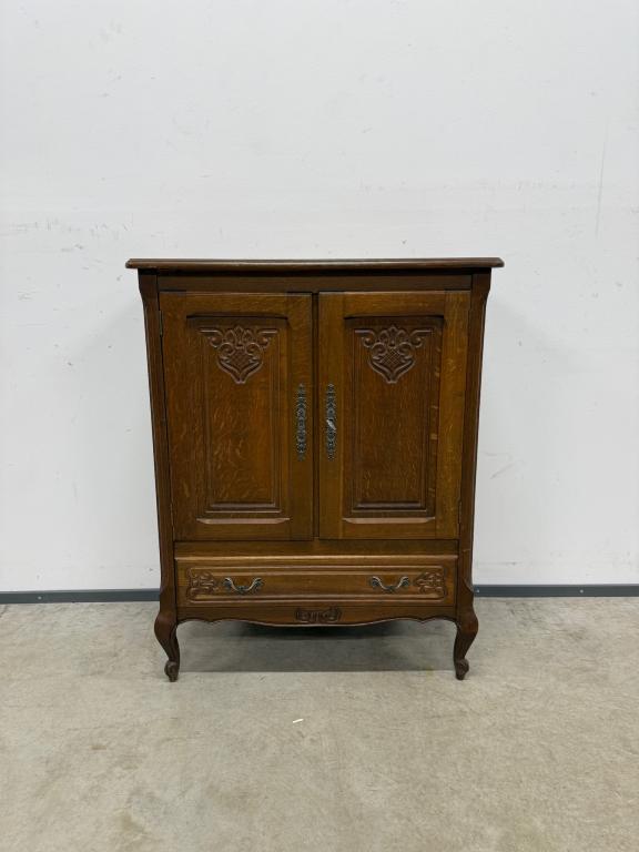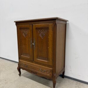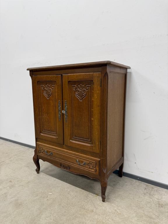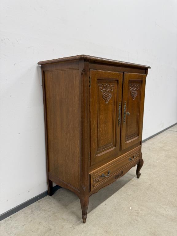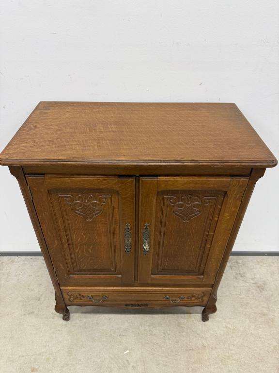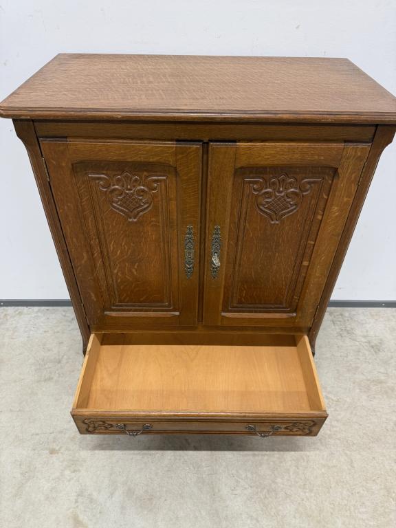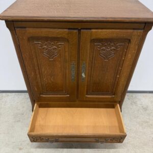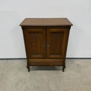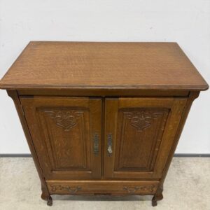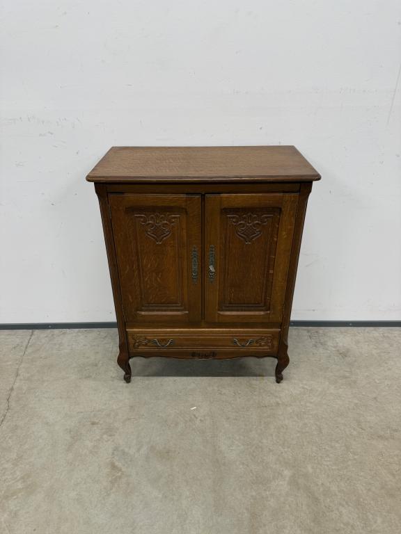 Tammest raamiga kapp. Ilusad nikerdused ustel ja raamil. Sees kleeppaberiga kaetud riiul. Lukk töökorras, võti olemas. Leidub väiksemaid kulumis- ja kasutusjälgi, kuid üldmulje korralik.