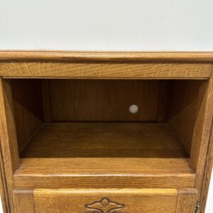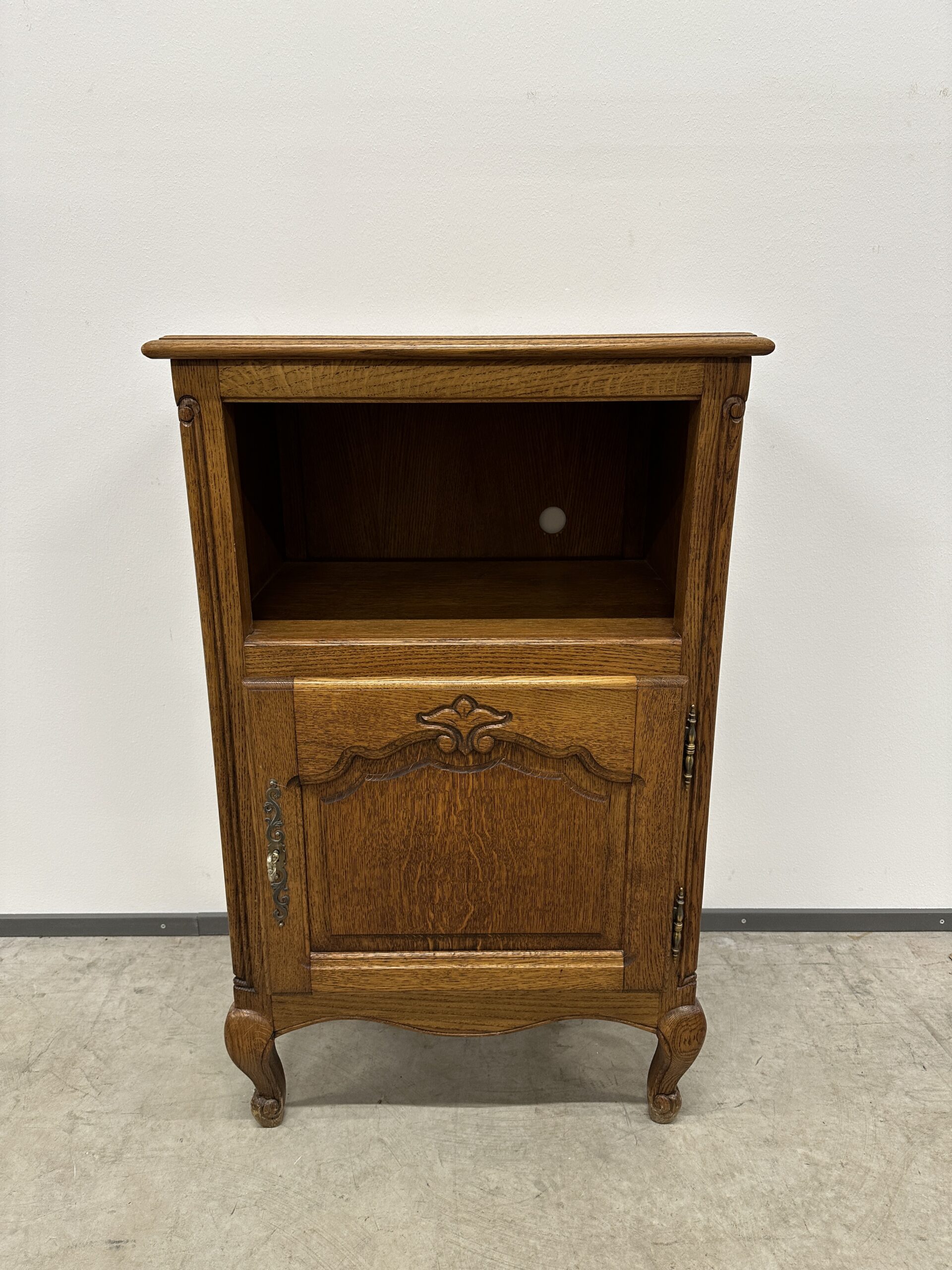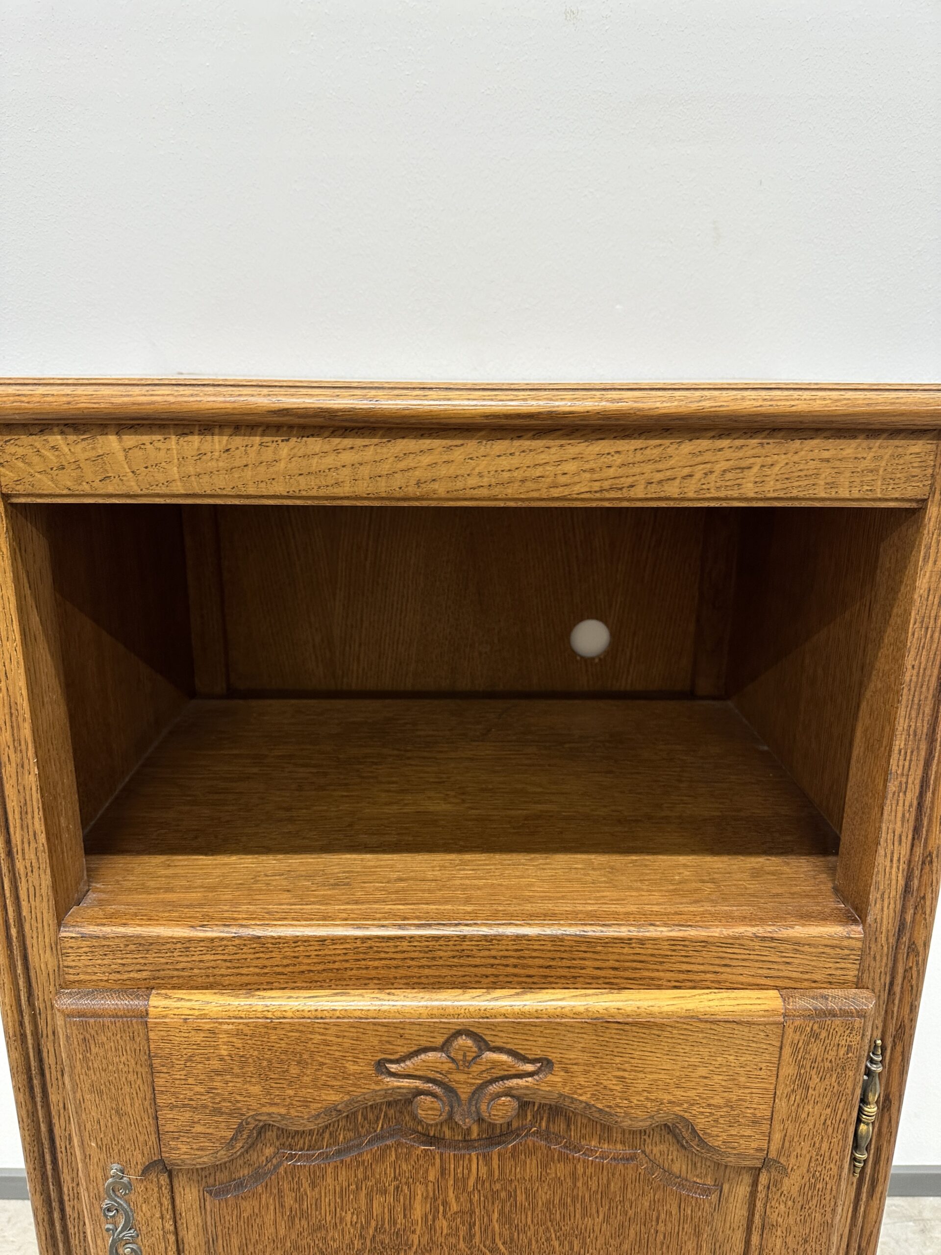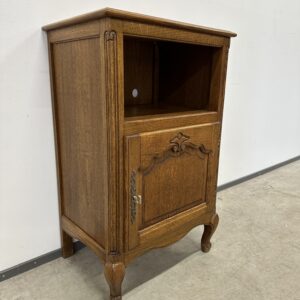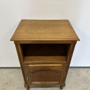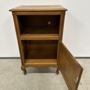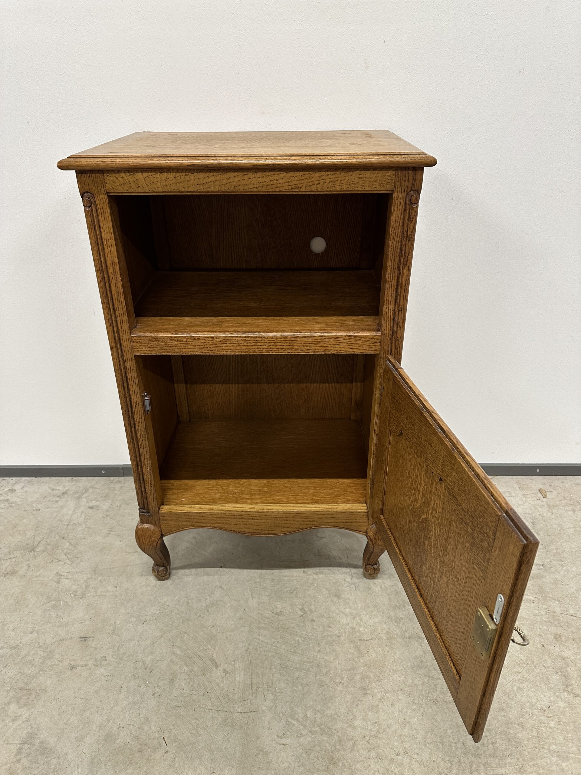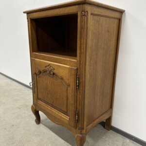 Avatud riiuliosaga kitsas kapp. Kapp on tammest raamiga. Lukk töökorras, võti olemas. Leidub väiksemaid kulumis- ja kasutusjälgi, kuid üldmulje korralik.