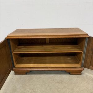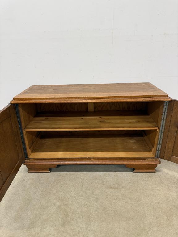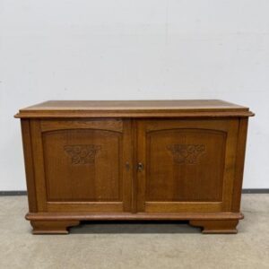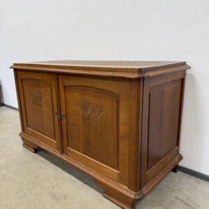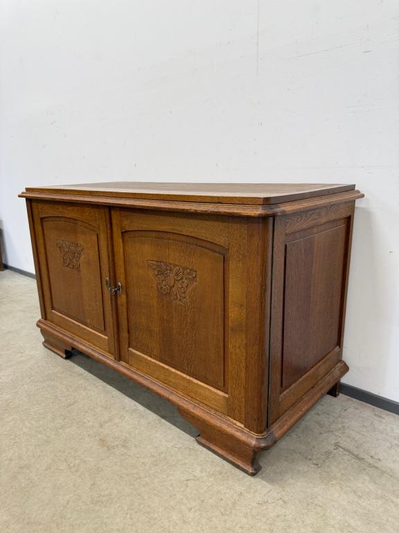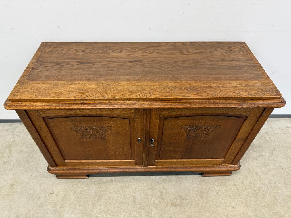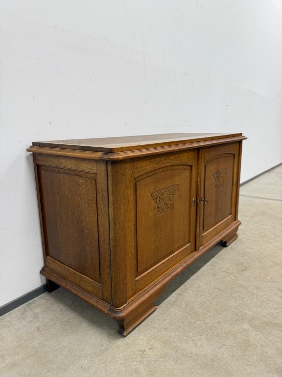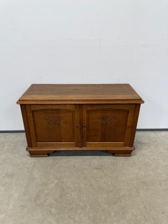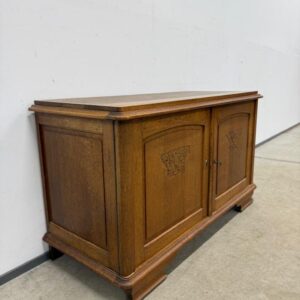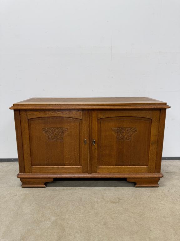Hea suurusega tammest raamiga kapp. Olnud vitriinkapi alumine osa, sellest kerge rant pealmisel plaadil. LUkud töökorras, võti olemas.