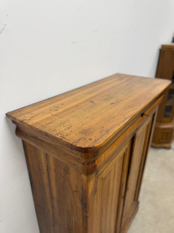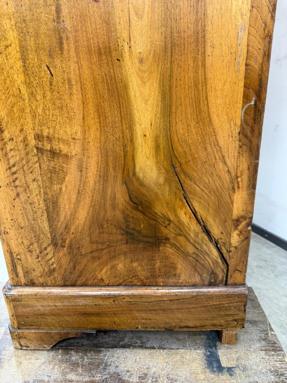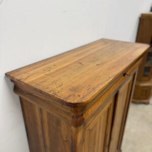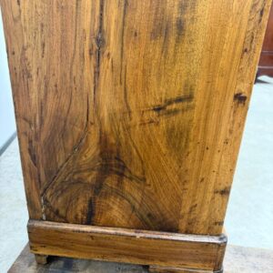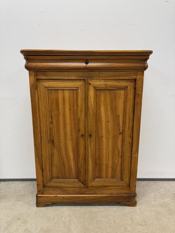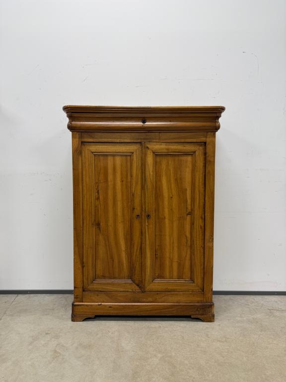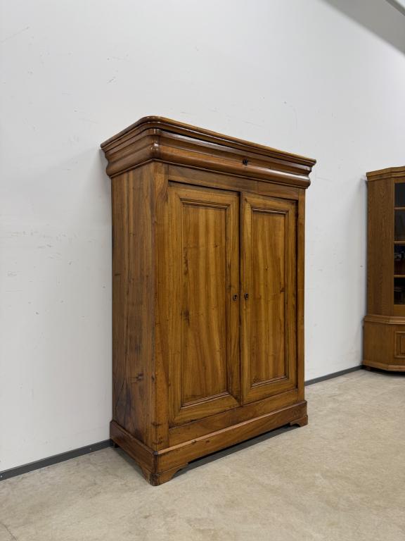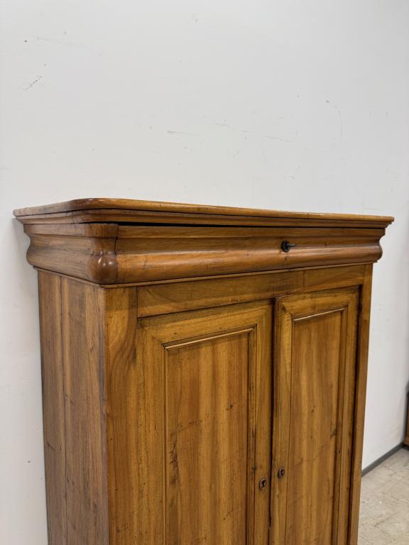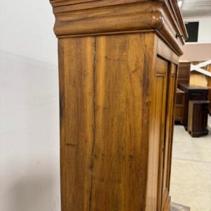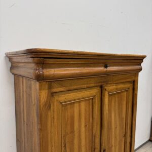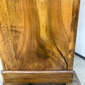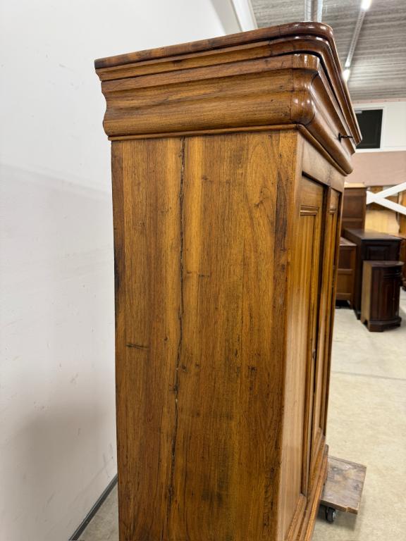 Soliidne sajandivanune pähklipuust kapp. Sees riiulid, üleval mahukas sahtel. Lukk ei ole töökorras. Leidub kuivamispragusid, kasutusjälgi. Pealmine plaat veidi kõveraks kuivanud, vt pilt. üldmulje korralik. Transport ühes osas.
