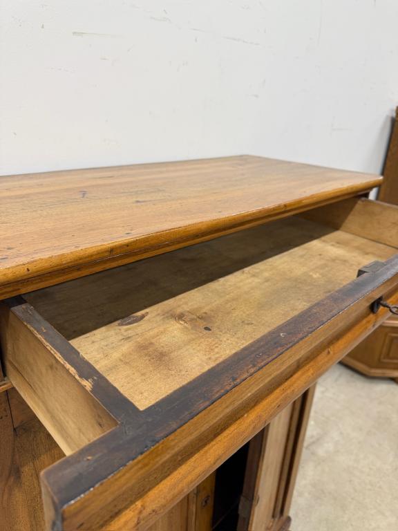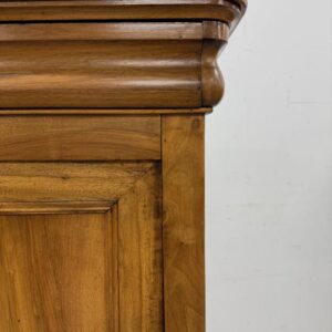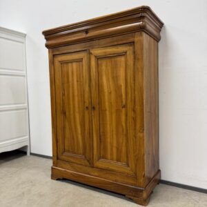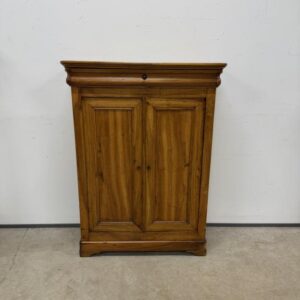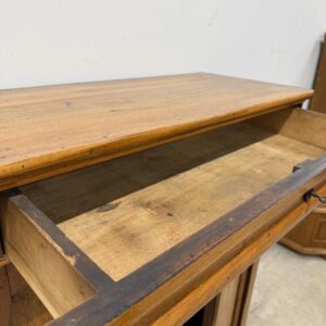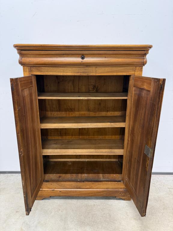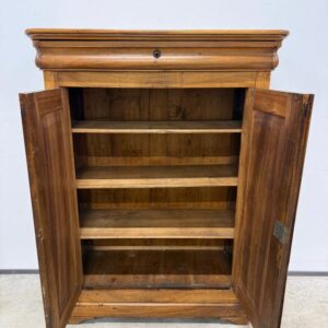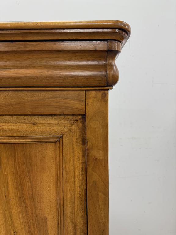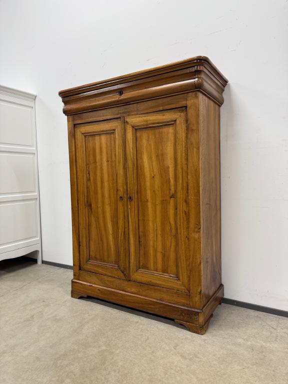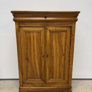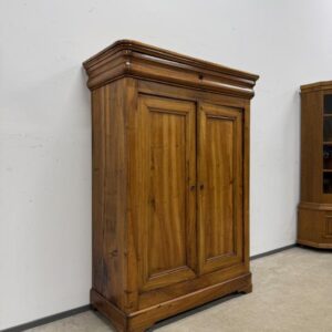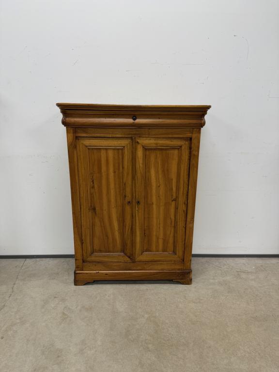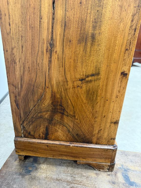 Soliidne sajandivanune pähklipuust kapp. Sees riiulid, üleval mahukas sahtel. Lukk ei ole töökorras. Leidub kuivamispragusid, kasutusjälgi. Pealmine plaat veidi kõveraks kuivanud, vt pilt. üldmulje korralik. Transport ühes osas.
