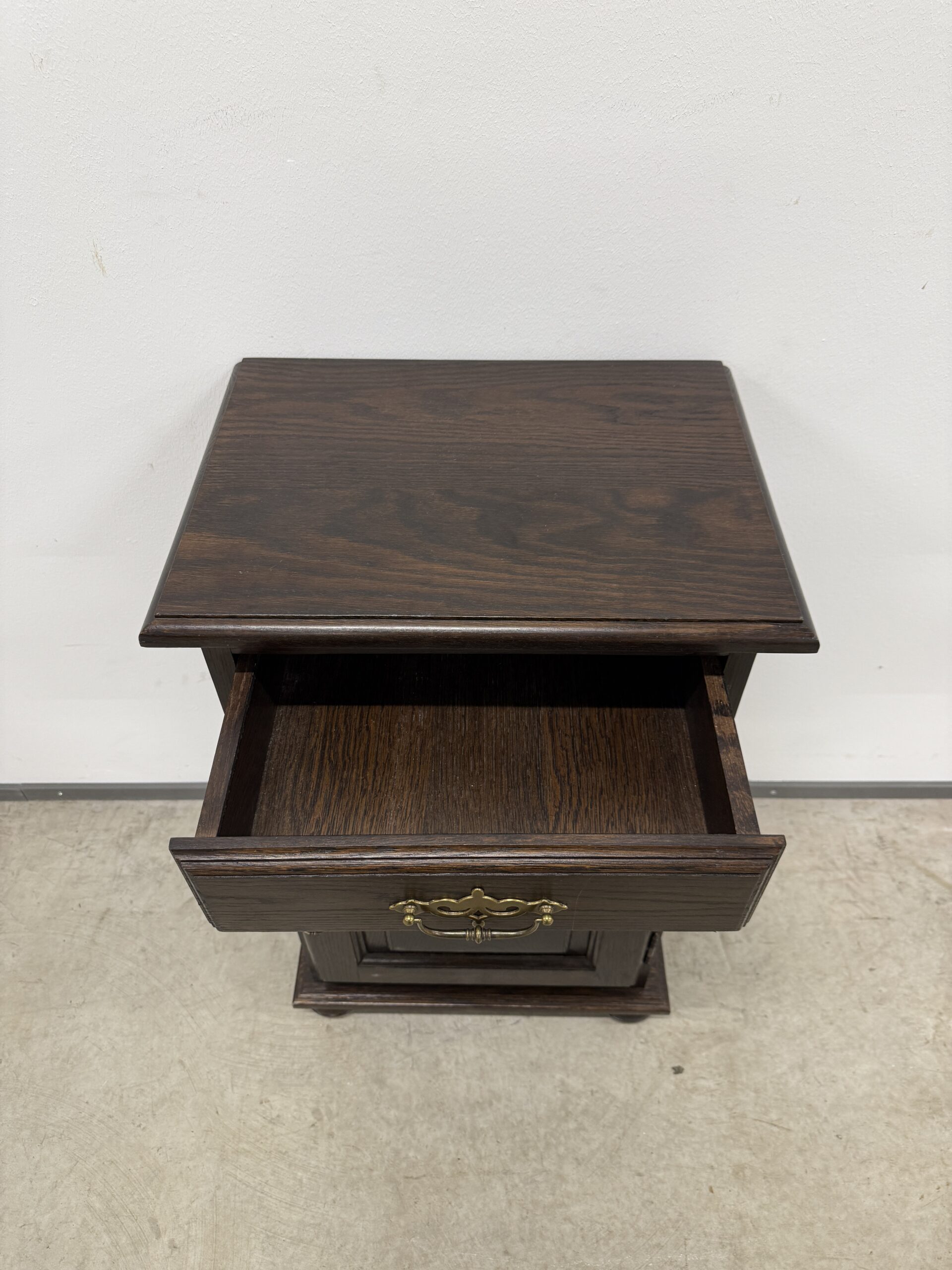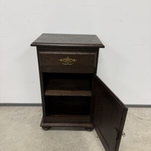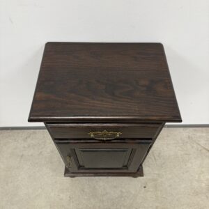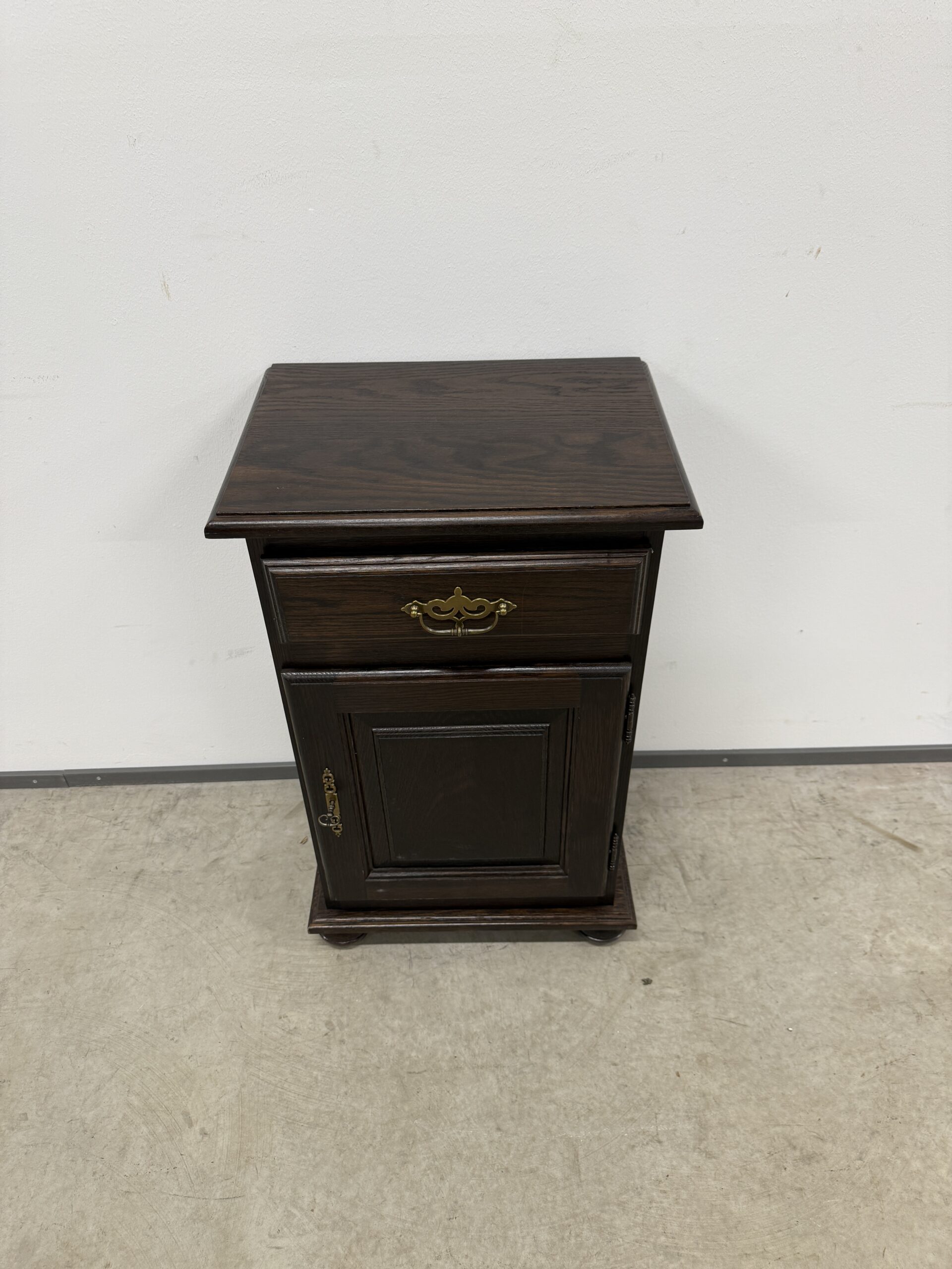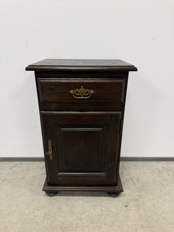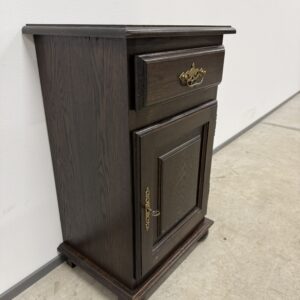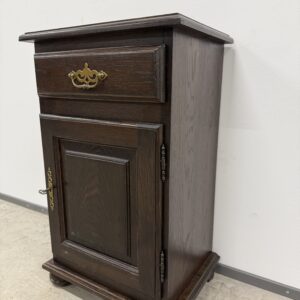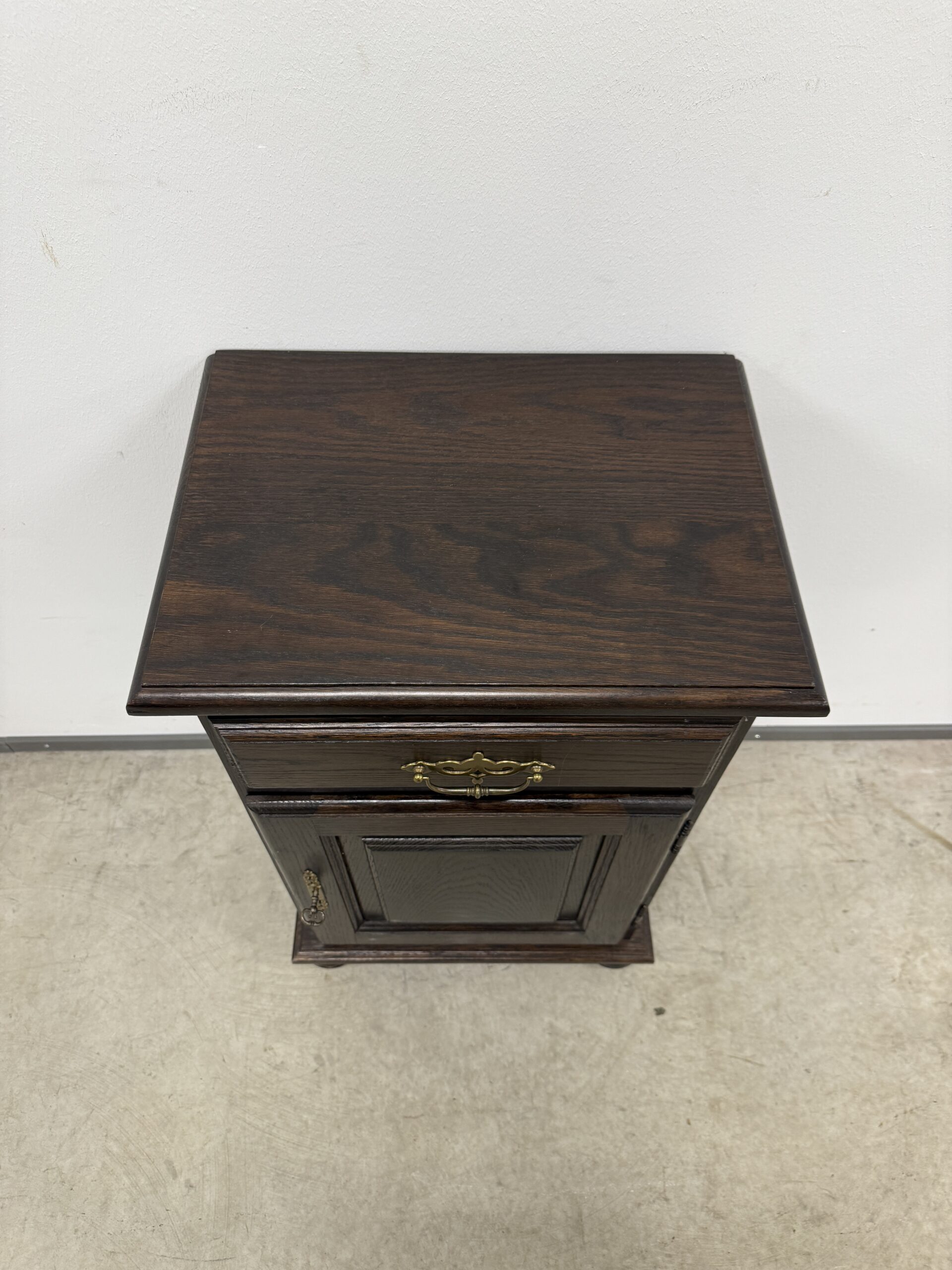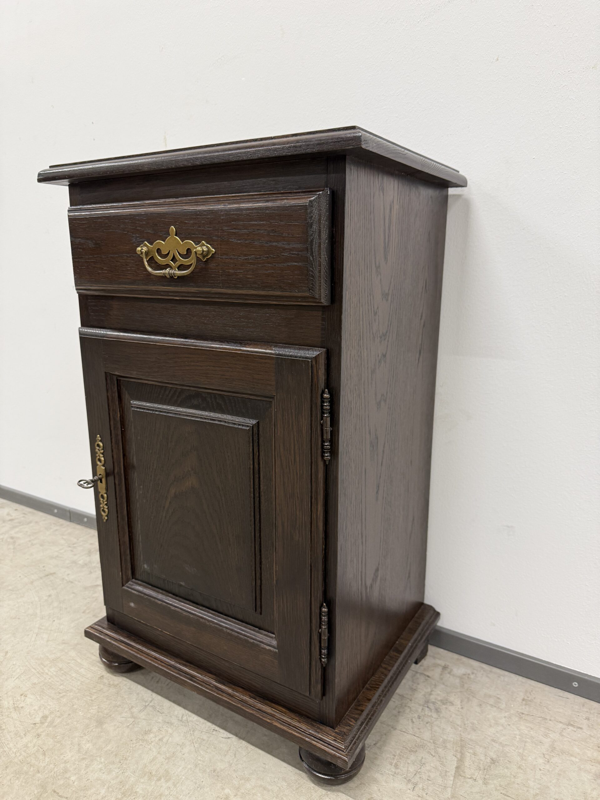 Tumepruuni peitsiga kitsas tammest kapp. Lukk töökorras, võti olemas. Väga heas seisukorras.