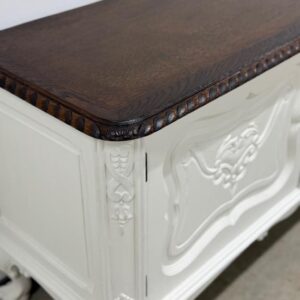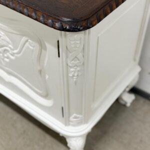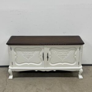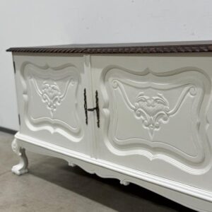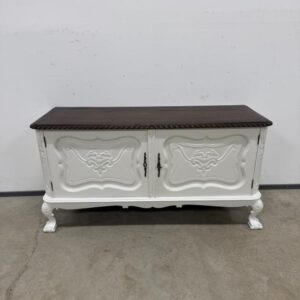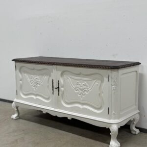 Uhkete nikerdustega chippendale stiilis madal kapp. Pealmine plaat puhastatud vanast viimistlusest ning peitsitud/õlitatud, kapi küljed ja uksed värvitud Vintro kriidivärviga, toon Pearl (antiikvalge). Lukk töökorras, võti olemas. Transport ühes osas.