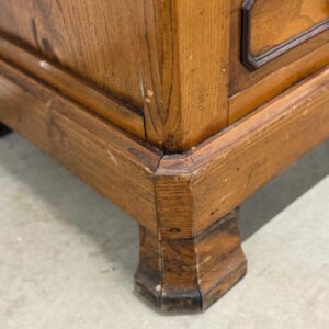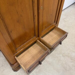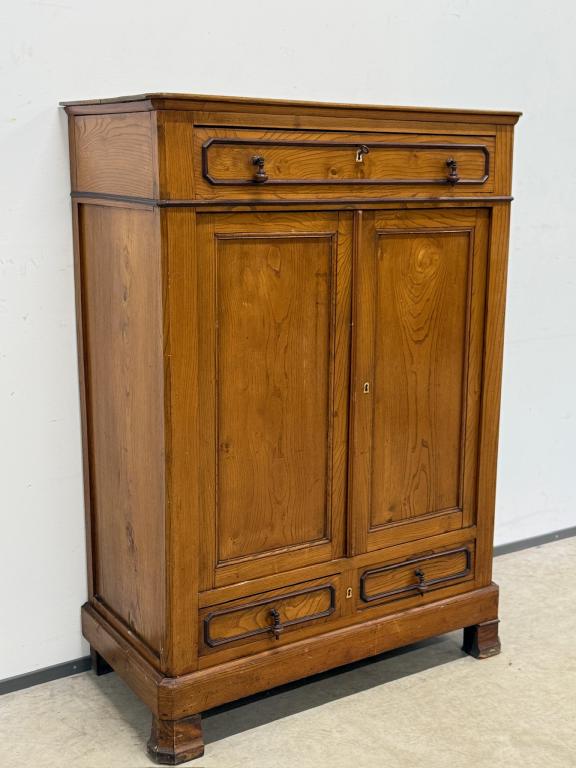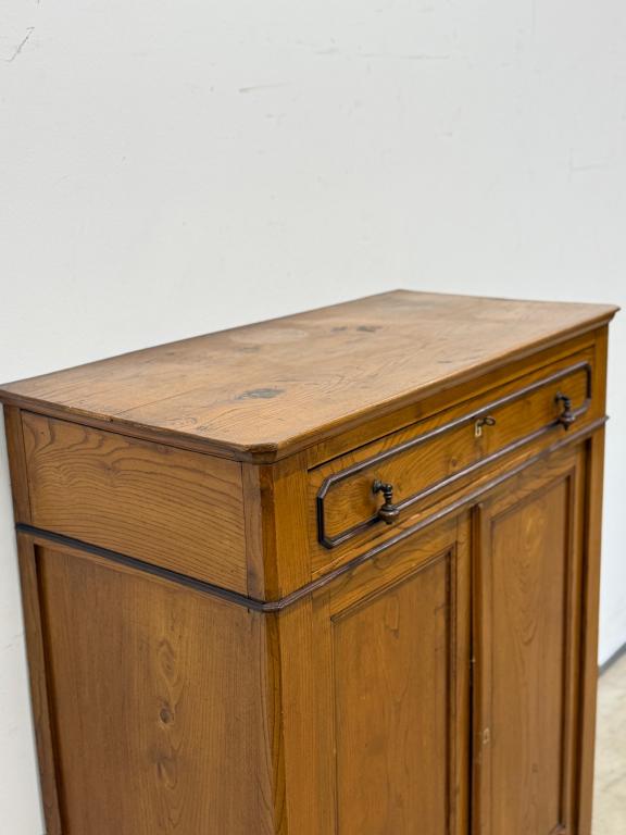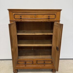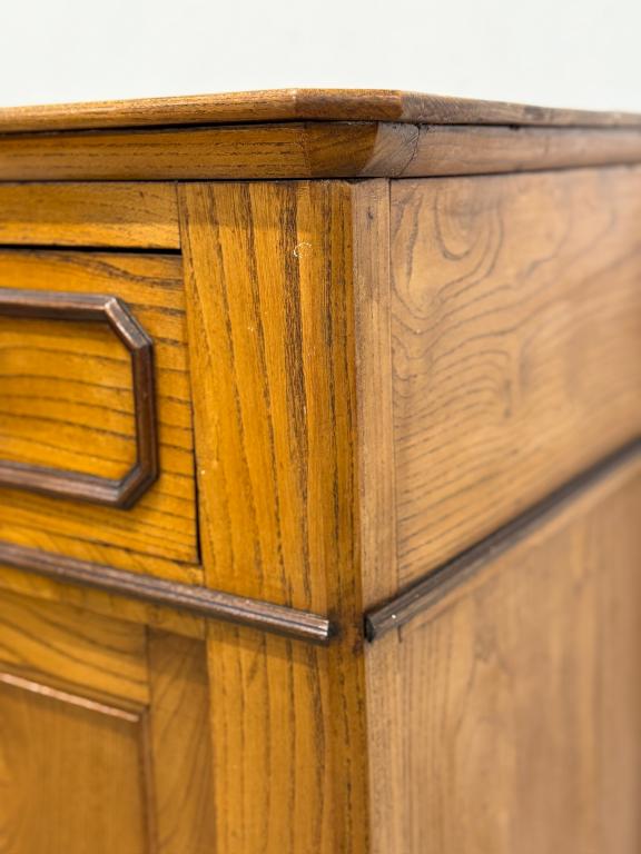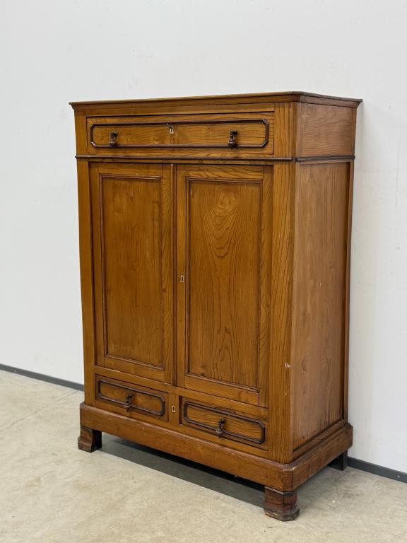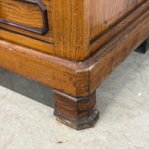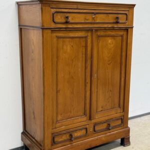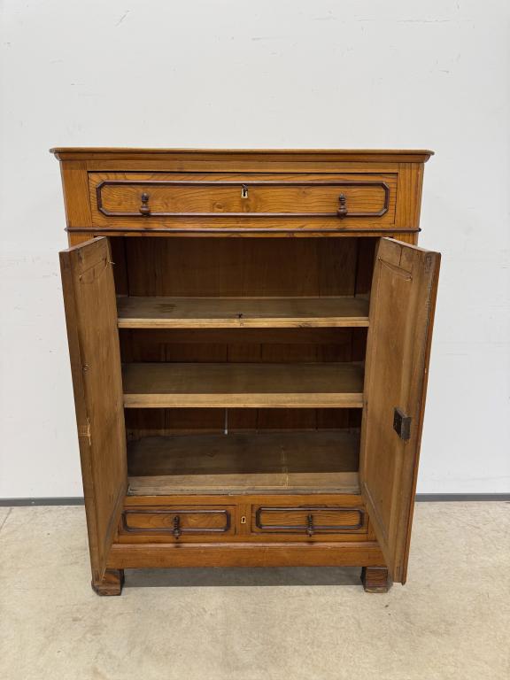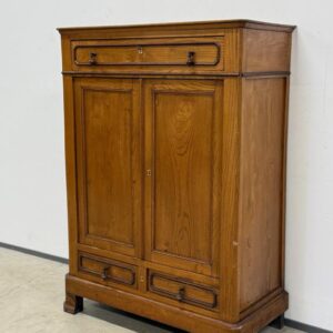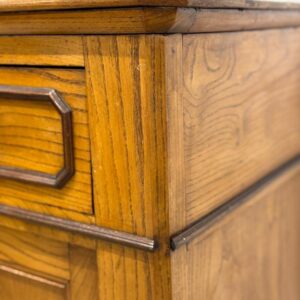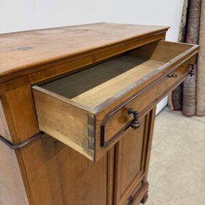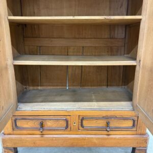 Seest riiulitega vana talukapp. üleval lai sahtel, all kaks väiksemat sahtlit. Leidub kulumis- ja kasutusjälgi, kuivamisragusid. Transport ühes osas.