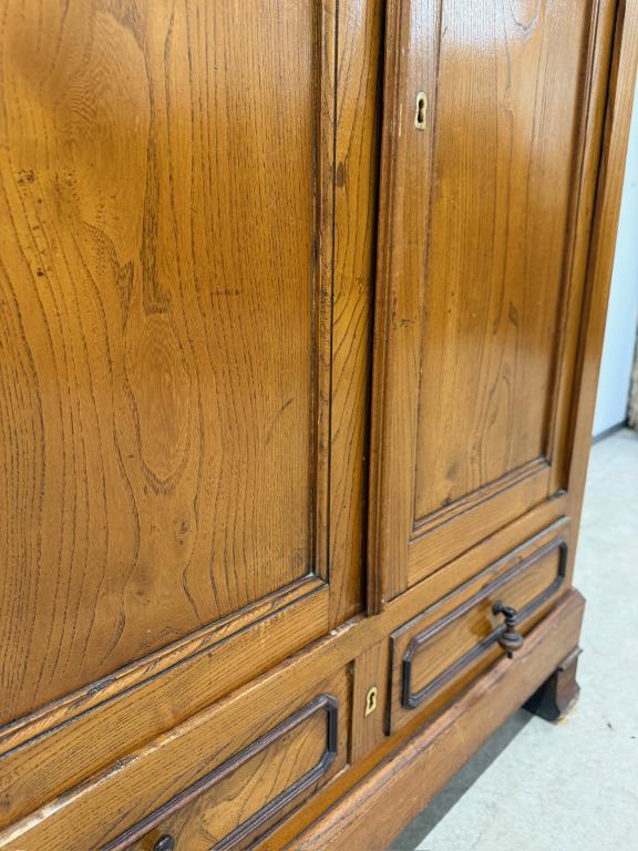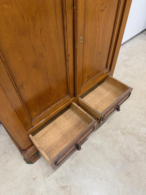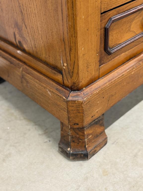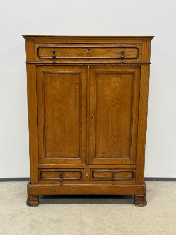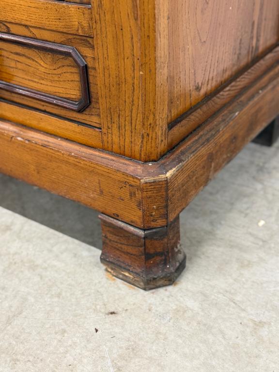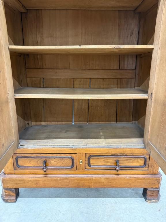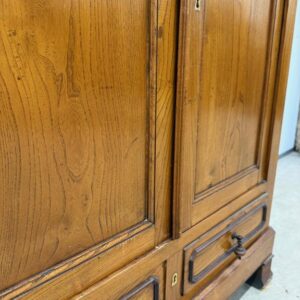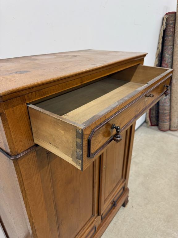 Seest riiulitega vana talukapp. üleval lai sahtel, all kaks väiksemat sahtlit. Leidub kulumis- ja kasutusjälgi, kuivamisragusid. Transport ühes osas.