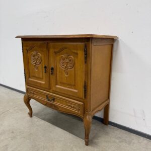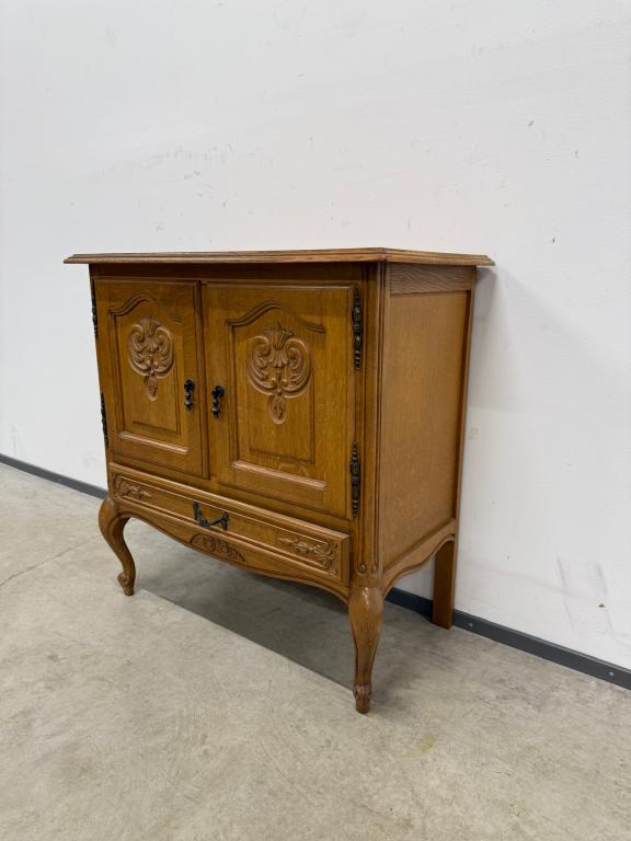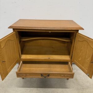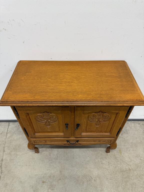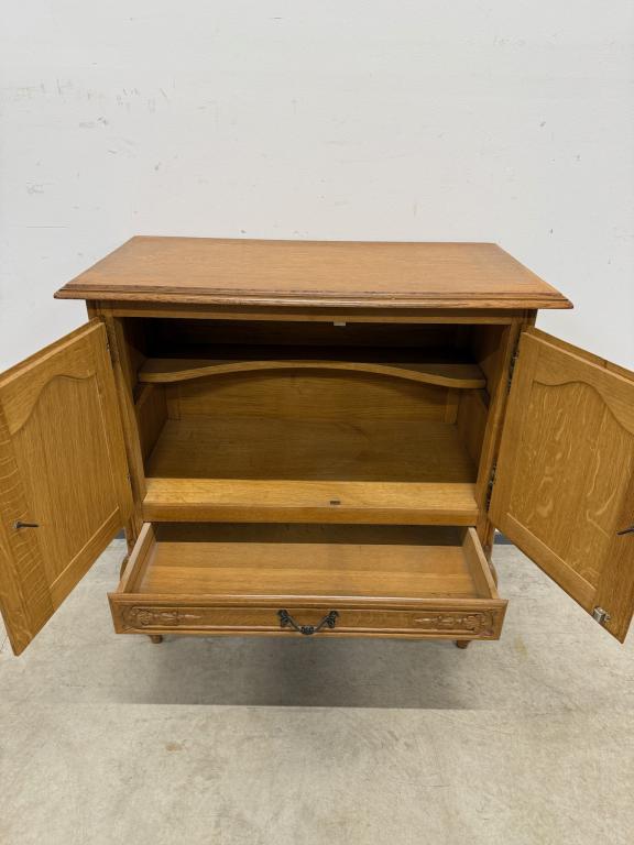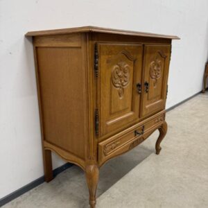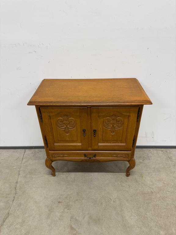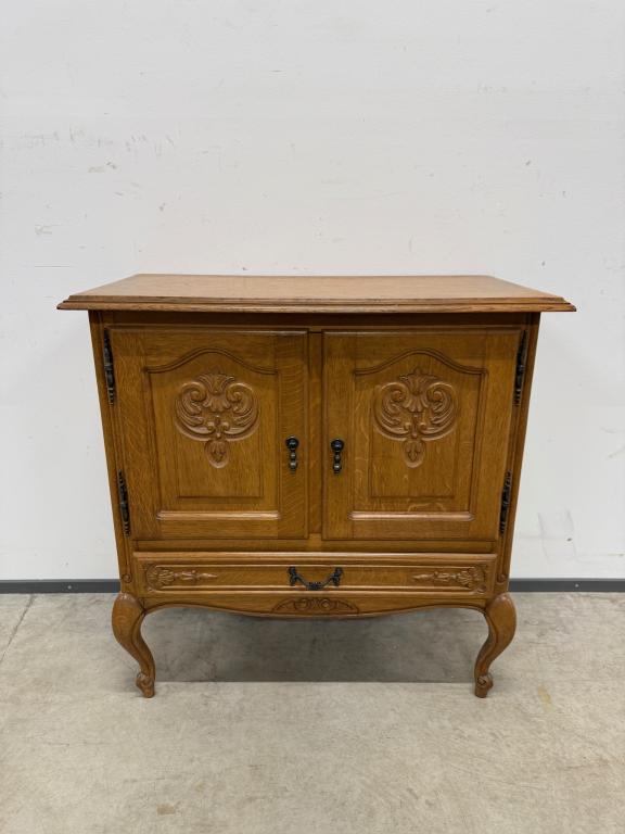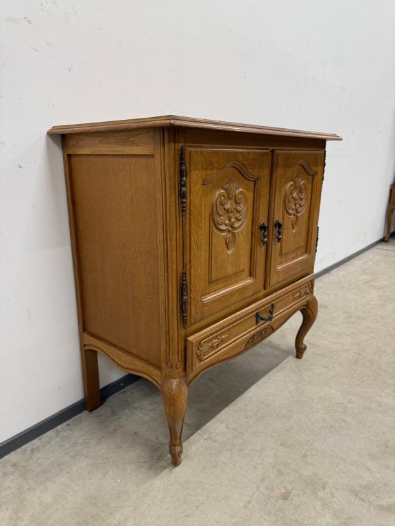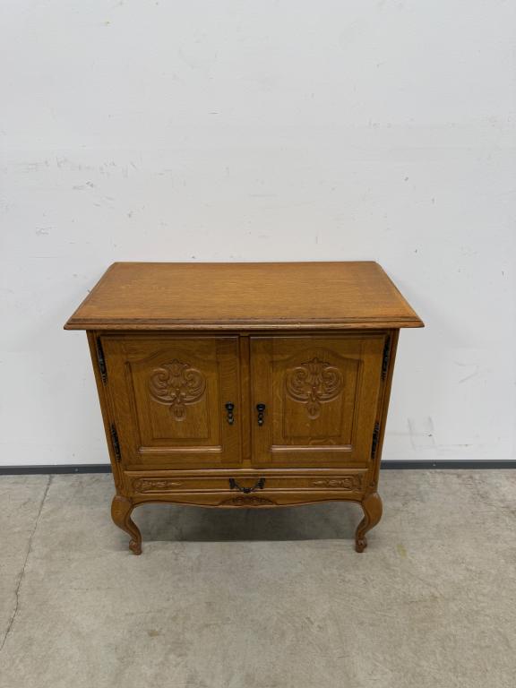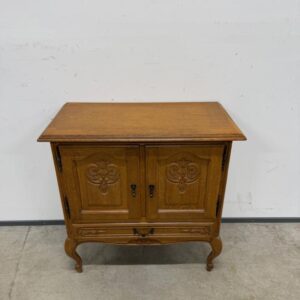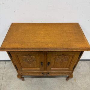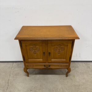Tammest raamiga kahe ukse ning sahtliga kapp. Kenad nikerdused ustel. Leidub väiksemiad kulumis- ja kasutusjälgi, kuid üldmulje väga hea.