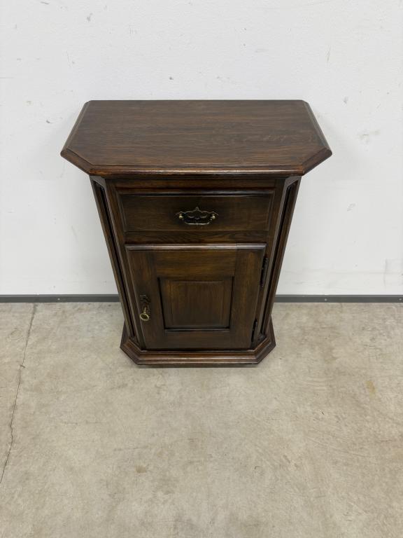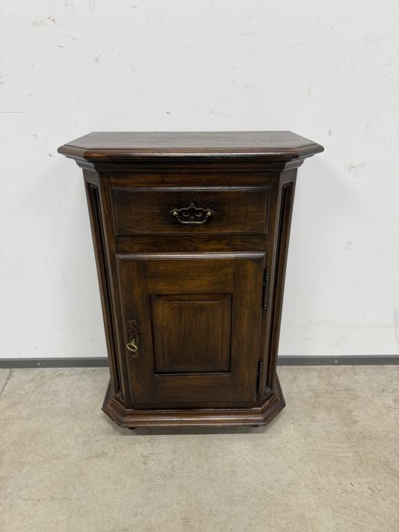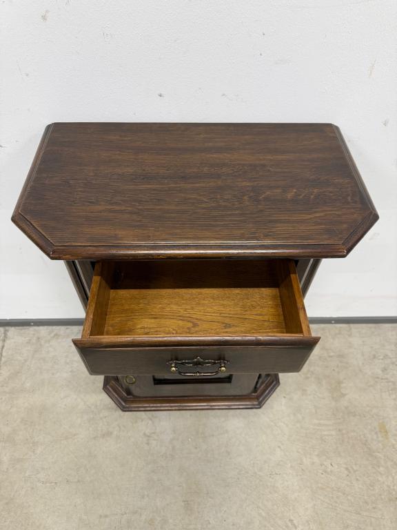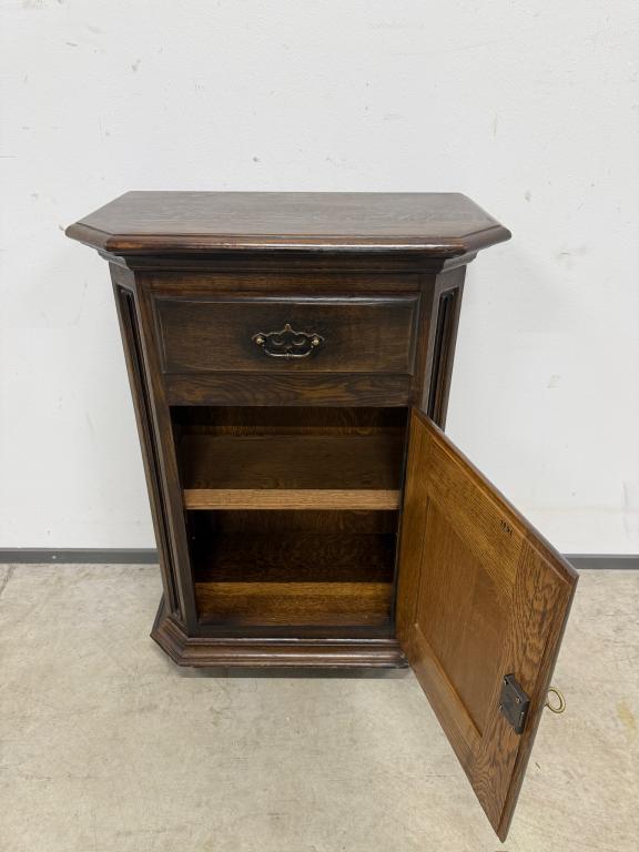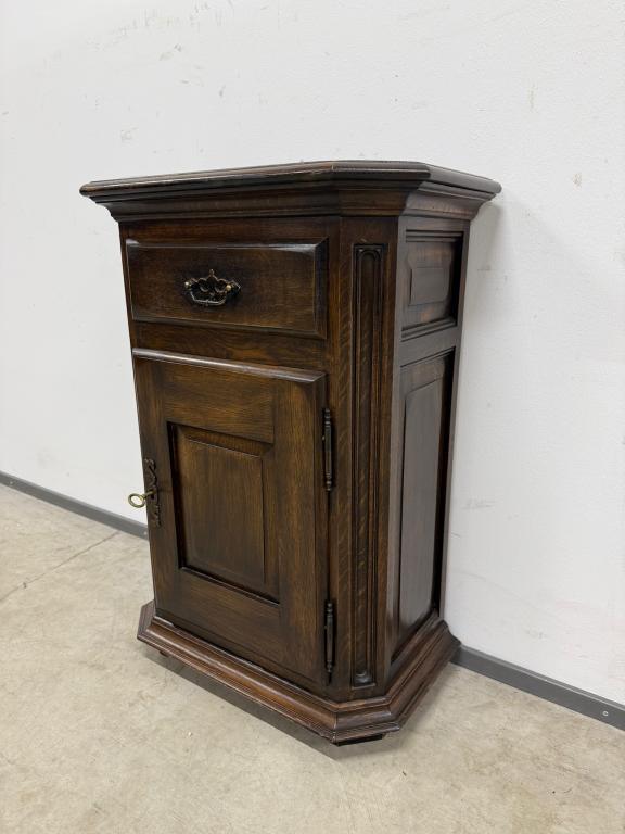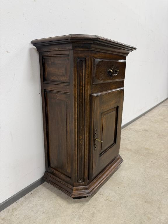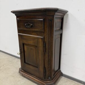 Tumepuuni peitsiga üleni tammest kapp. Lukk töökorras, võti olemas. Väga heas seisukorras.