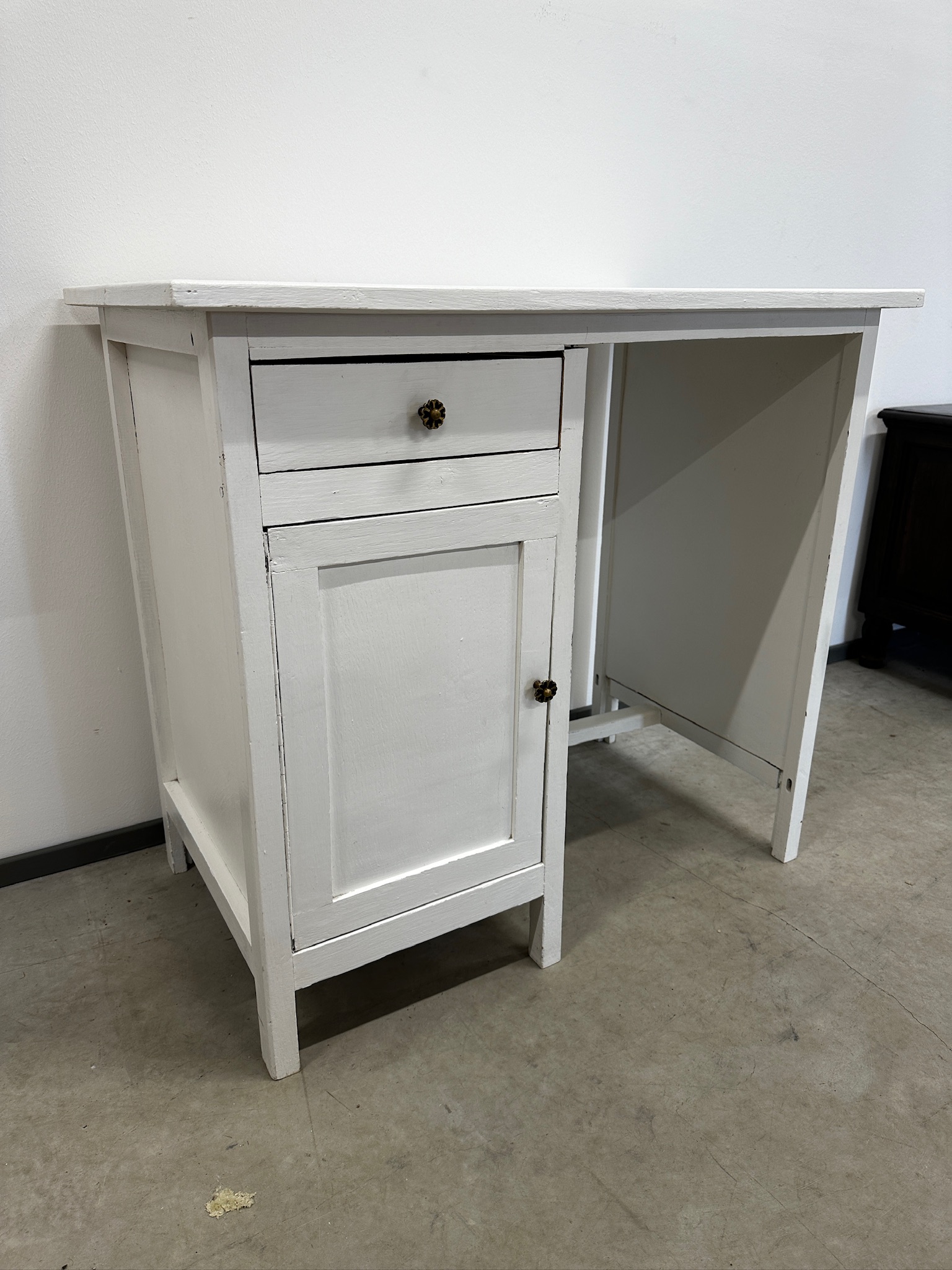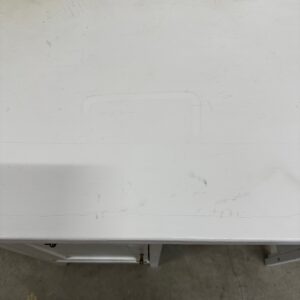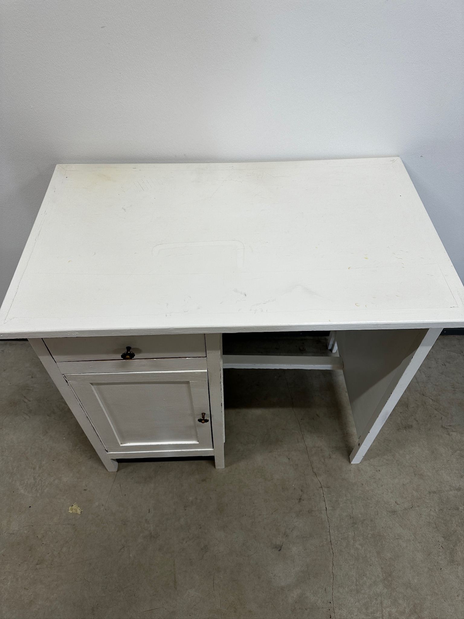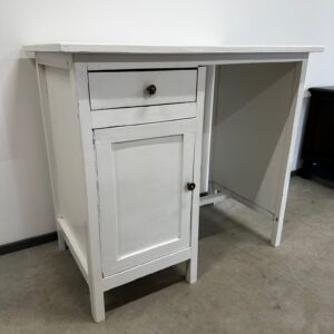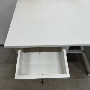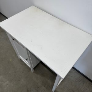 Väike valgeks värvitud kirjutuslaud. Laud on puidust raamiga. Pealmine plaat raami soonte sees, ei ole kinnitatud ei liimi ega naeltega. Leidub kulumis- ja kasutusjälgi.