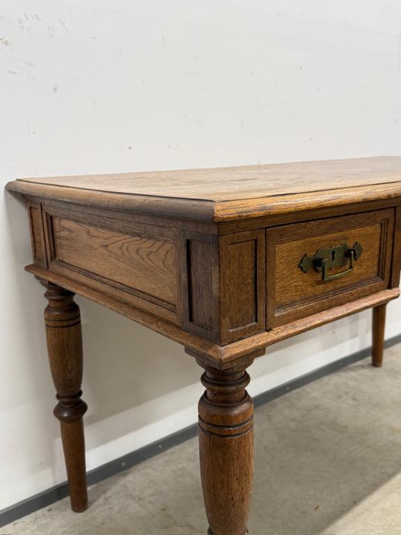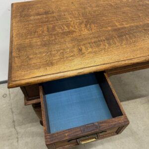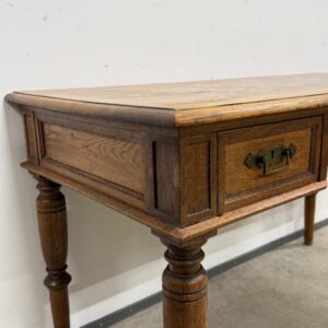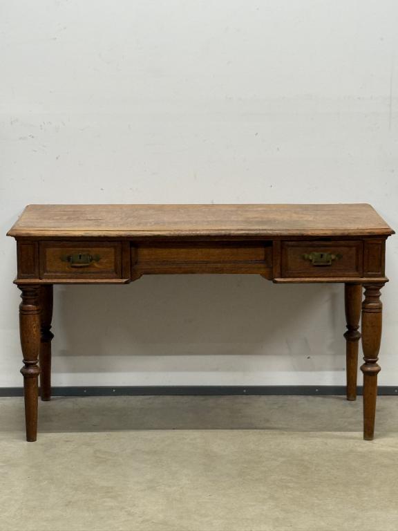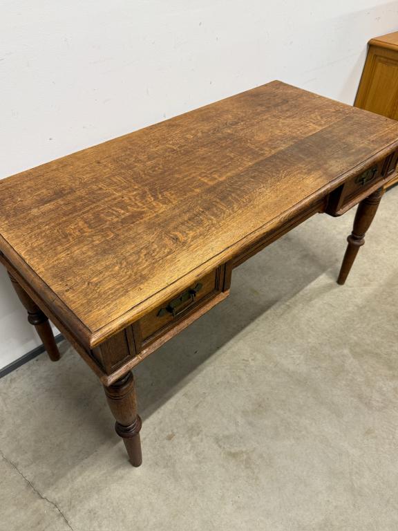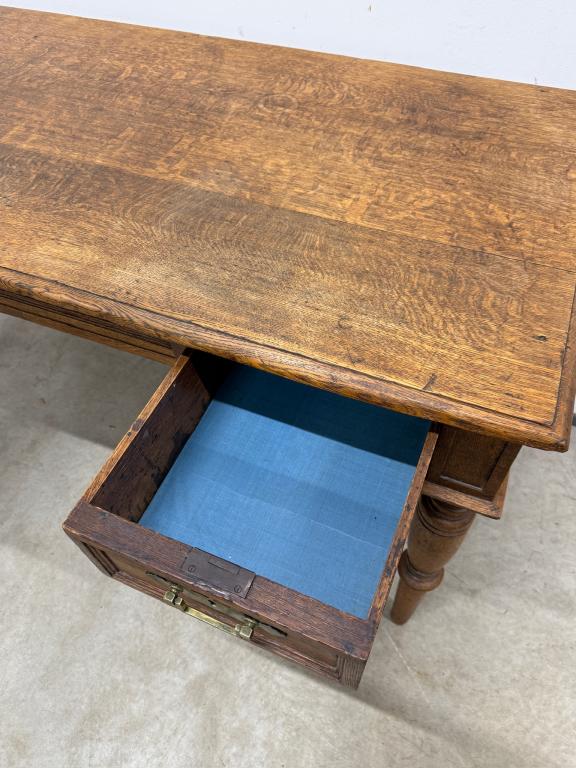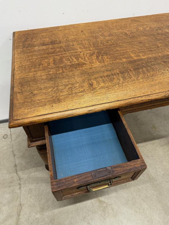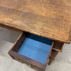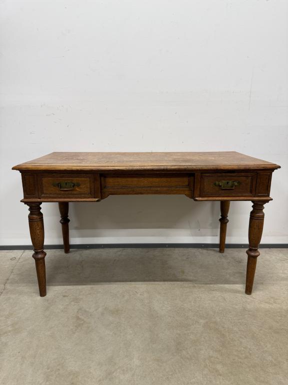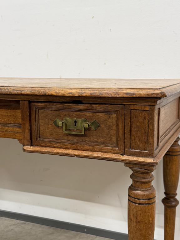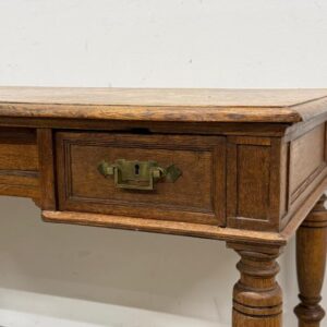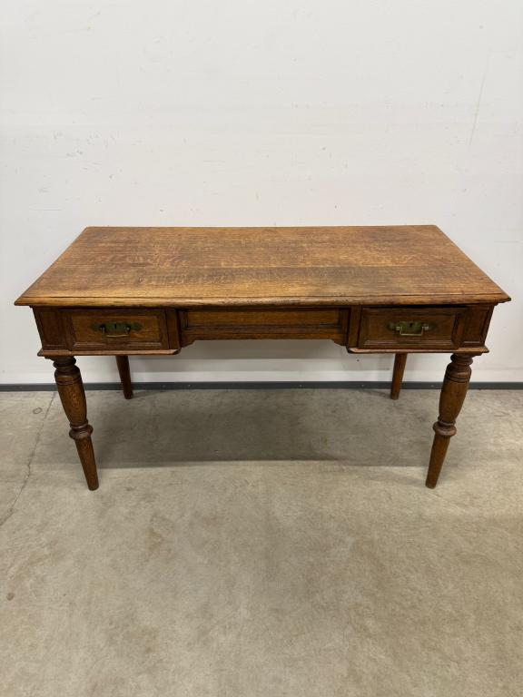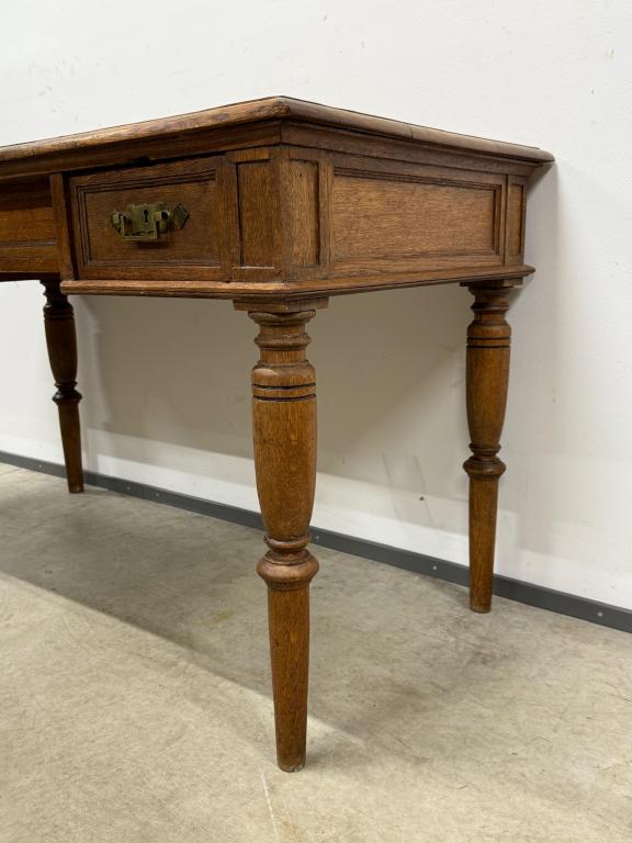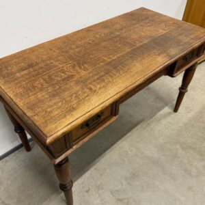 Väga hea suurusega sajandivanune tammest kirjutuslaud. Olemas kaks mahukat sahtlit. Tööpind piisavalt suur, kõrguselt mugav kasutada ka pikemal inimesel. Leidub kulumis- ja kasutusjälgi, kuid üldmulje korralik. Transport ühes osas.