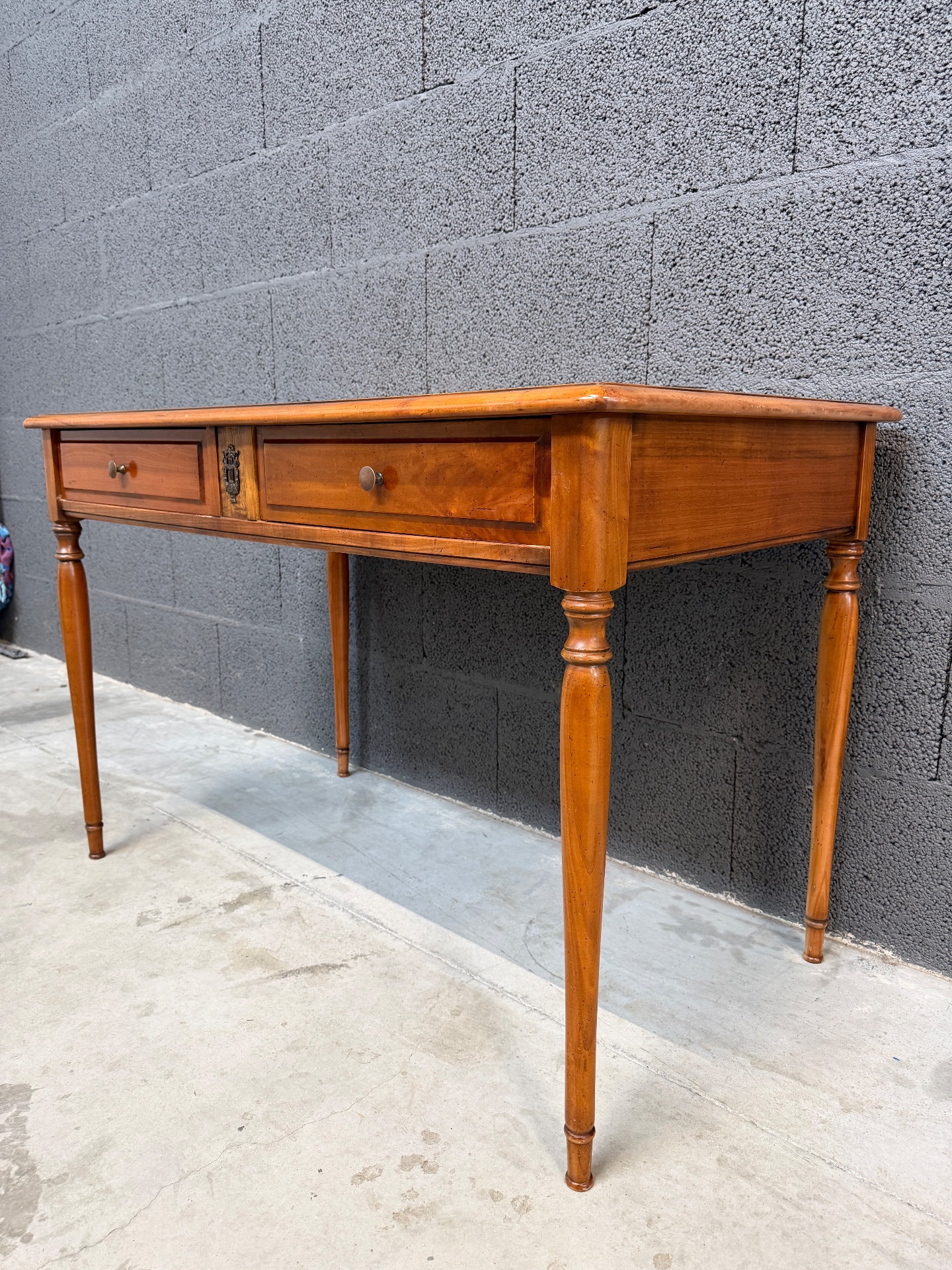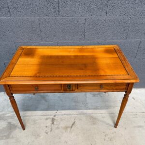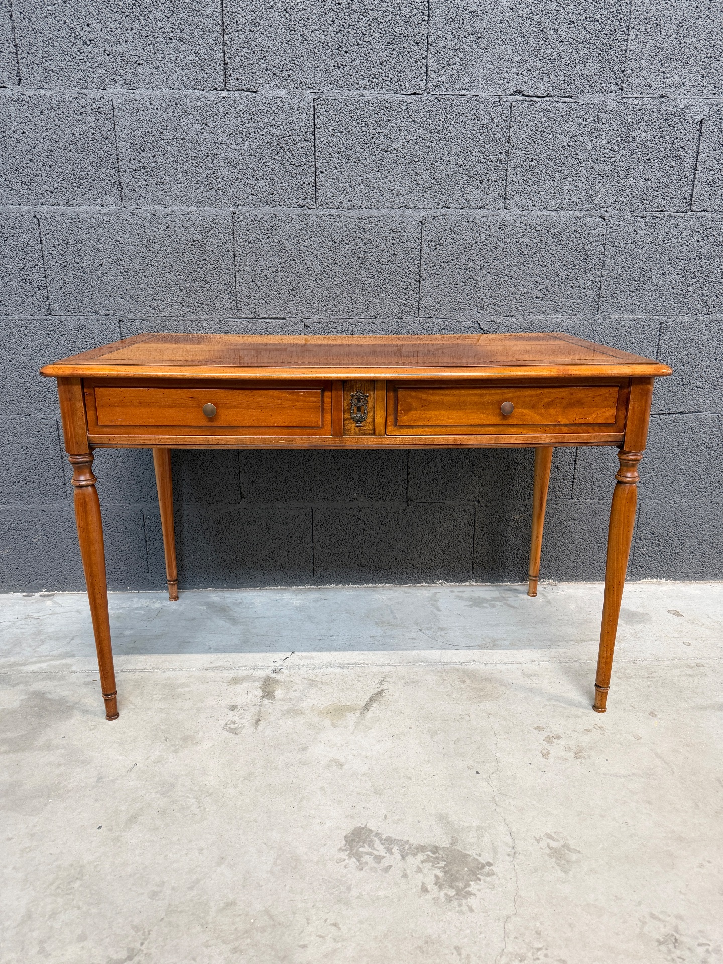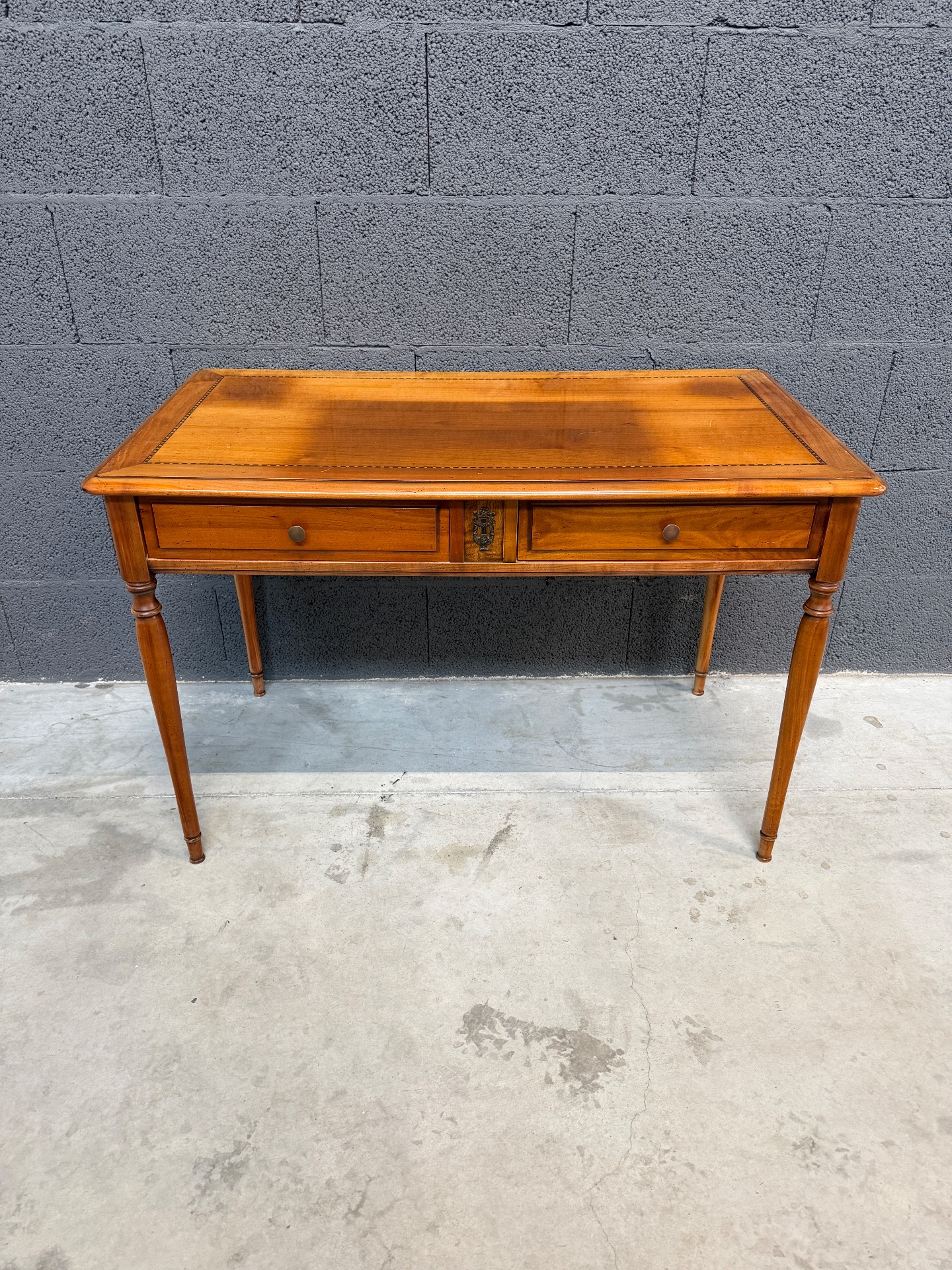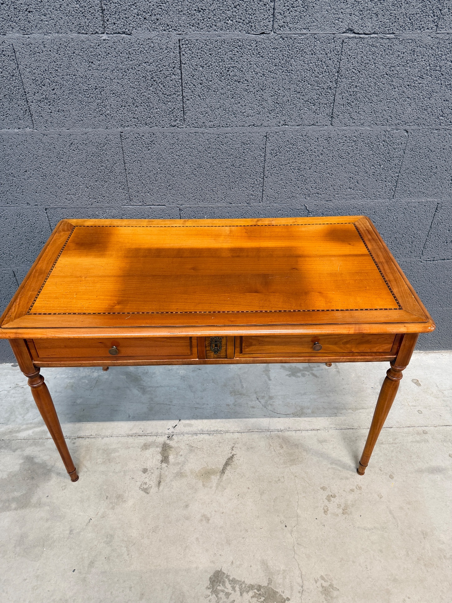 Hea suurusega kahe sahtliga kirjutuslaud. Pleekimisjäljed vasakul küljel ning pealmisel plaadil. Ilus ja vaadeldav ka tagant.
