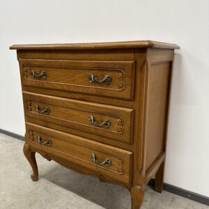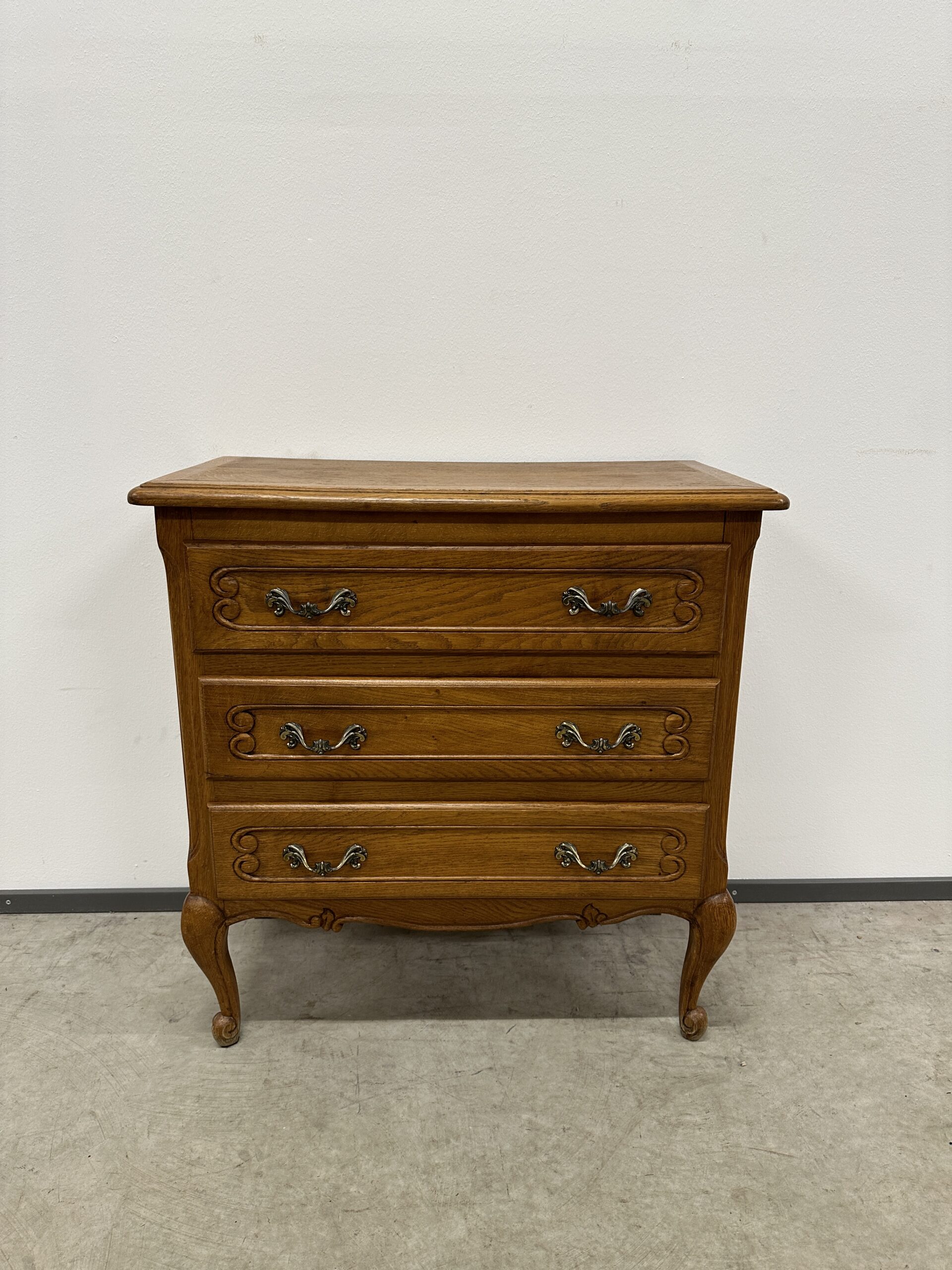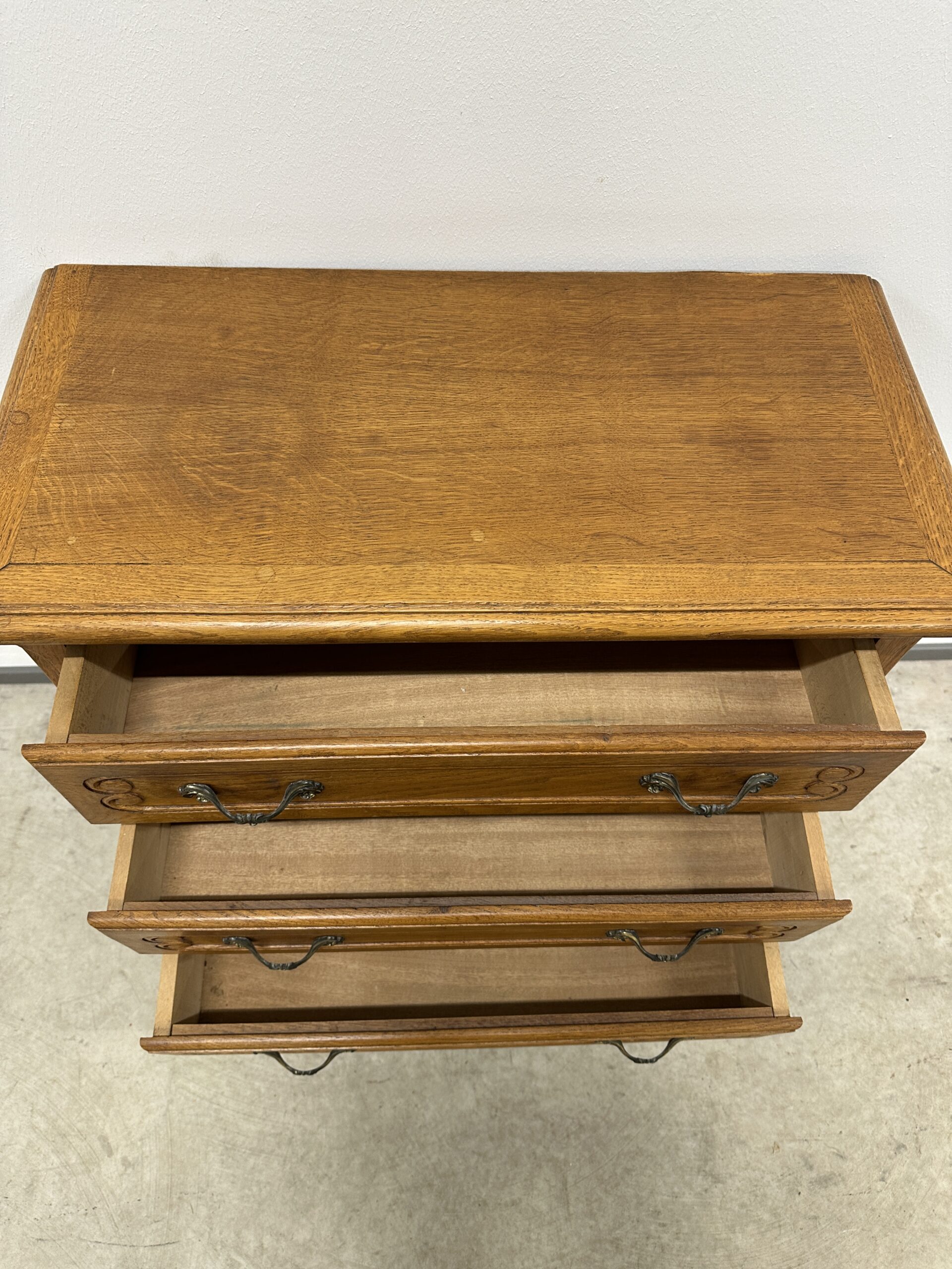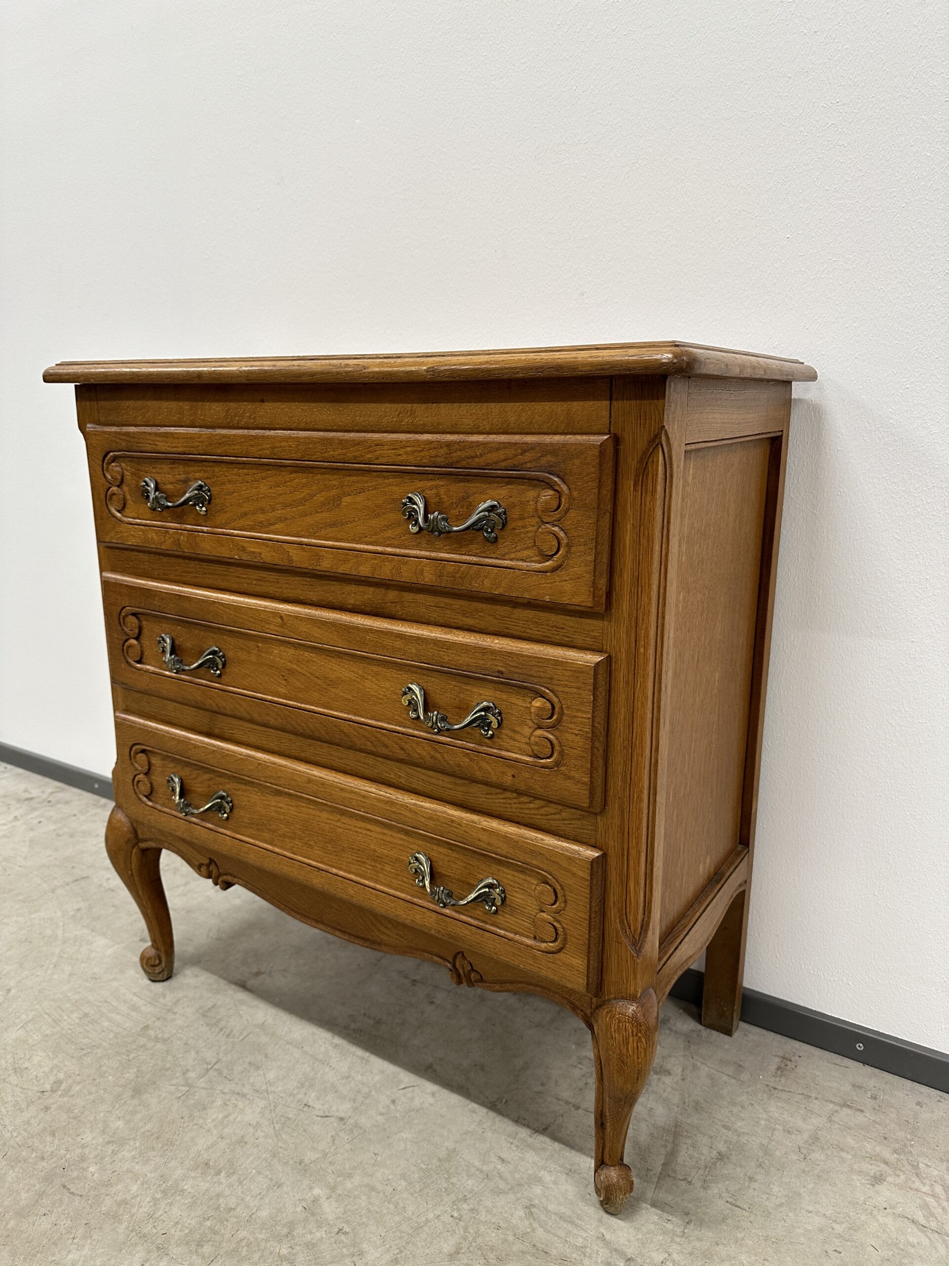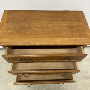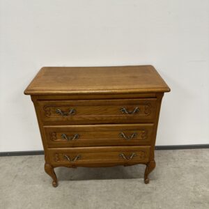 Tammest raamiga kolme sahtliga kummut. Sügavusel väike, sobib ka kitsasse ruumi. Leidub väiksemaid kulumis- ja kasutusjälgi, kuid üldmulje korralik.