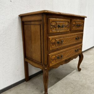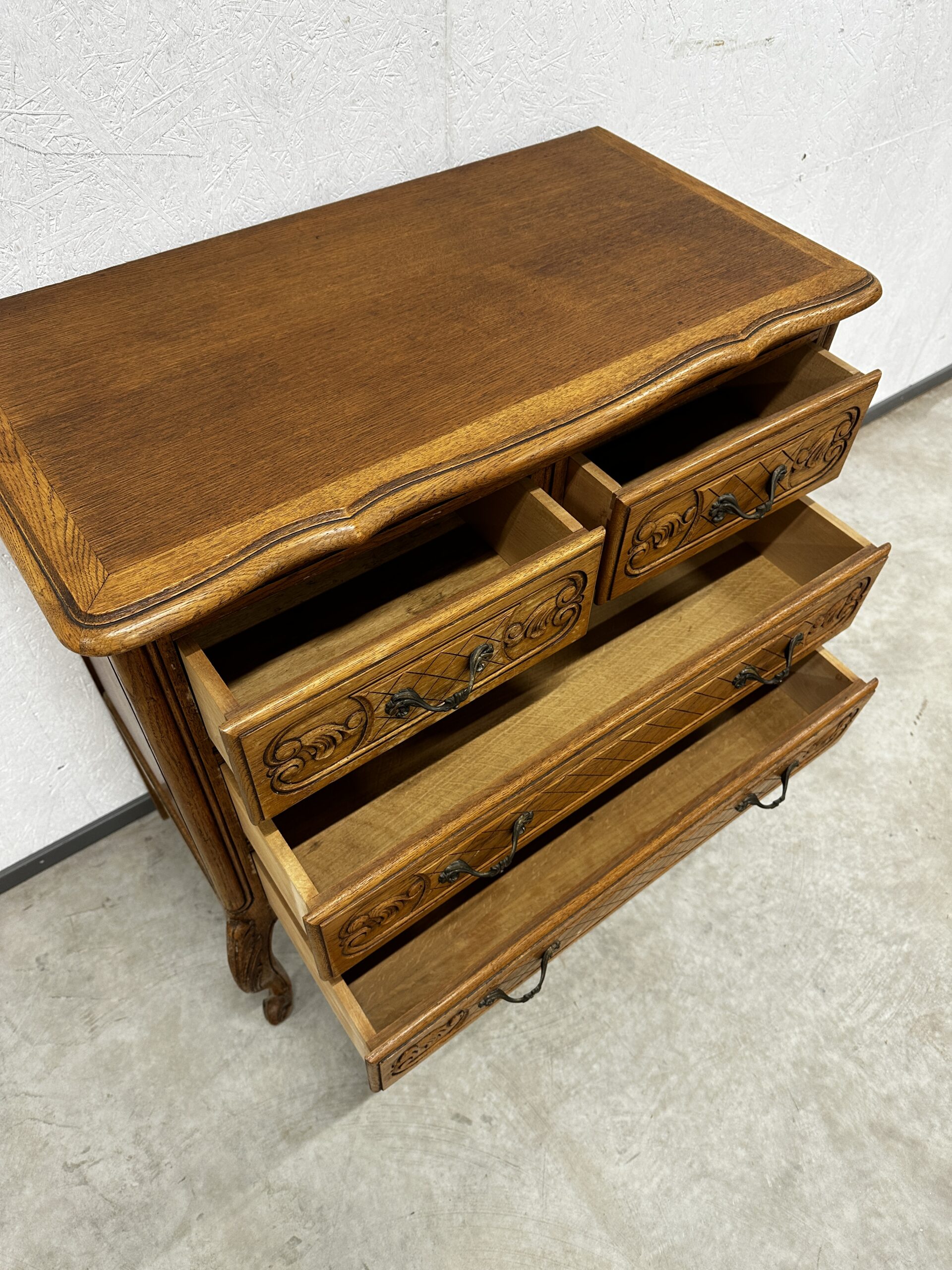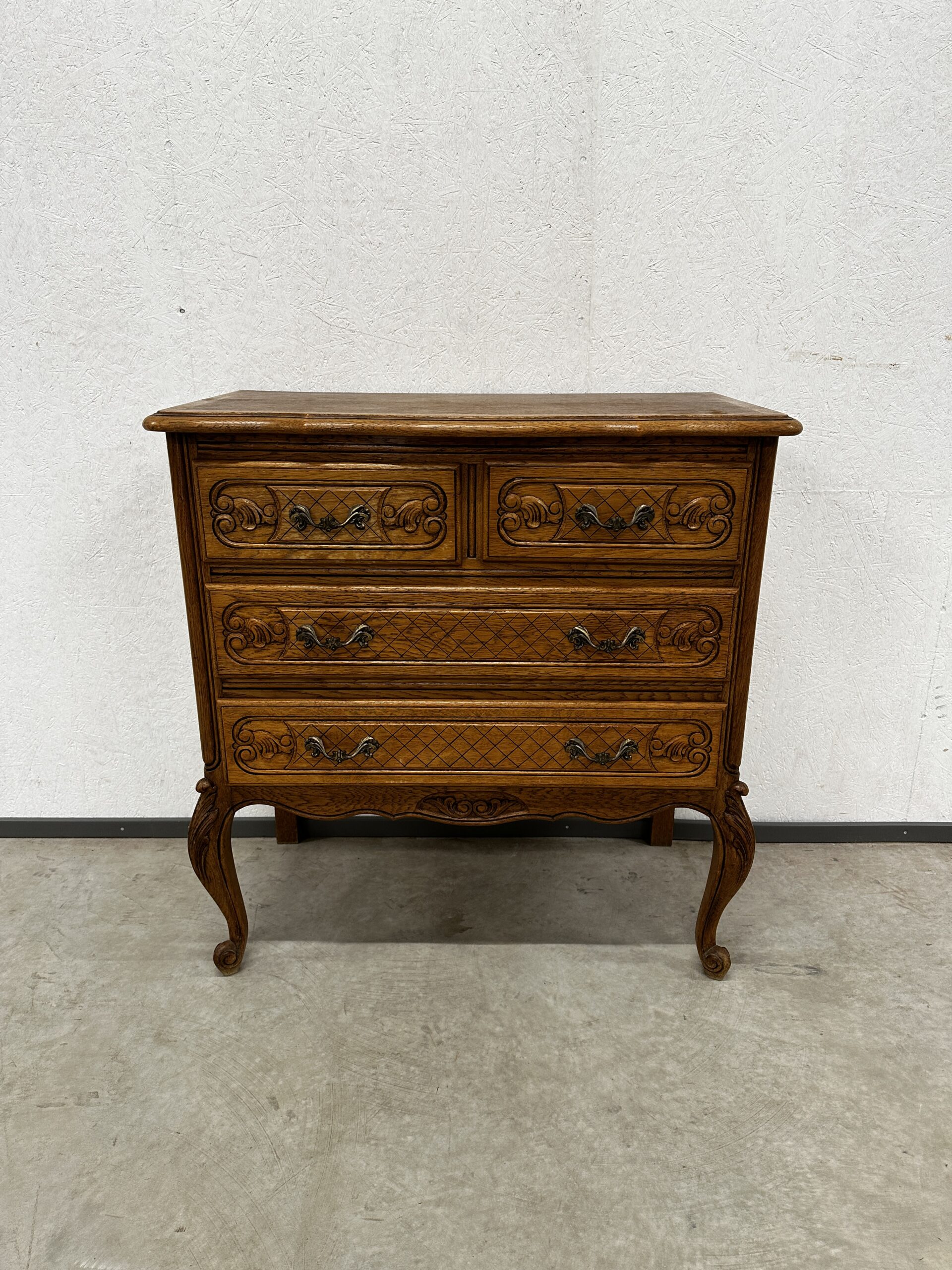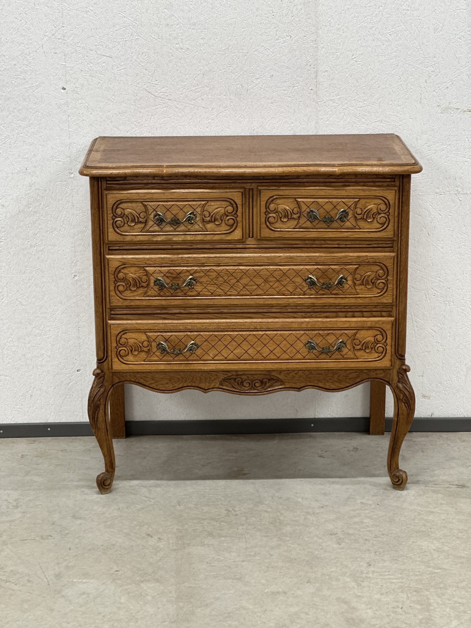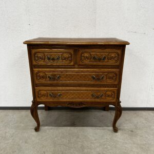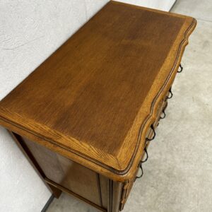 Kahe suure ning kahe väikse sahtliga tammest raamiga kummut. Kaunid nikerdused sahtlipaneelidel ja raamil. Pealmisel plaadil mõned kulumis- ja kasutusjäljed.