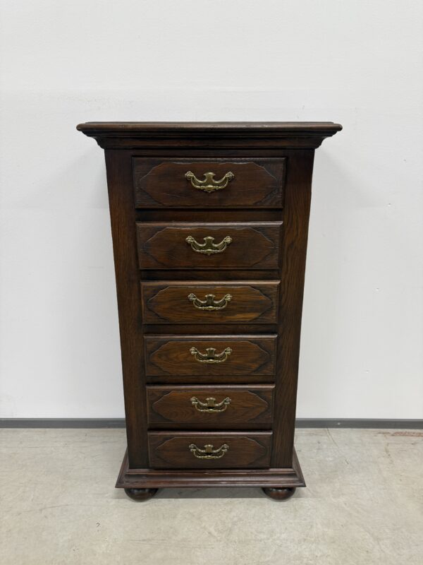 Üleni tammest kõrge sahtlitega kummut. Väga heas seisukorras.