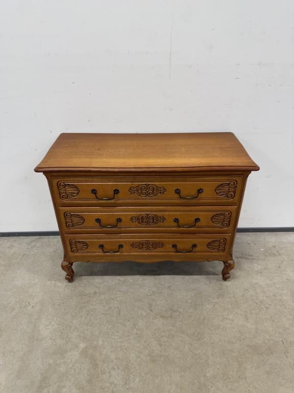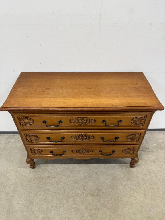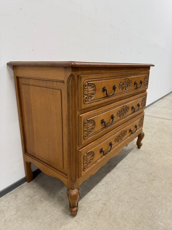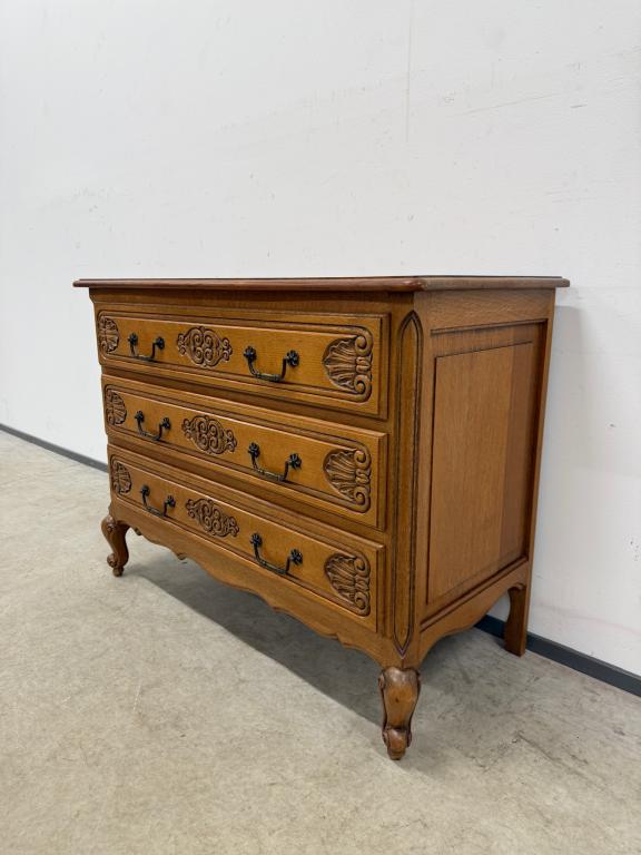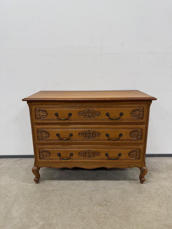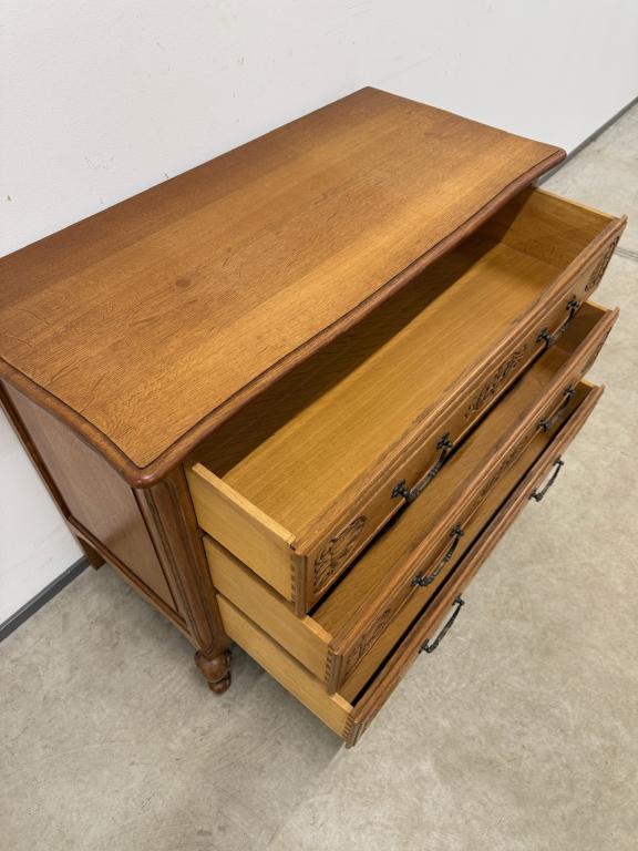Kolme sügava sahtliga tammest raamiga kummut. Kaunid nikerdused sahtlipaneelidel ja raamil. Sahtlid liiguvad kergesti. Väga heas seisukorras.
