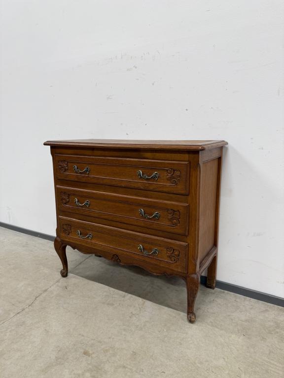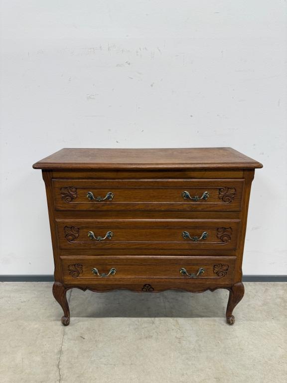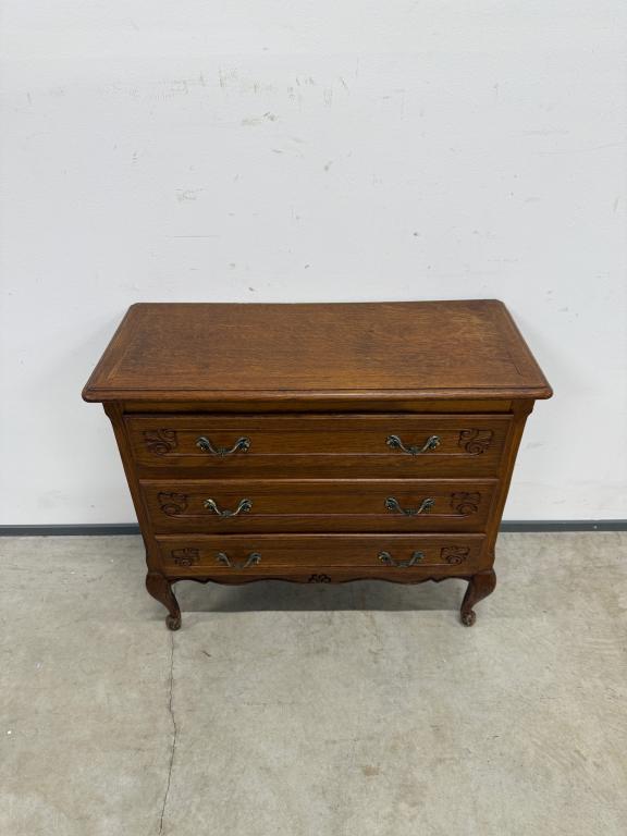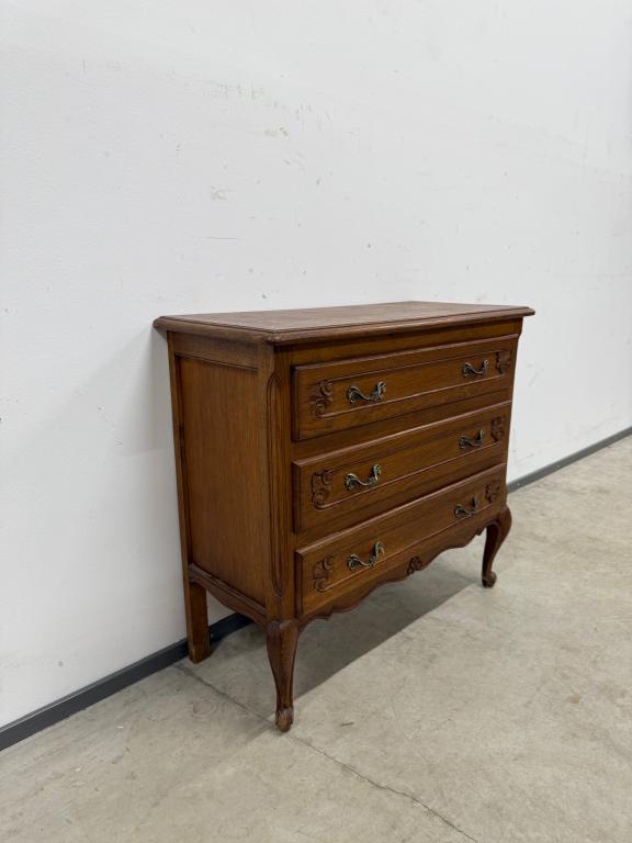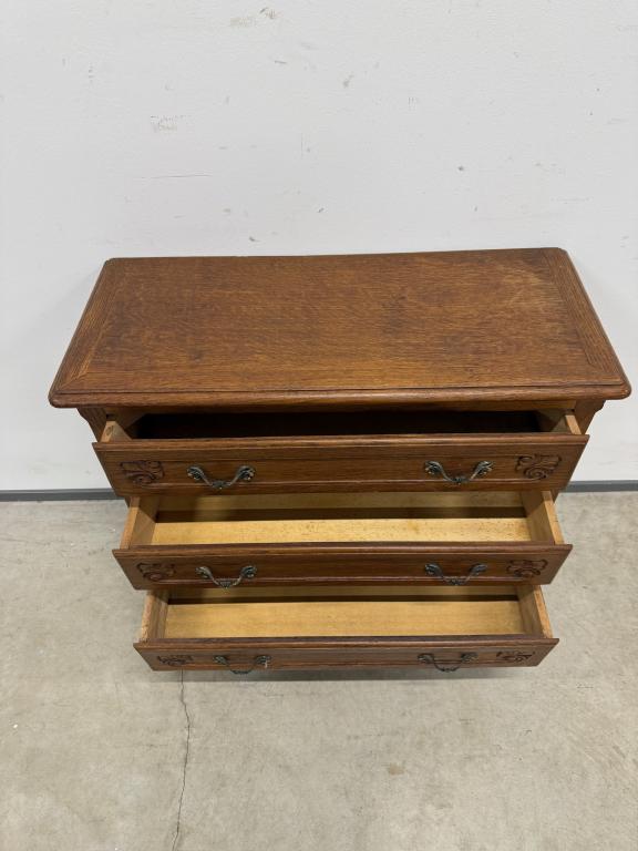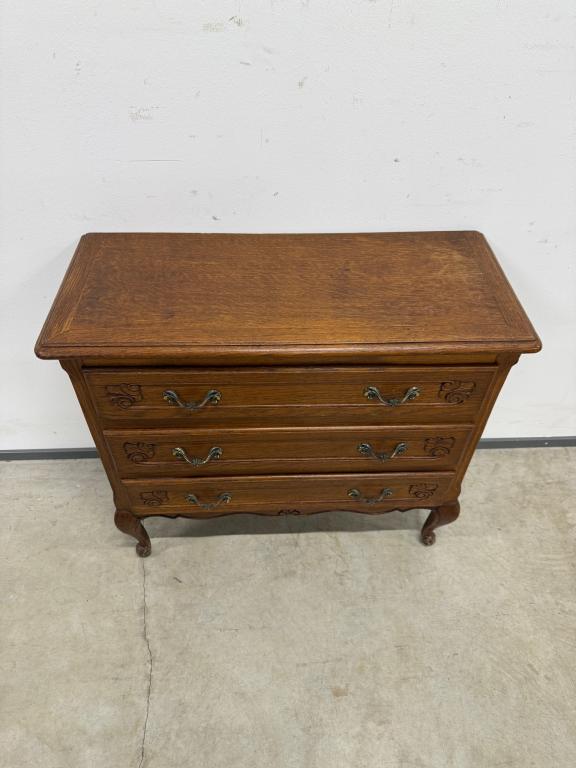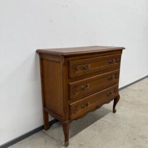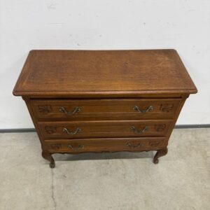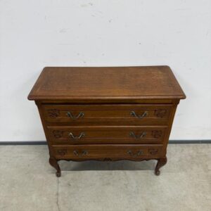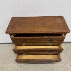 Tammest raamiga kolme sahtliga kummut. Sügavuselt väike. Leidub kulumis- ja kasutusjälgi.
