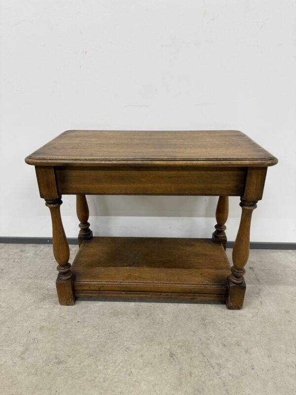 Üleni tammest väikese sahtliga laud. Leidub kulumis- ja kasutusjälgi, ideaalis vajaks viimistlus värskendamist.