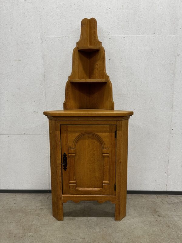 Heledast tammest väike nurgakapp. Kapi kõrgus 93 cm, riiul 79 cm. Nurga külgede laius 50 cm, eestvaates laius 71 cm. Lukk töökorras, võti olemas. Suurepärases seisukorras. Transport kahes osas.