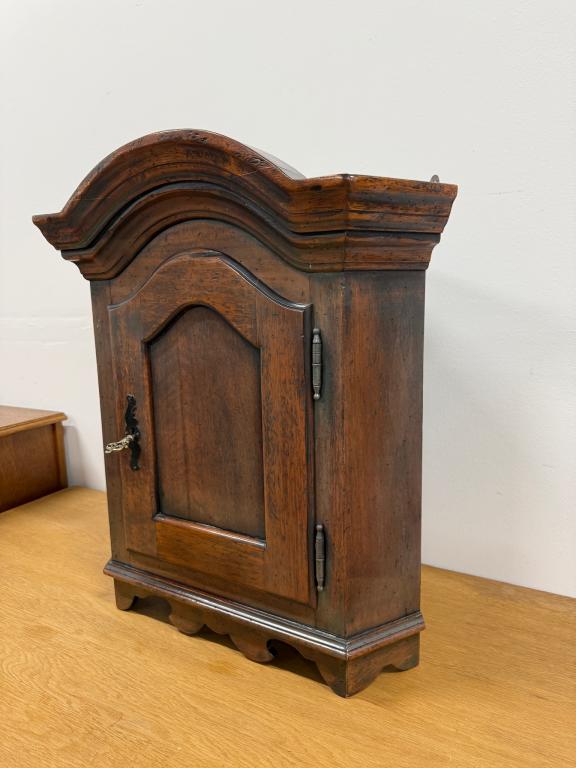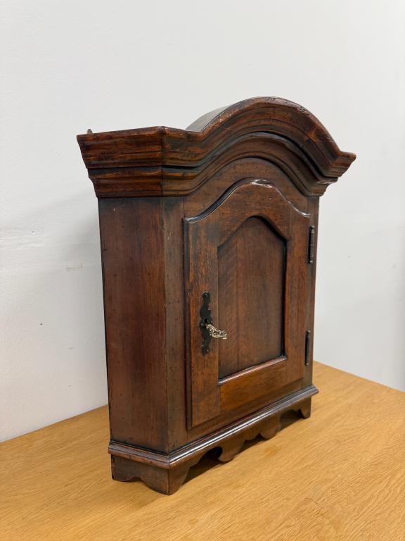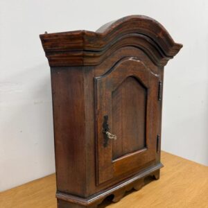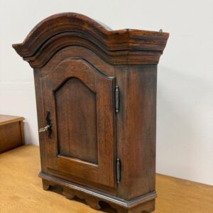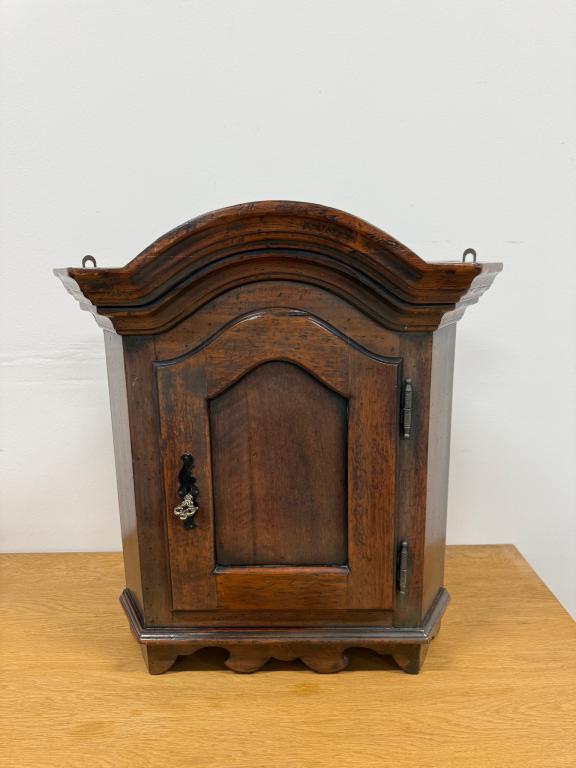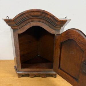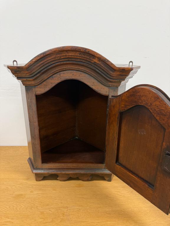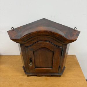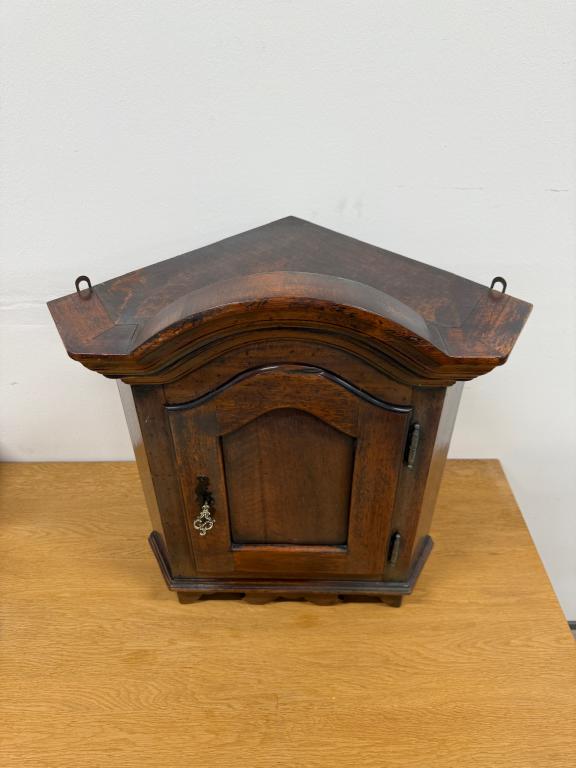 Väike seinale kinnitatav nurgakapp. Nurga külgede laius 42 cm, eestvaates laius 59 cm, sügavus 41 cm. Lukk töökorras, võti olemas.
