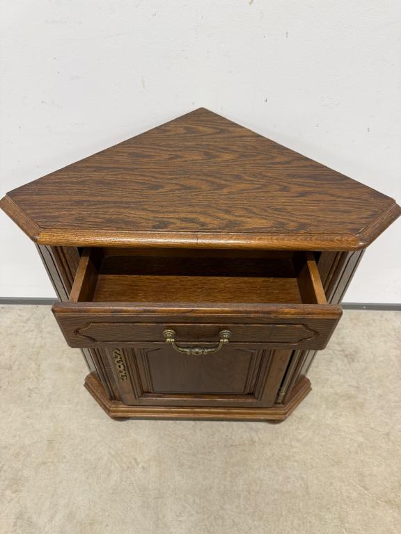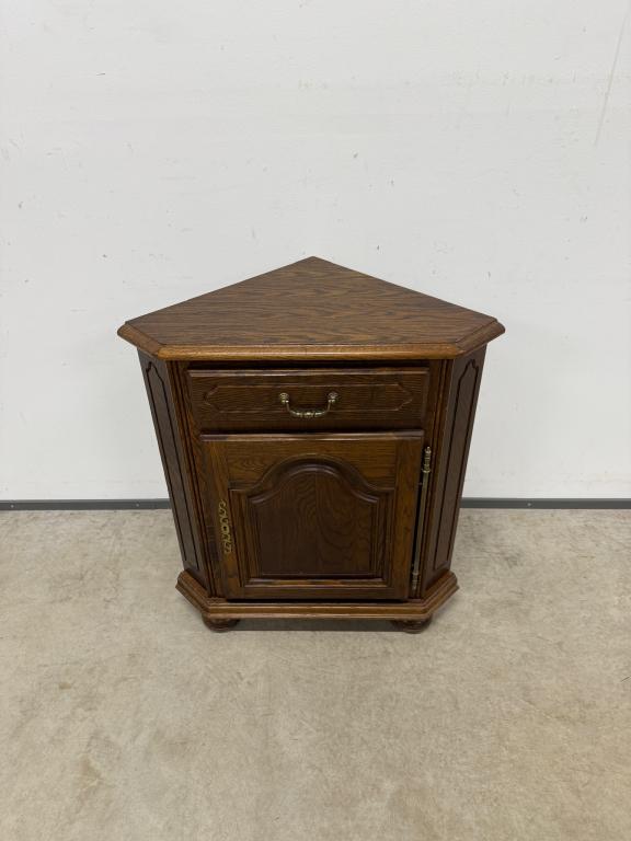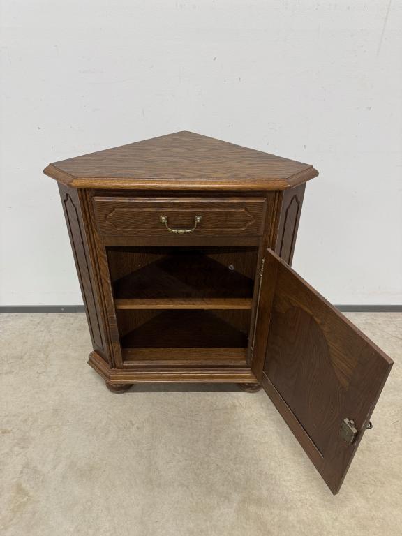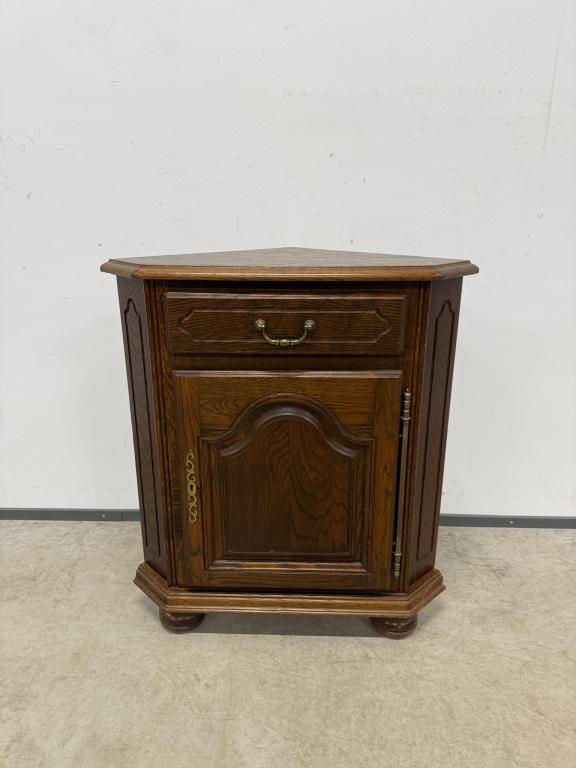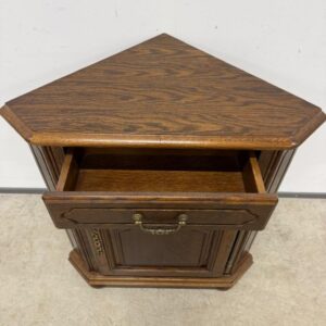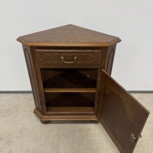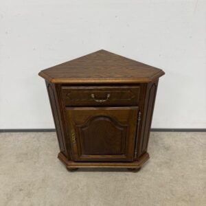Uuema ajastu puidust raamiga nurgakapp. Külgede laius 54 cm, eestvaates laius 76 cm, sügavus 49 cm. Lukk töökorras, võti olemas. Leidub väiksemaid kulumis- ja kasutusjälgi.