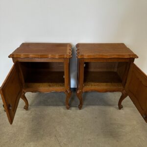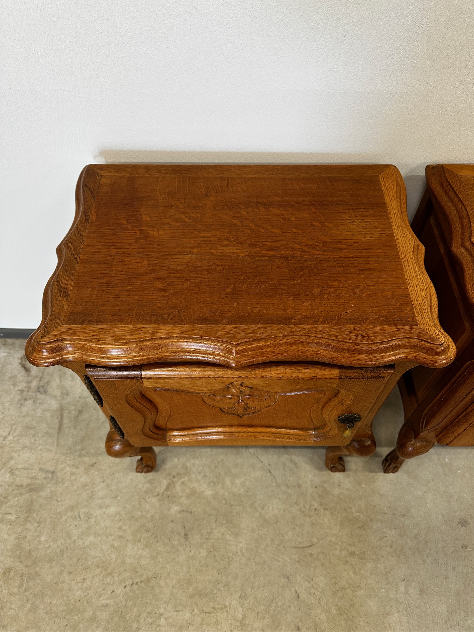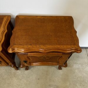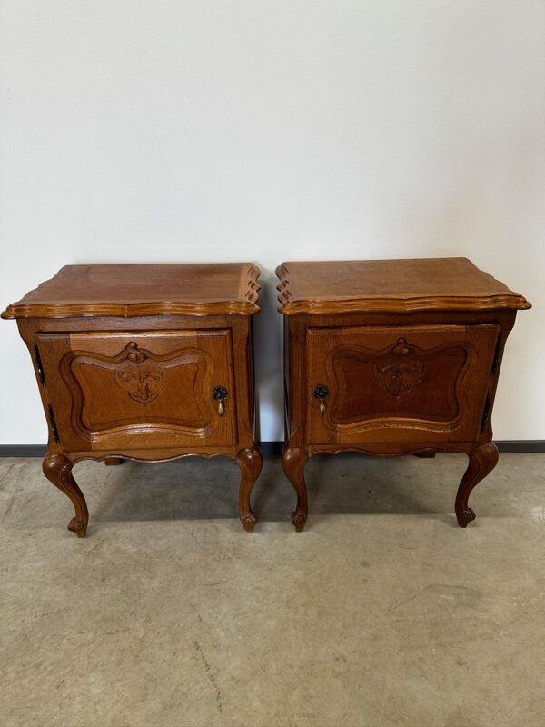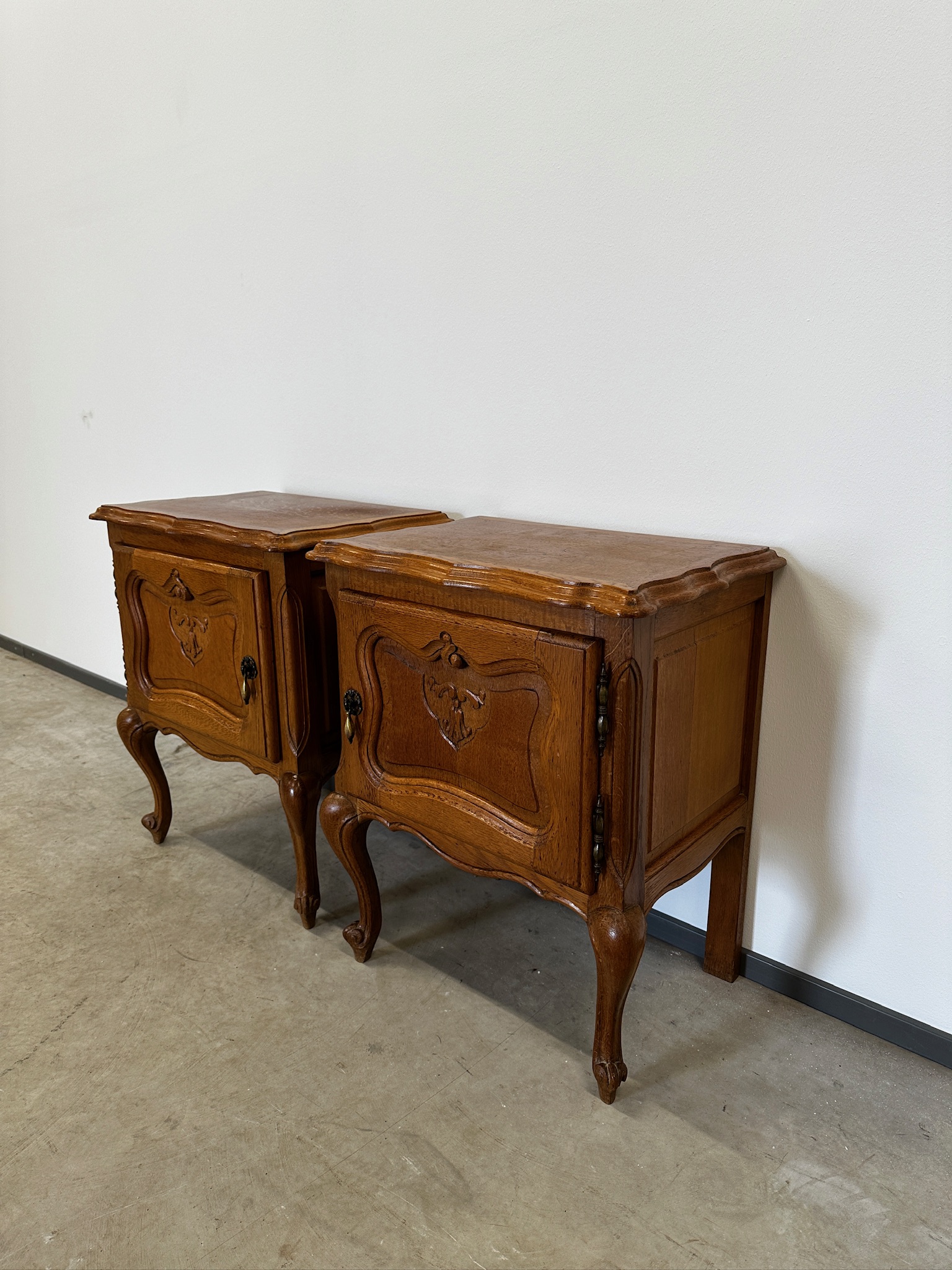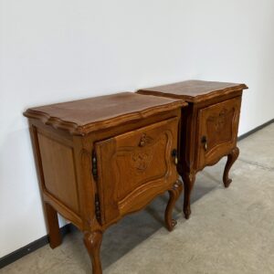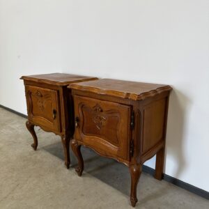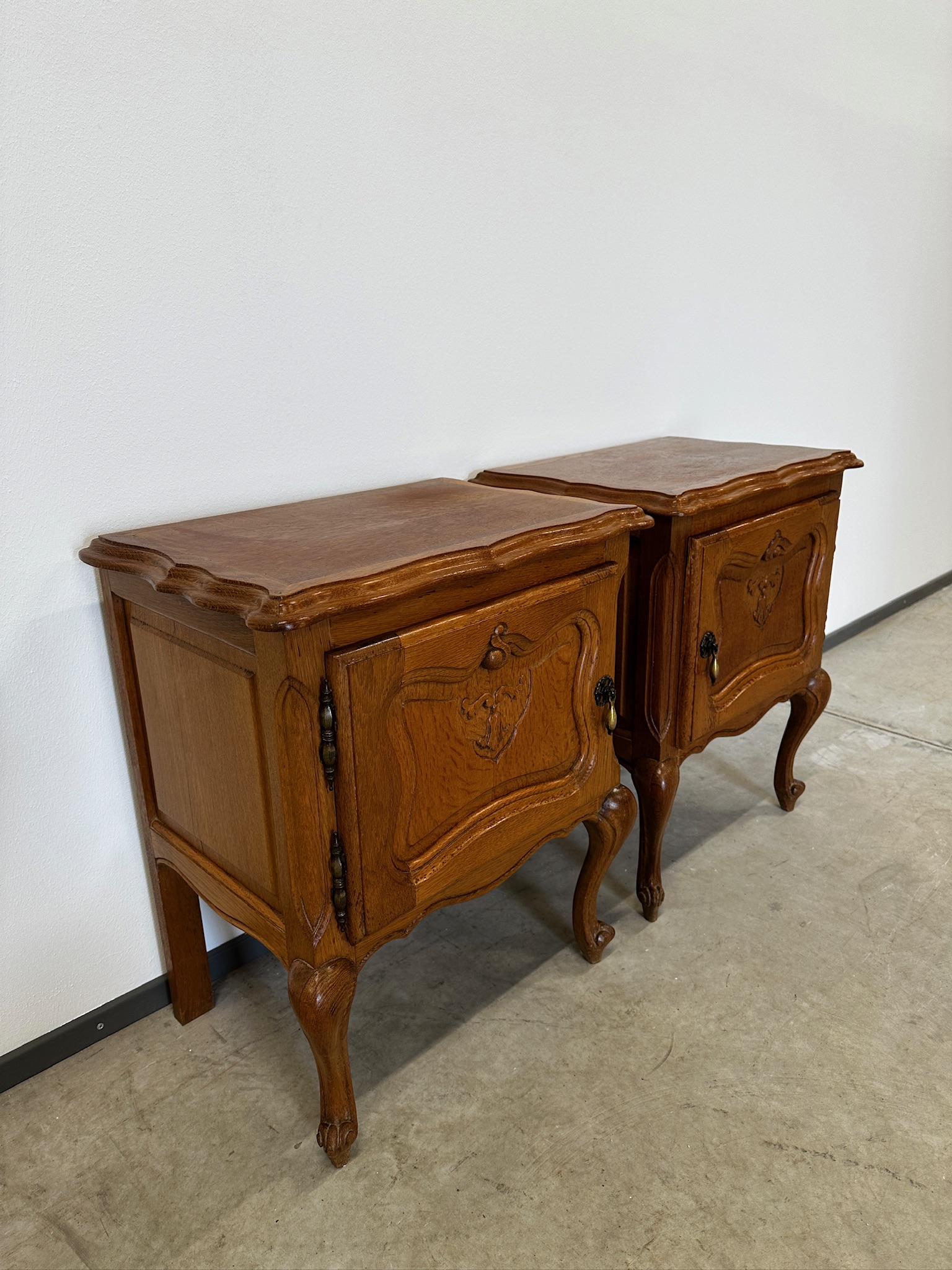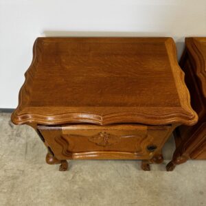 Kaks kena öökappi. Ilusad nikerdused uksel ja raamil. Kapid on tammest. Leidub väiksemaid kulumis- ja kasutusjälgi, kuid üldmulje väga hea. Müügil komplektina.