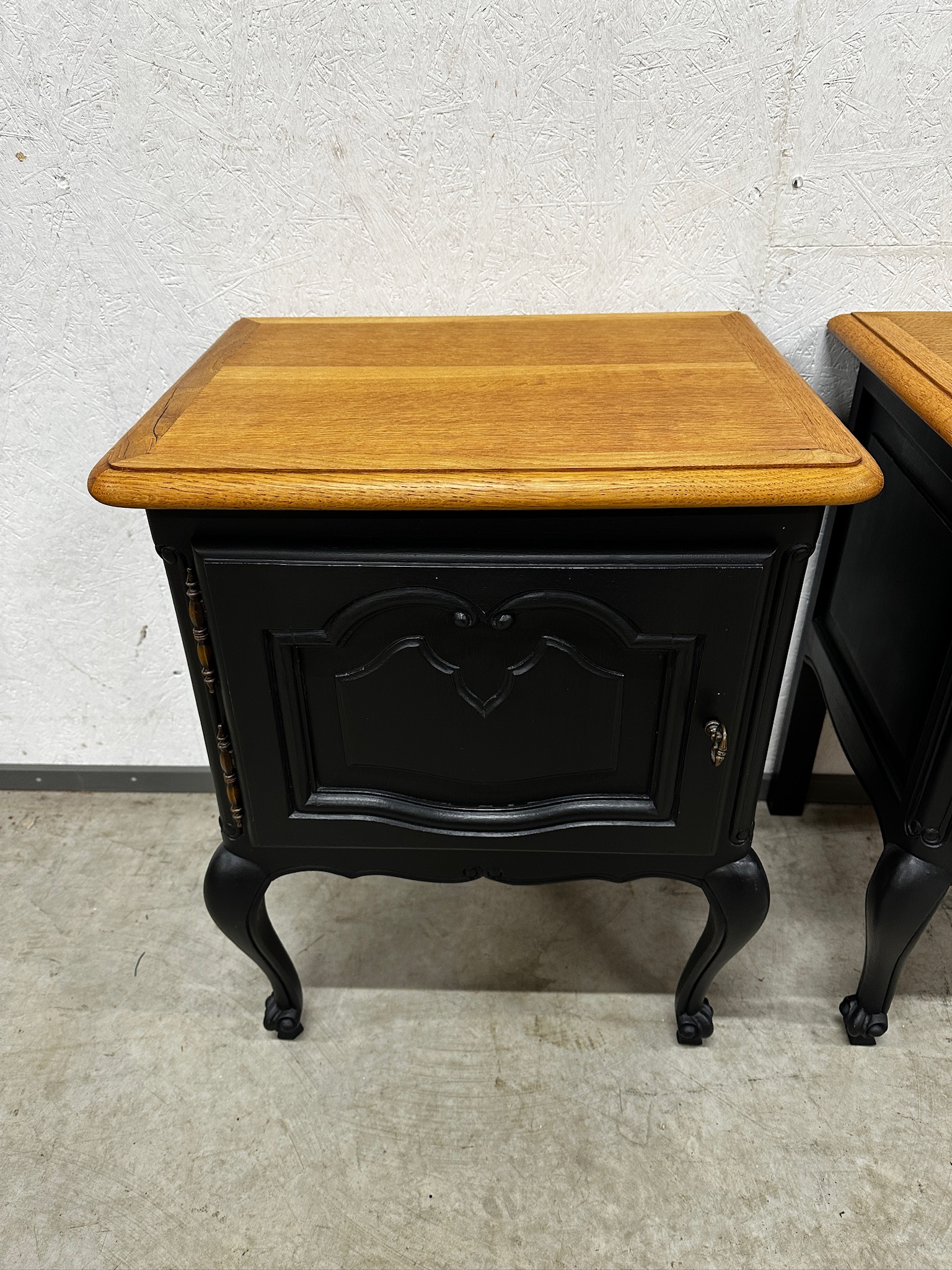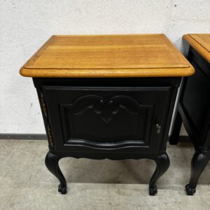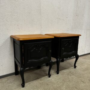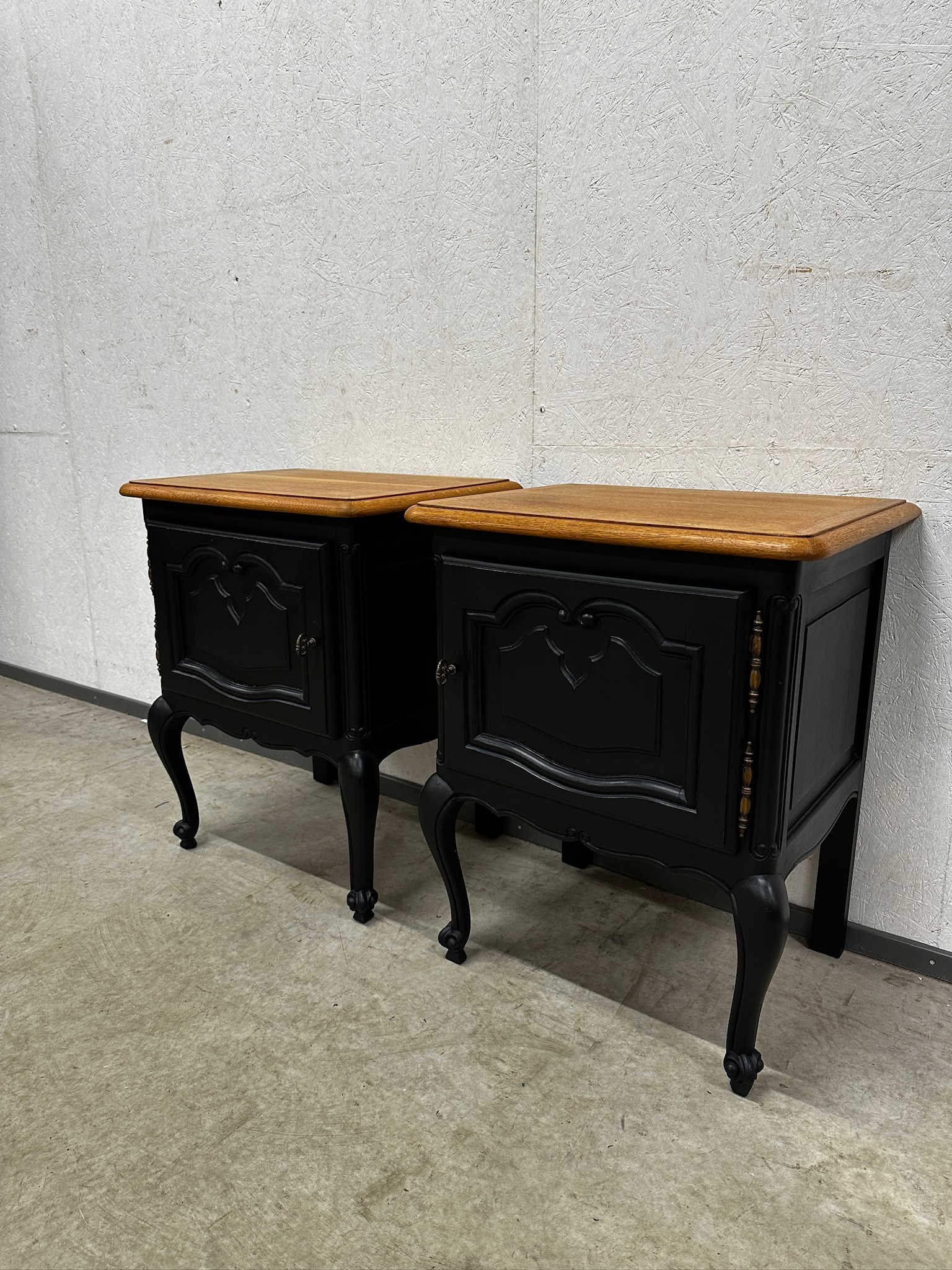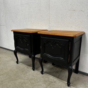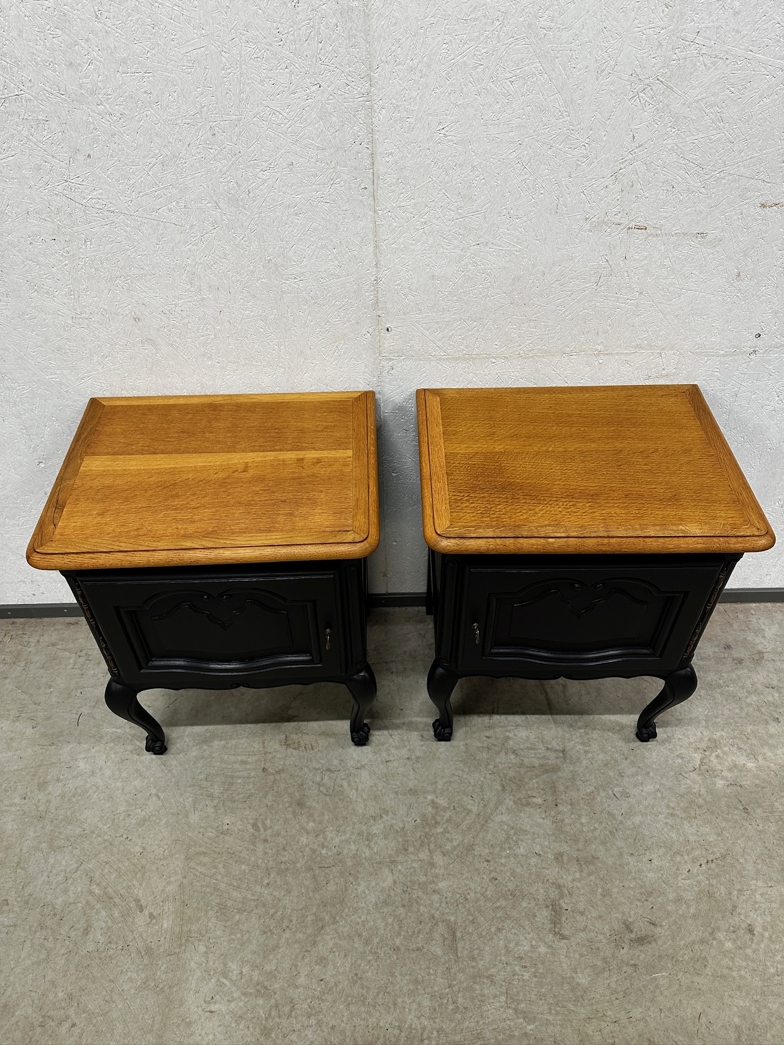 Uue viimistlusega tammest raamiga öökapid. Pealmised plaadid puhastatud vanast lakist ning õlitatud, kappide raam ja uksed värvitud Vintro kriidivärviga, toon Victorian Black. Müügil komplektina.