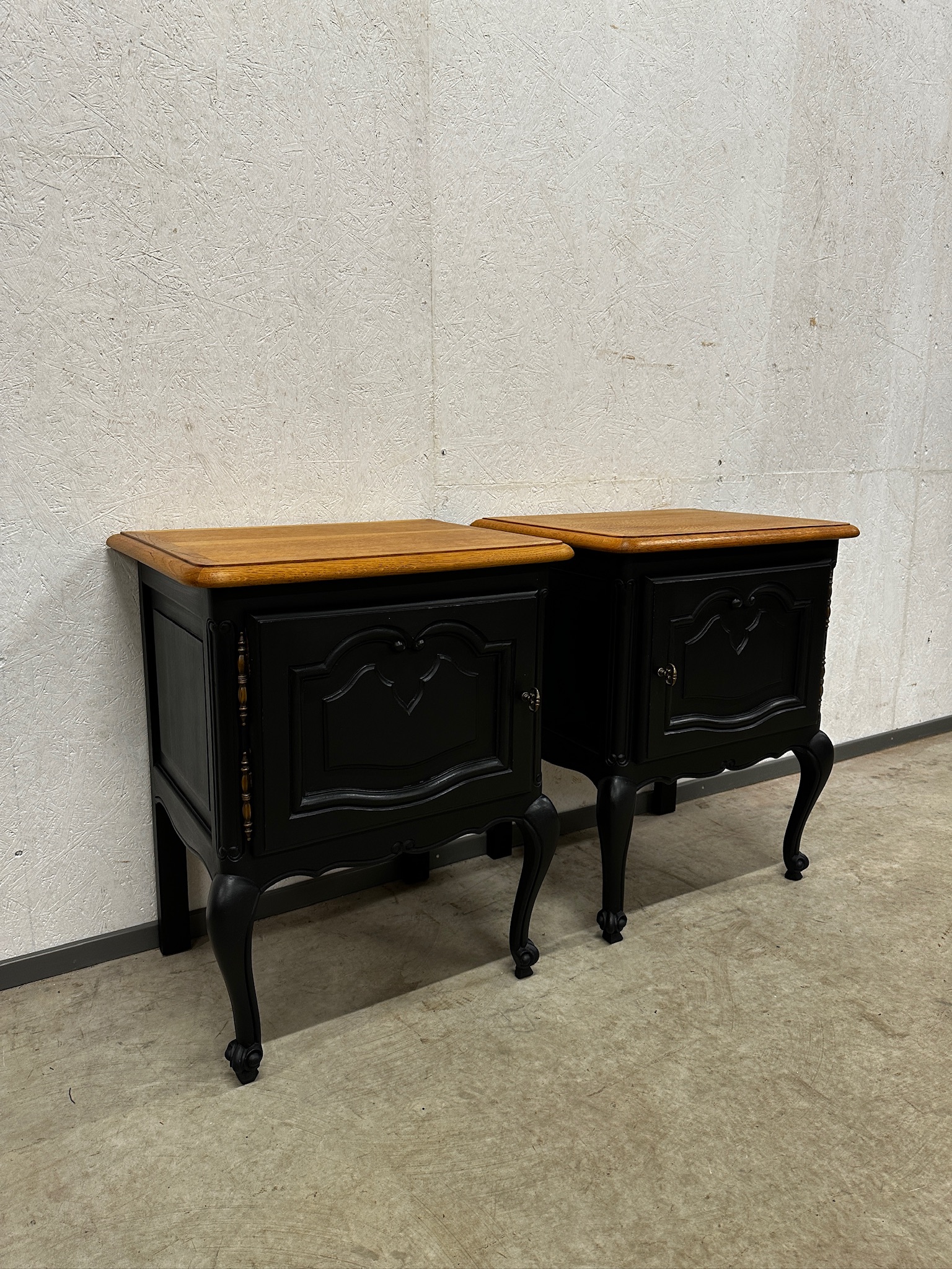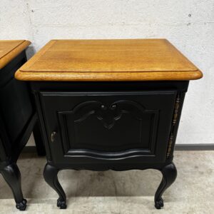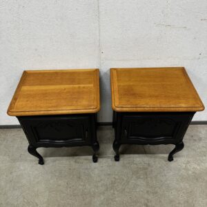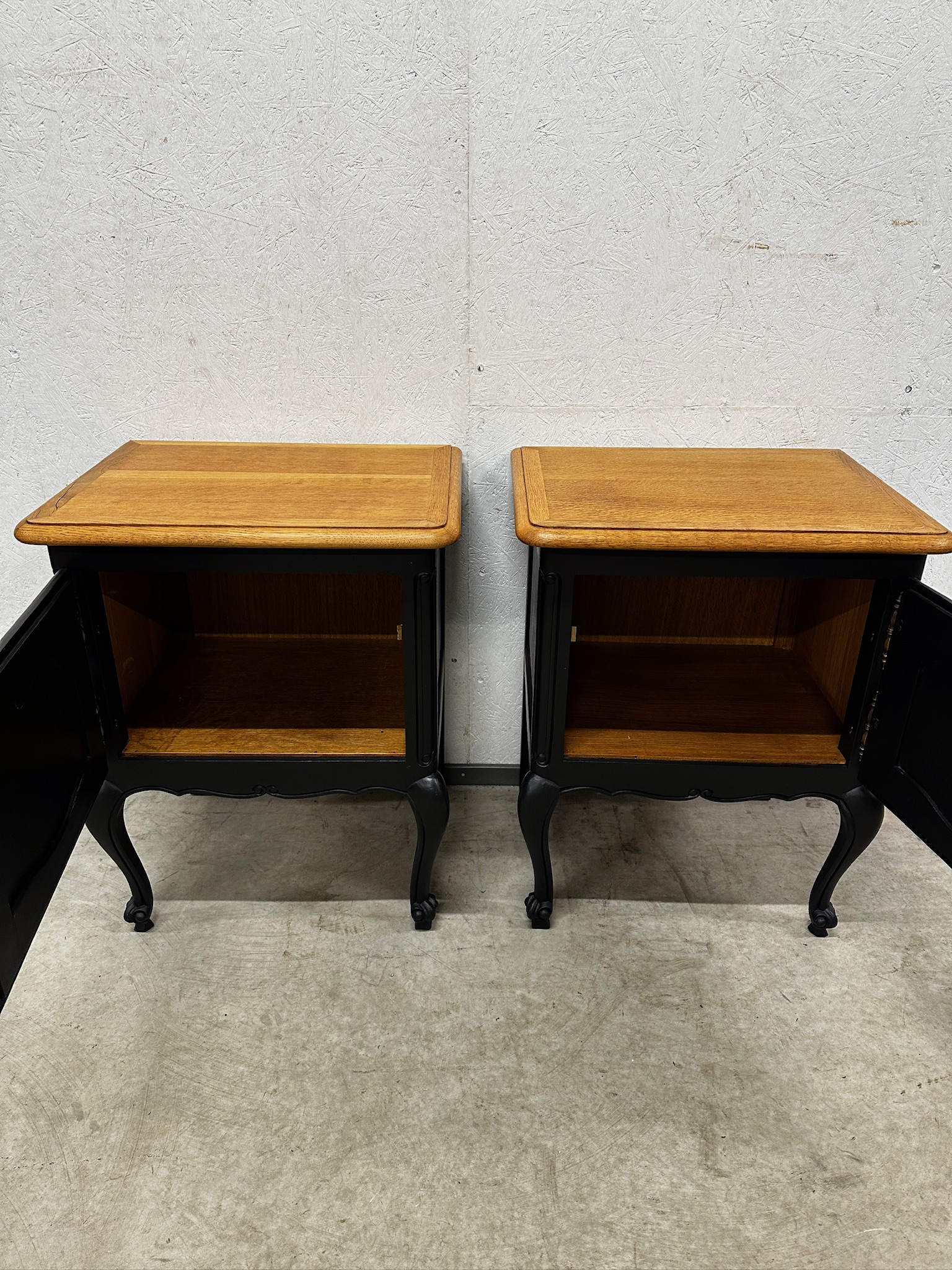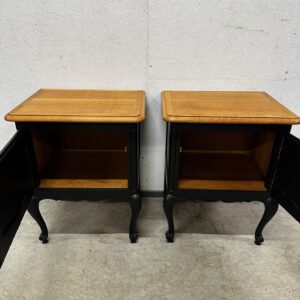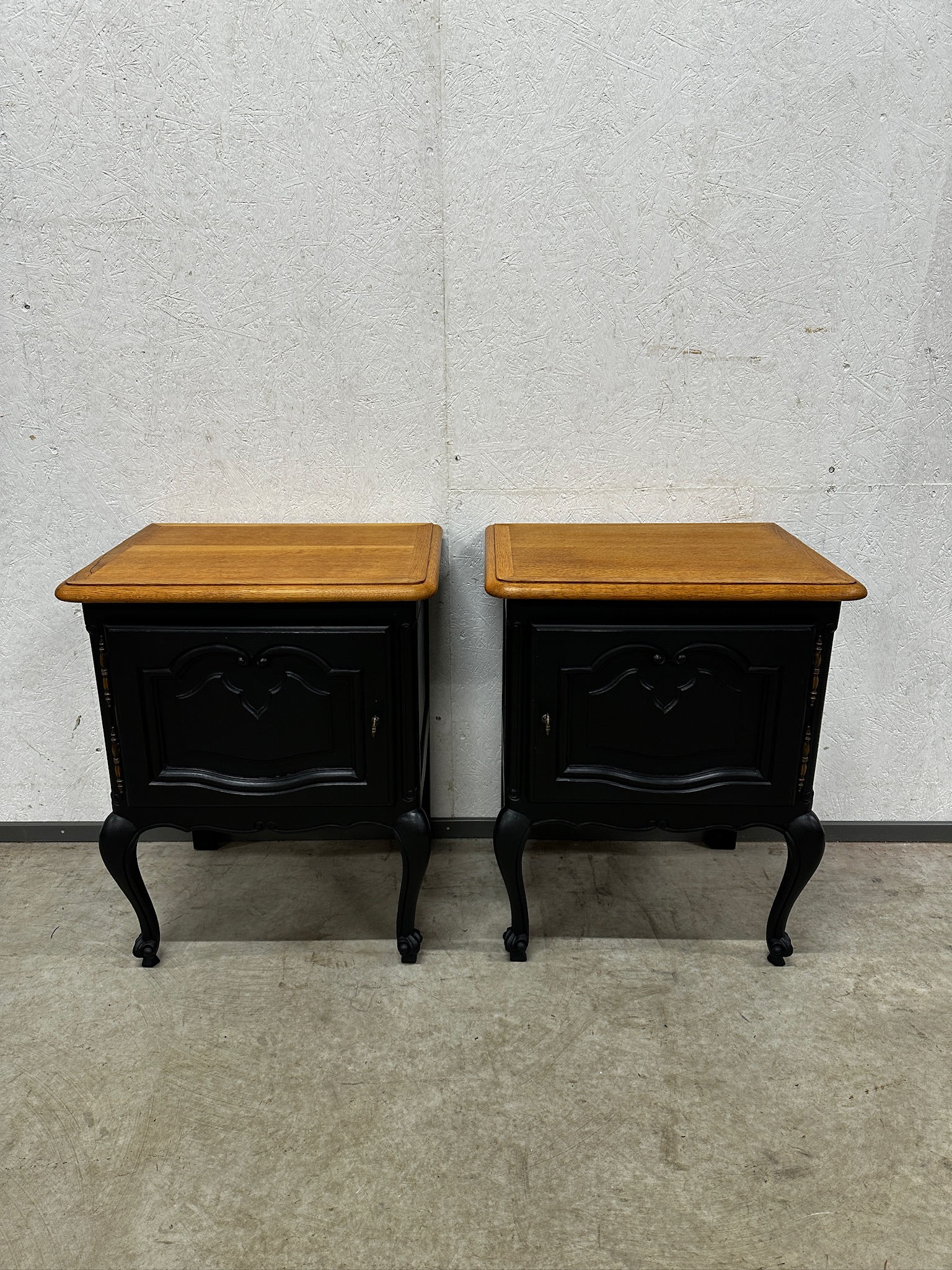 Uue viimistlusega tammest raamiga öökapid. Pealmised plaadid puhastatud vanast lakist ning õlitatud, kappide raam ja uksed värvitud Vintro kriidivärviga, toon Victorian Black. Müügil komplektina.