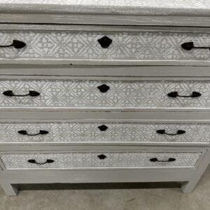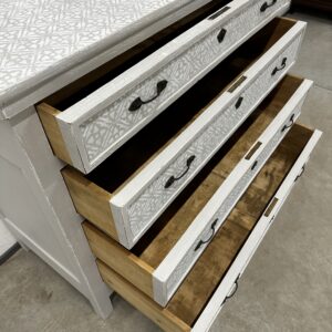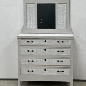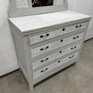 Uue viimistlusega sahtlitega kummut. Kummut on puidust, värvitud Vintro kriidivärviga, toon Tower Bridge/Crystal (helehall/valge). Sahtlid käivad suhteliselt hästi, kuid peab tõmbama mõlemast käepidemest korraga samaaegselt. Töötasapinna kõrgus 102 cm.