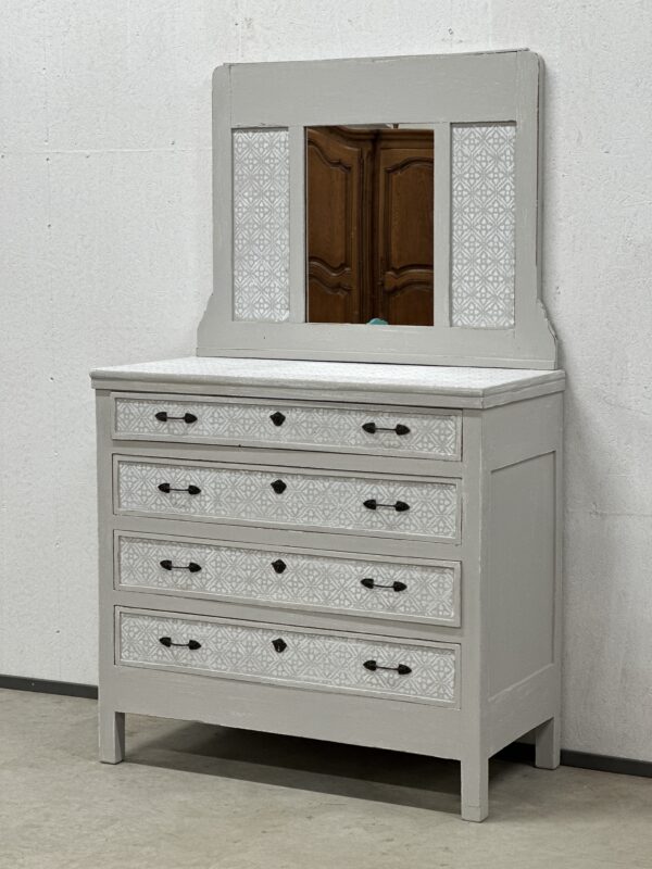 Uue viimistlusega sahtlitega kummut. Kummut on puidust, värvitud Vintro kriidivärviga, toon Tower Bridge/Crystal (helehall/valge). Sahtlid käivad suhteliselt hästi, kuid peab tõmbama mõlemast käepidemest korraga samaaegselt. Töötasapinna kõrgus 102 cm.