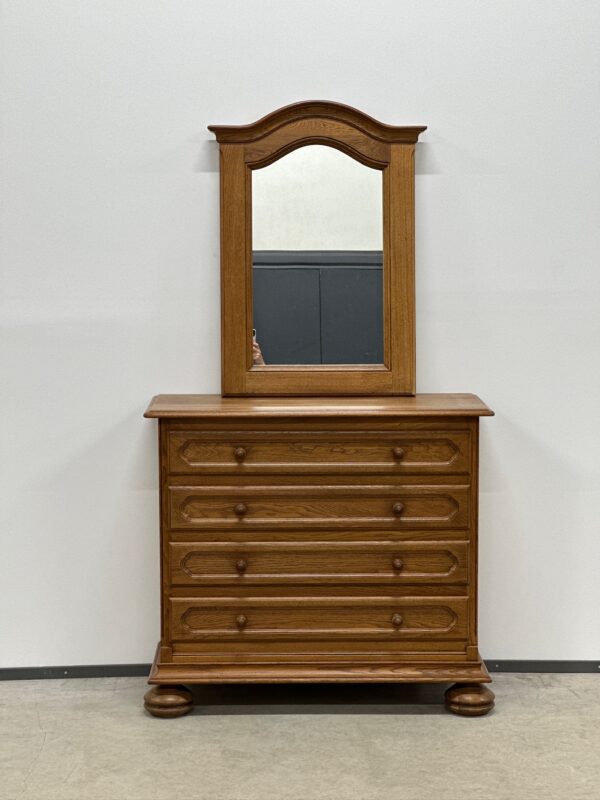 Üleni tammest nelja sahtliga kummut ning seinale kinnitatav peegel. Peegli mõõdud: laius 67 cm, kõrgus 90 cm. Mõlemad esemed väga korralikud ja puhtad.
