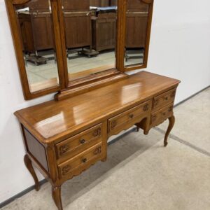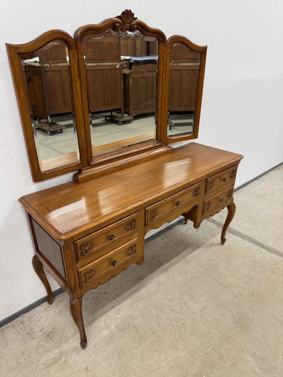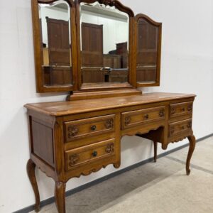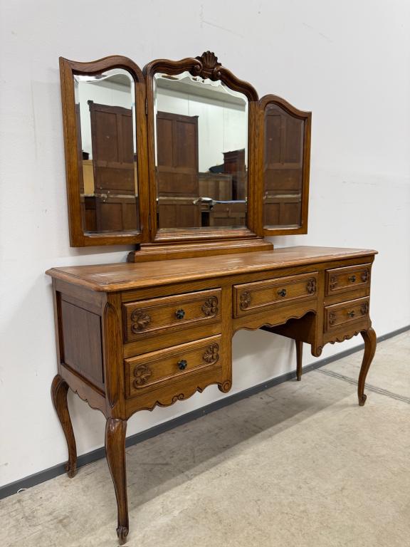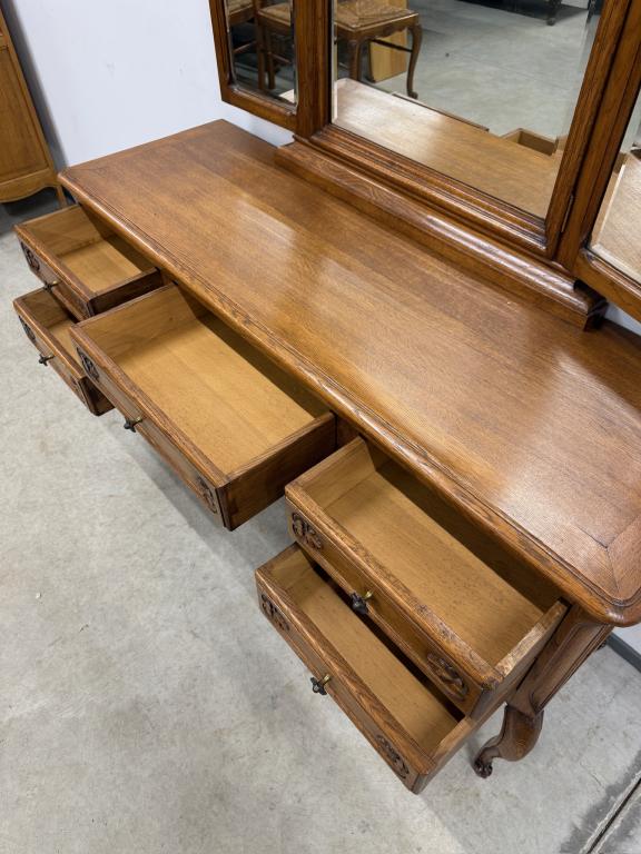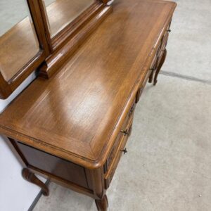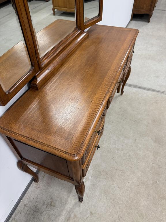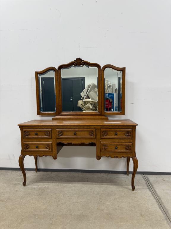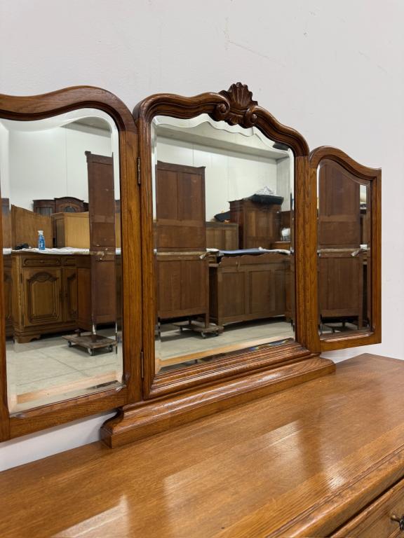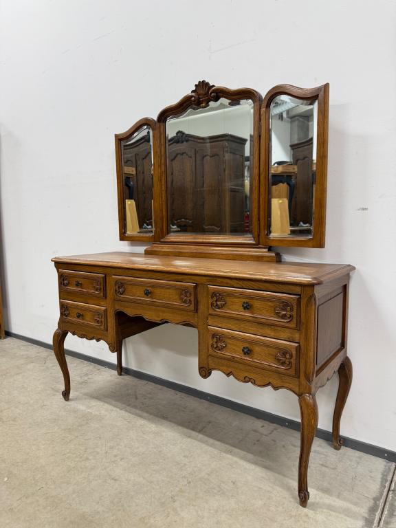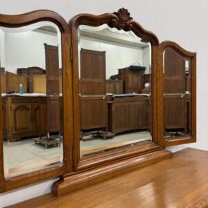 Tammest raamiga, ilusate nikerdustega peeglilaud. Laua kõrgus 76 cm, peegel 80 cm. Peeglite kandid faasitud. Mõned tuhmumisjäljed peeglitel, kuid üldine seisukord korralik. Transport vajadusel kahes osas.