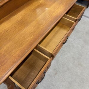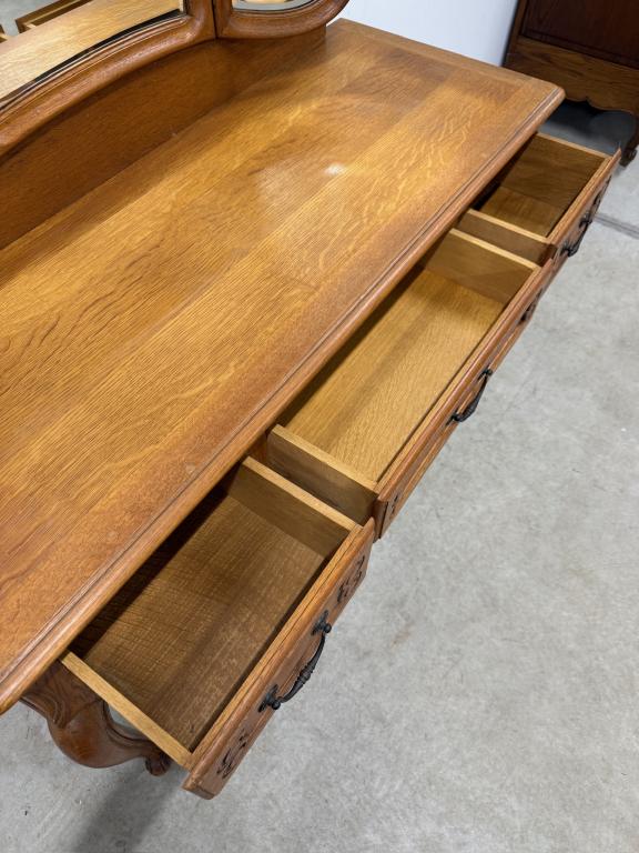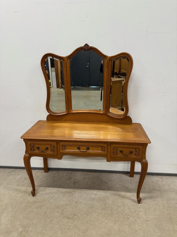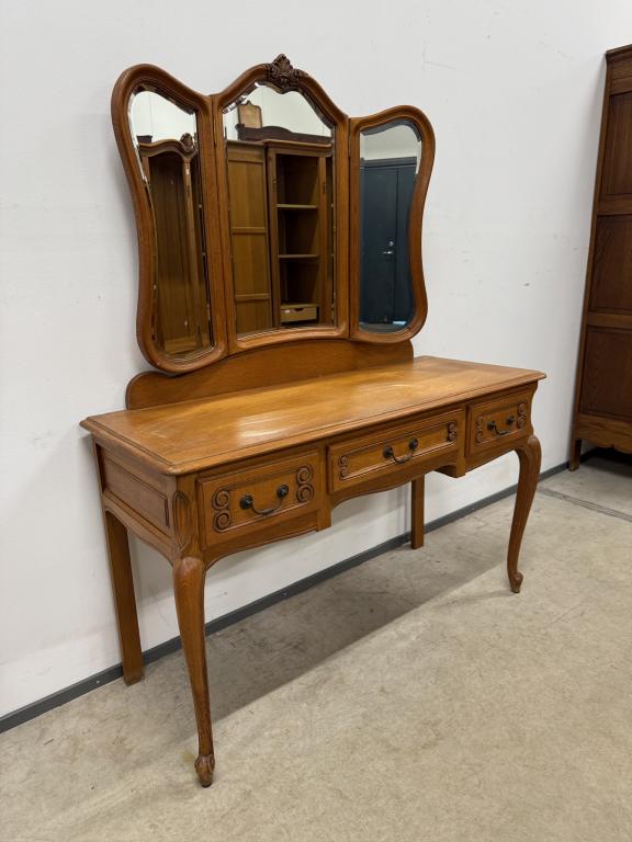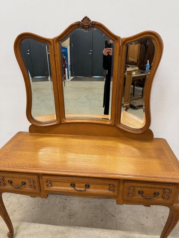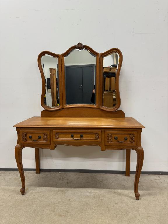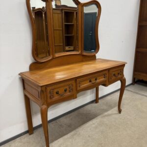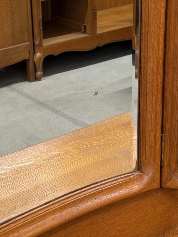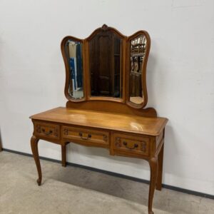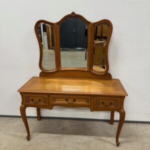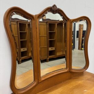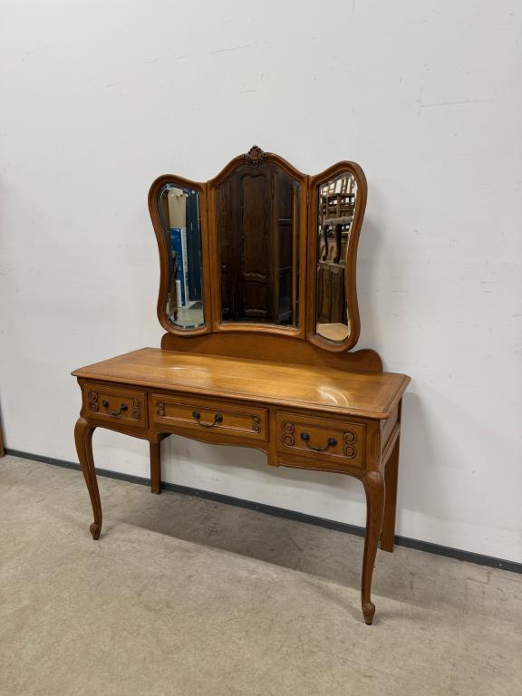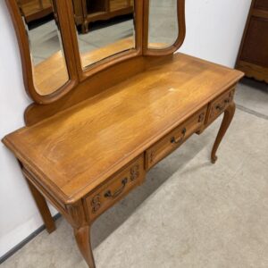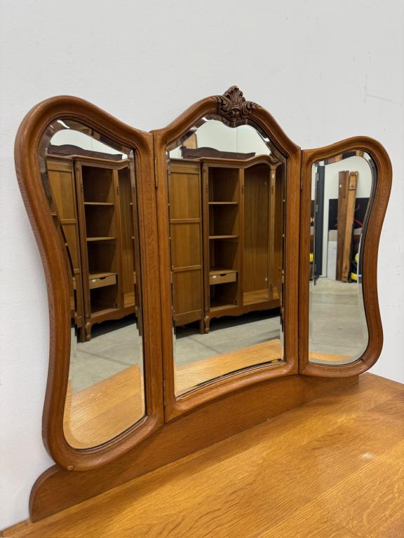 Tammest raamiga soliidne peeglilaud. Laua kõrgus 76 cm, peegel 85 cm. Leidub väiksemaid kulumis- ja kasutusjälgi, kuid üldmulje korralik. Peeglil väike tume laik – vt pilt. Transport vajadusel kahes osas.