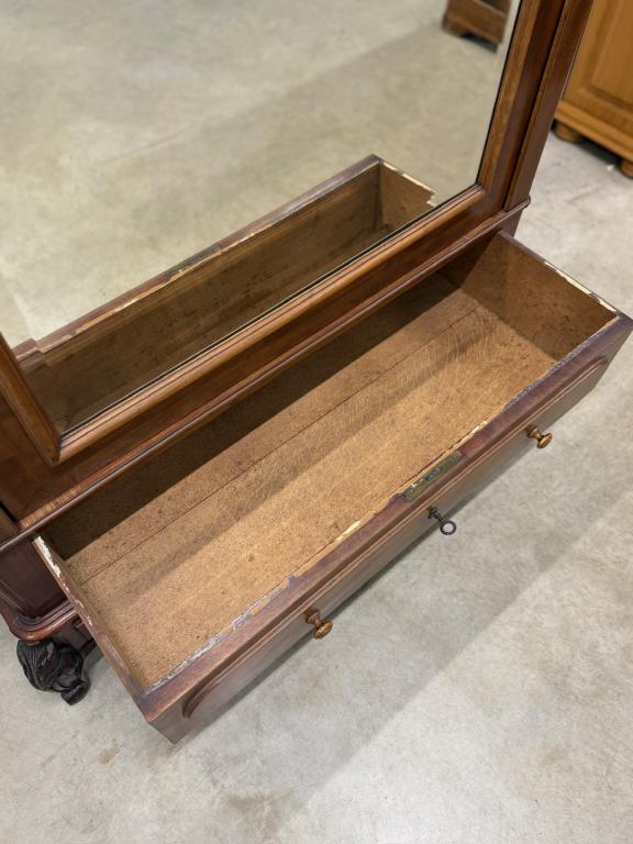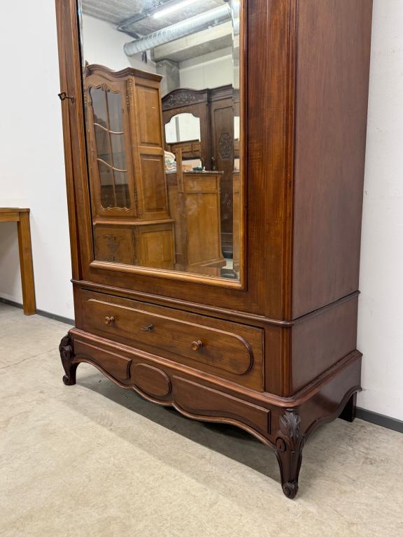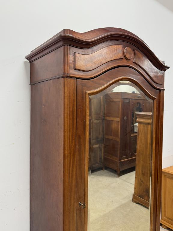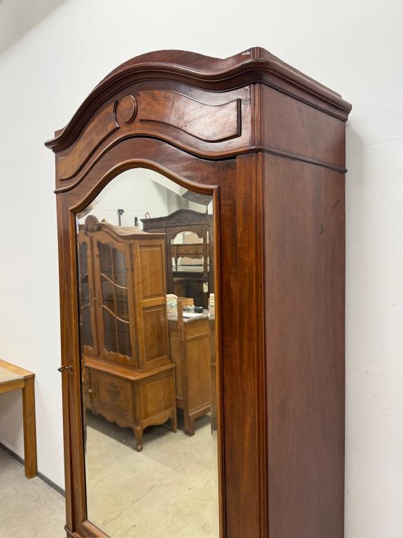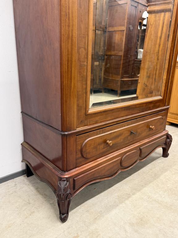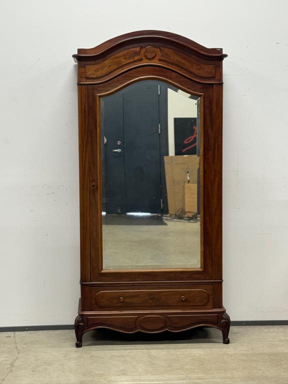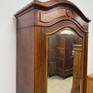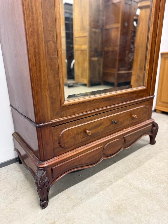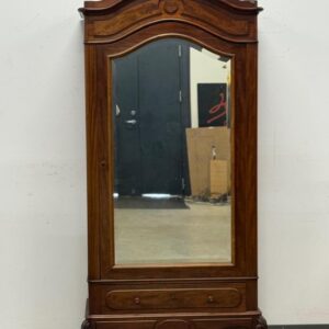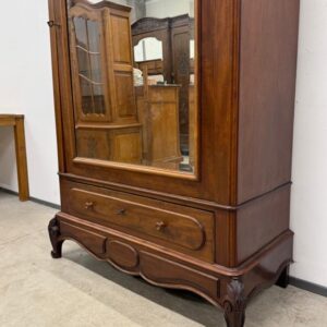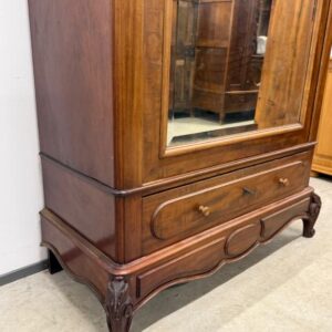 Suure peegeluksega sajandivanune pesukapp. Sees puidust riiulid, peegel faasitud kandiga. All mahukas sahtel. Lukk töökorrras, võti olemas. Transport osadena.