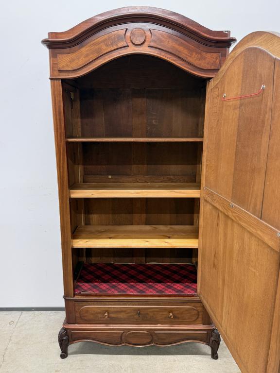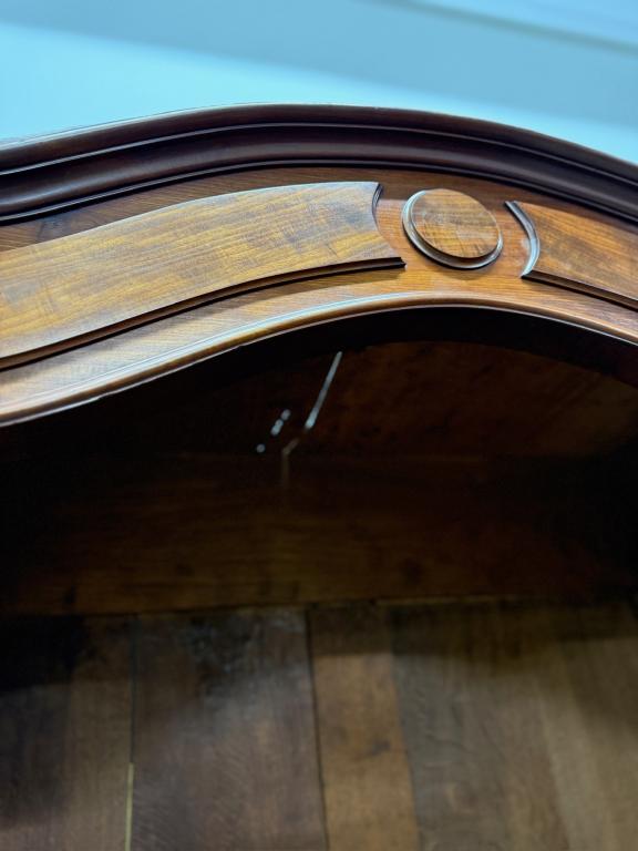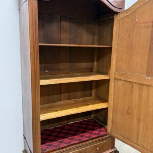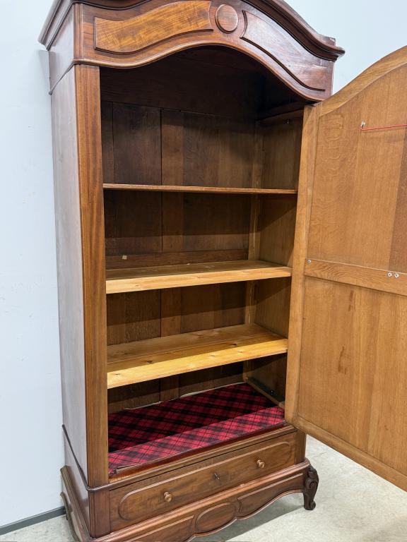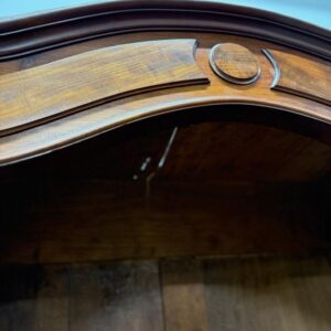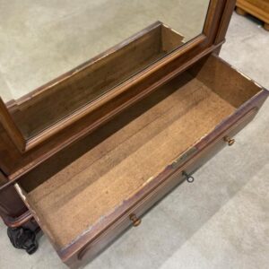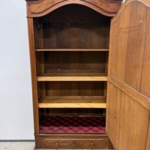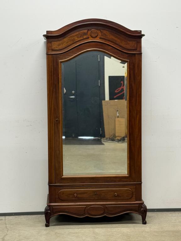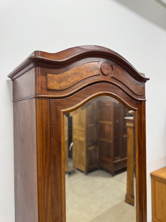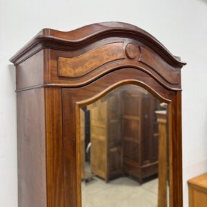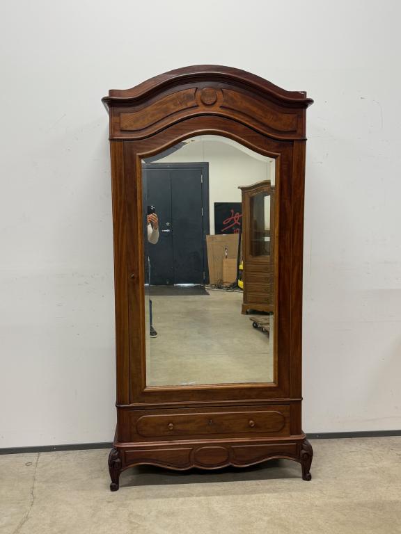 Suure peegeluksega sajandivanune pesukapp. Sees puidust riiulid, peegel faasitud kandiga. All mahukas sahtel. Lukk töökorrras, võti olemas. Transport osadena.
