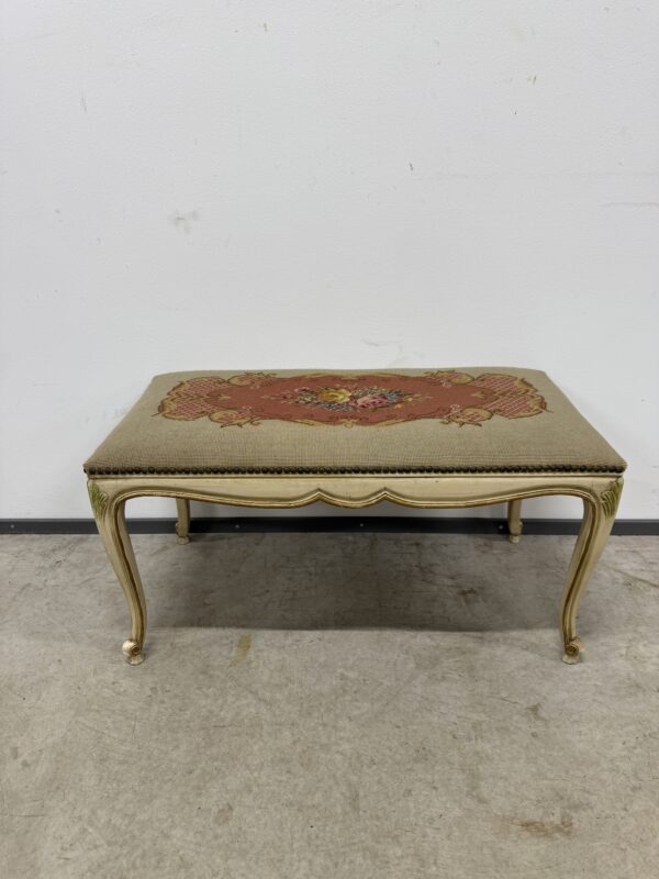 Tikitud kattega antiikvalge raamiga pikk pink. Kate veidi määrdunud, raam tugev ja stabiilne.