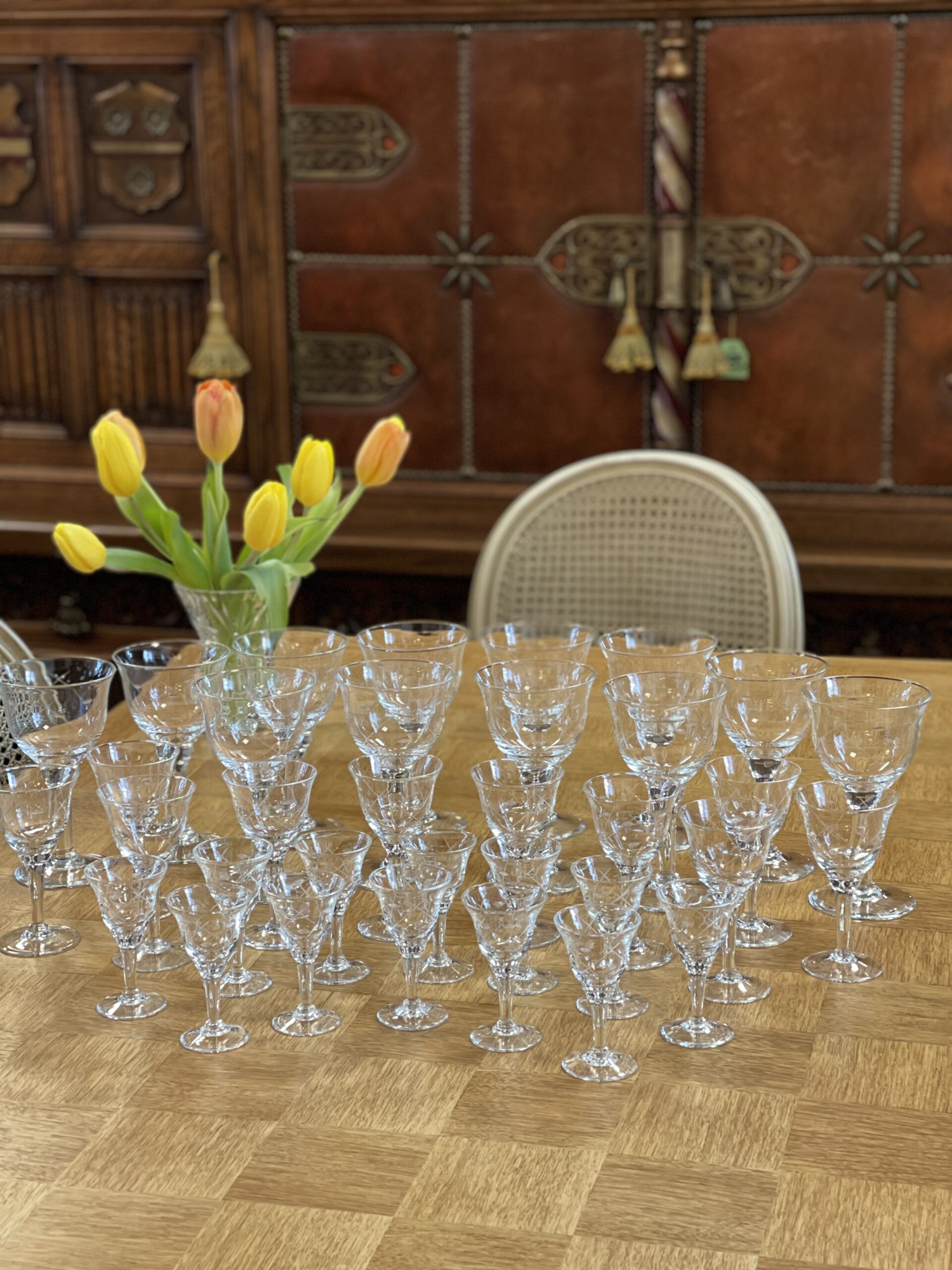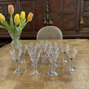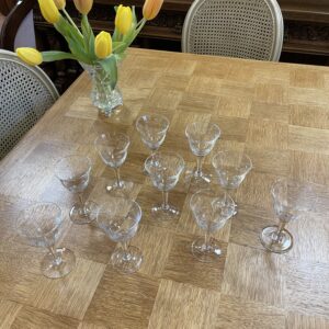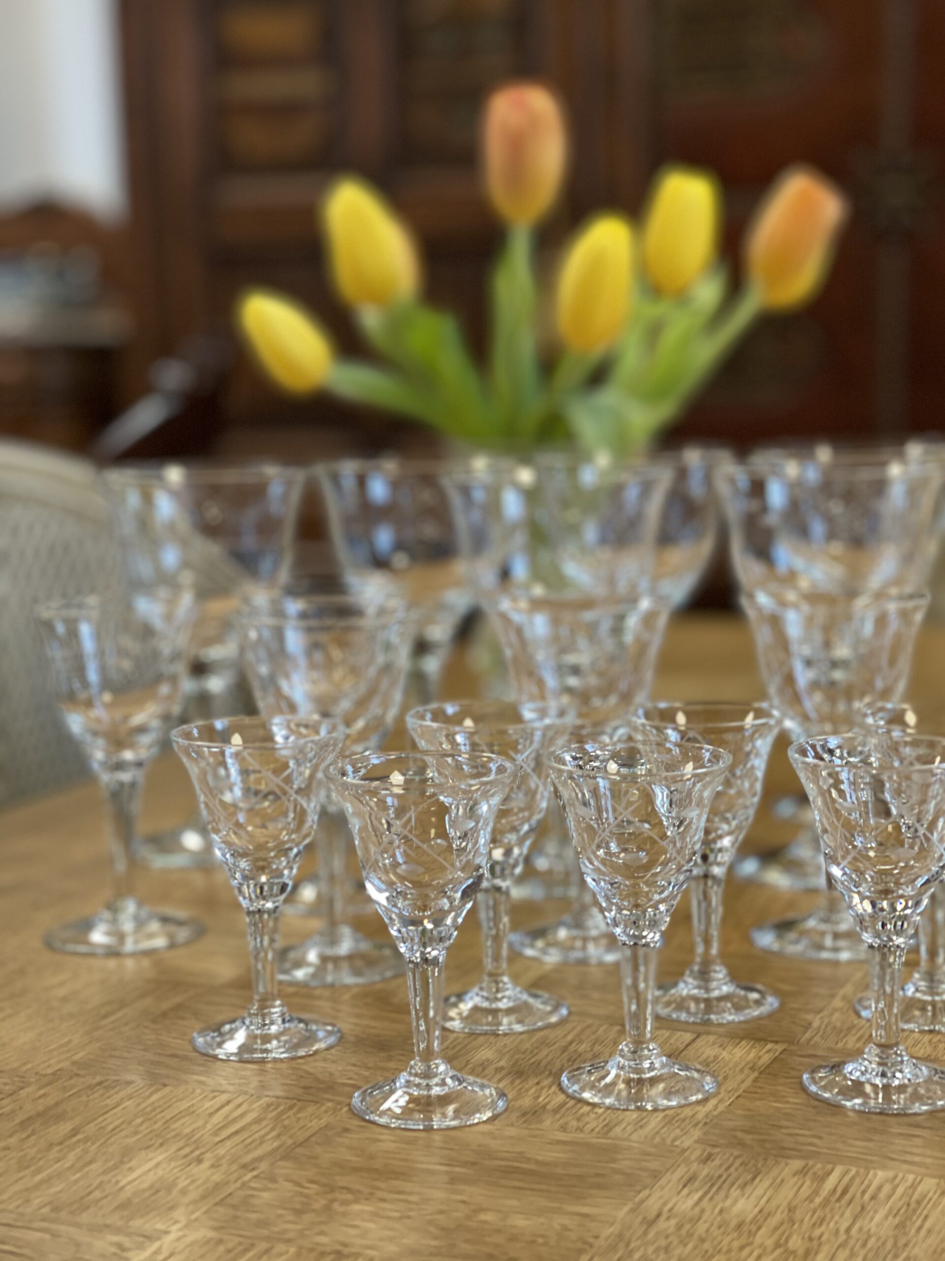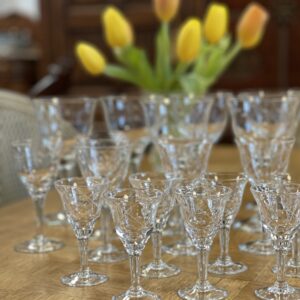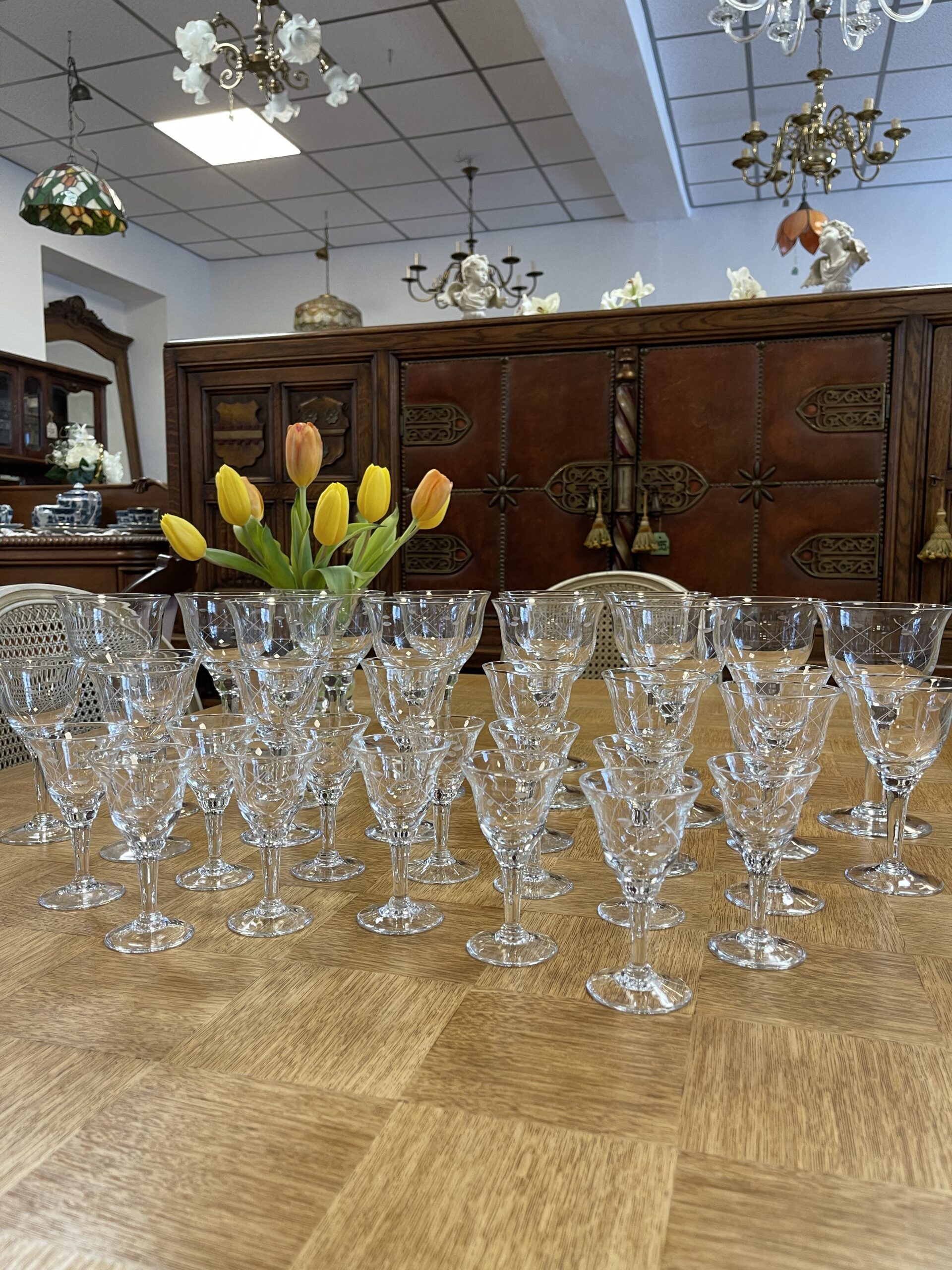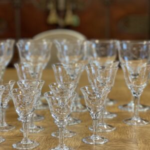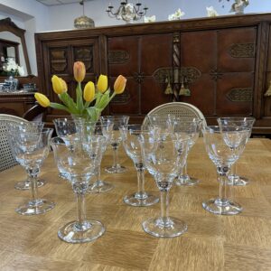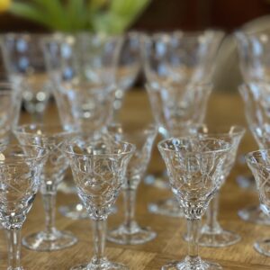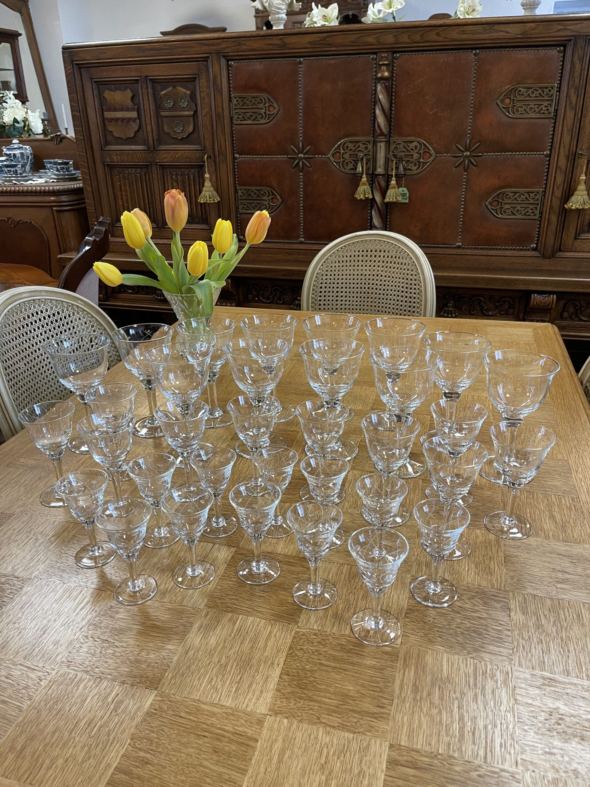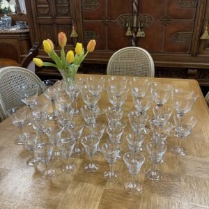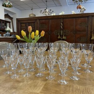 34-st esemest koosnev pokaalide komplekt. Komplekti kuulub: 12 veinipokaali, 10 portveini pokaali, 12 likööripitsi. Kõik komplekti osad suurepärases seisukorras. Kokku lüües kaunis kristalne kõla 😉