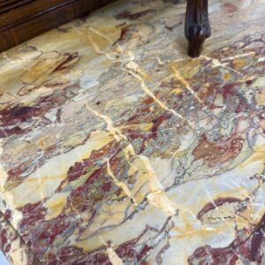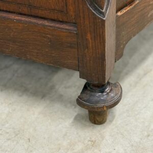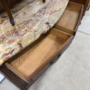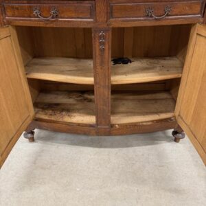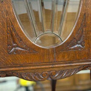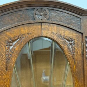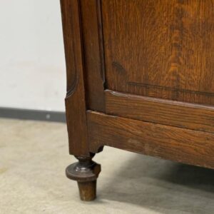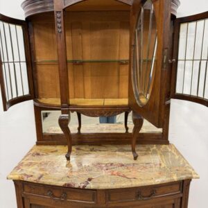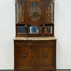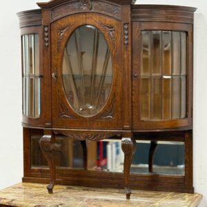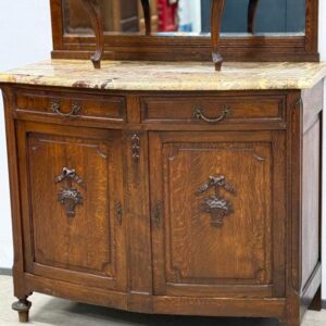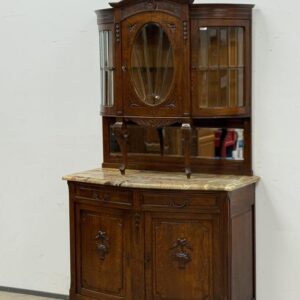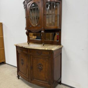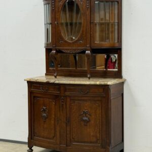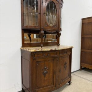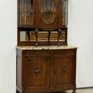 Kaunis sajandivanune puhvetkapp. Ilusad nikerdused ustel ja raamil. Pilkupüüdvad faasitud kantidega klaasid ja peegel. Marmorplaat äärmiselt paks ja raske. NB! Leidub kulumis- ja kasutusjälgi, kuivamispragusid, toonierinevusi. Alumise kapi põhjas kuivamispraod, ühel jalal tükid ära – vt pilt. Transport kolmes osas.