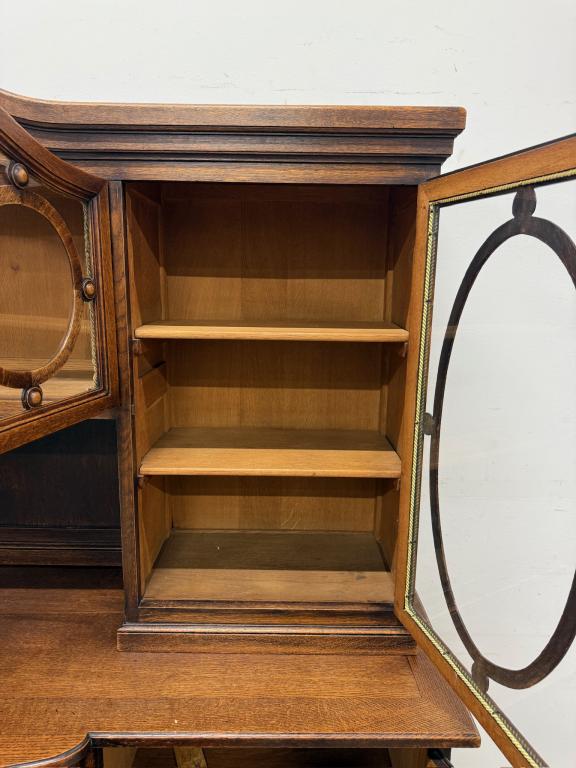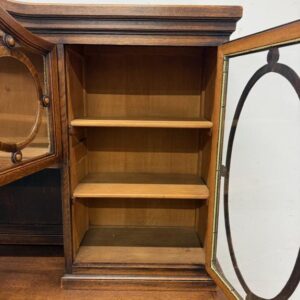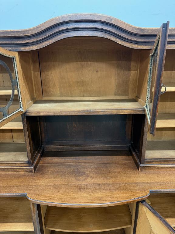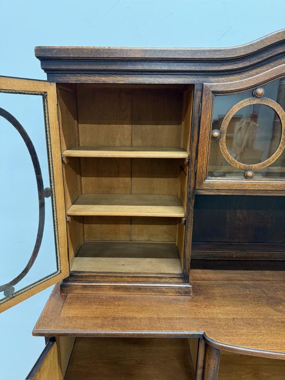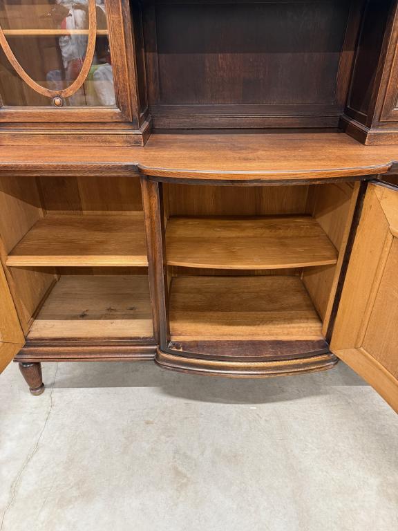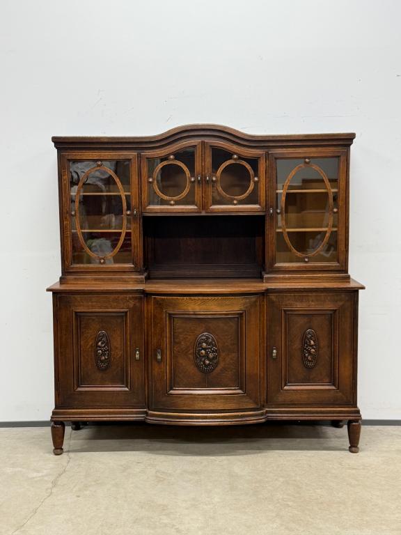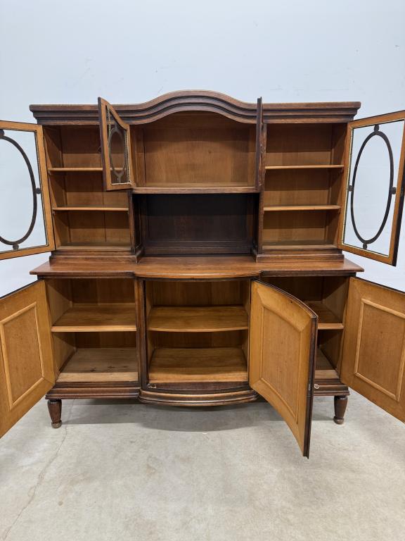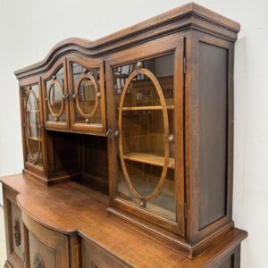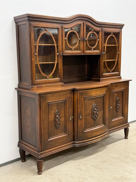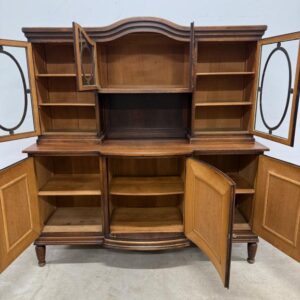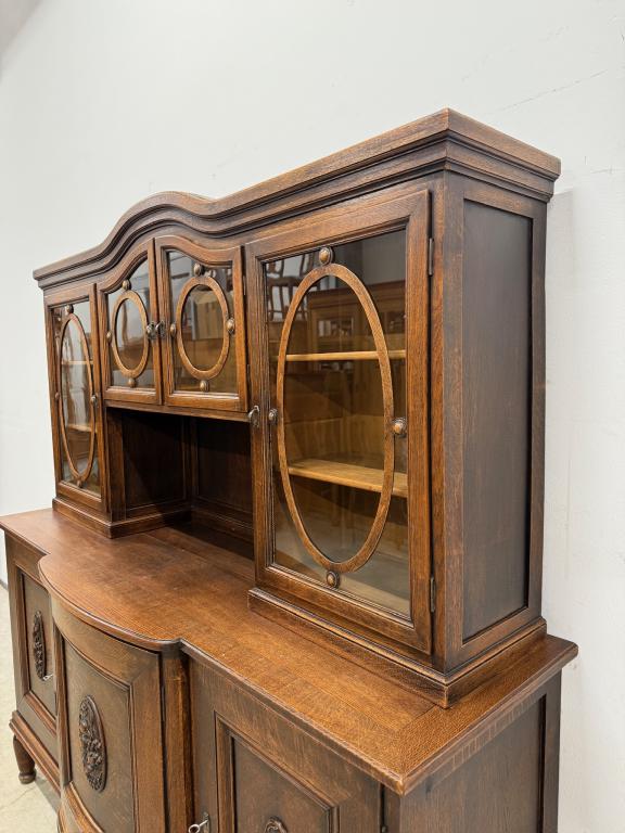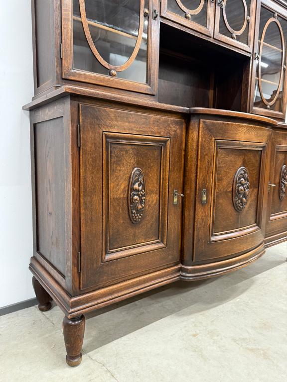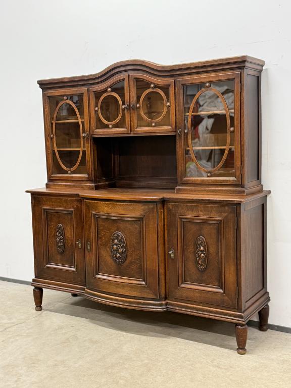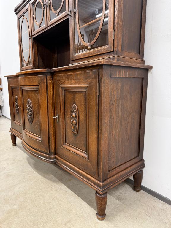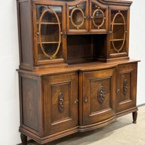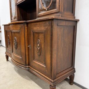 Tumepruuni peitsiga mahukas puhvetkapp. Kaunid nikerdused ustel ja raamil. Alumise kapi uksed lukustatavad, olemas kaks võtit! Väga heas seisukorras. Transport kahes osas.