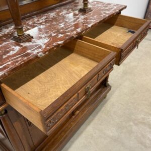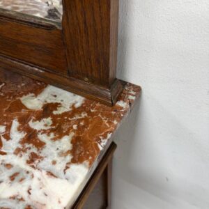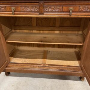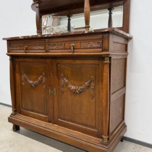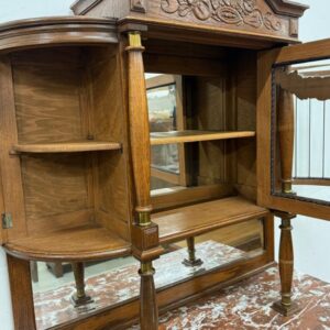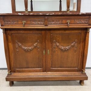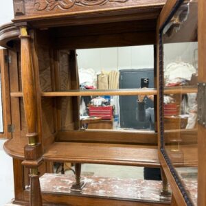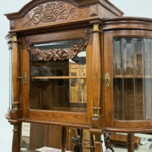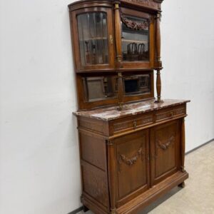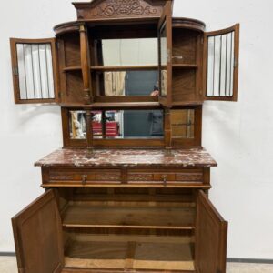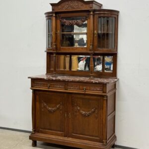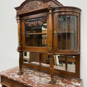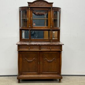 Kaunite lillevanikutega sajandivanune puhvetkapp. Pilkupüüdev ja kaunis. Klaasid faasitud servadega, kena kaarjas vorm. Lukud töökorras, võtmed olemas. Marmorplaadi servas mõned täksid, pisike puidukild puudu – vt pilt. Leidub kulumis- ja kasutusjälgi, kuid üldmulje väga hea. Transport kolmes osas.