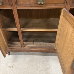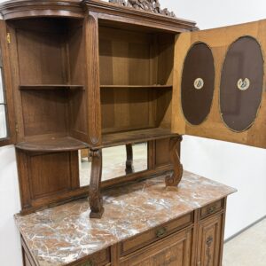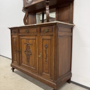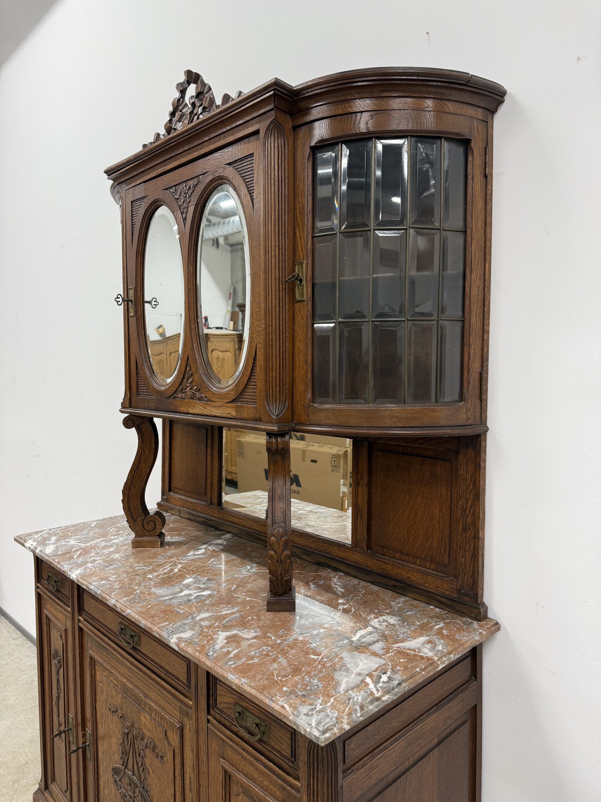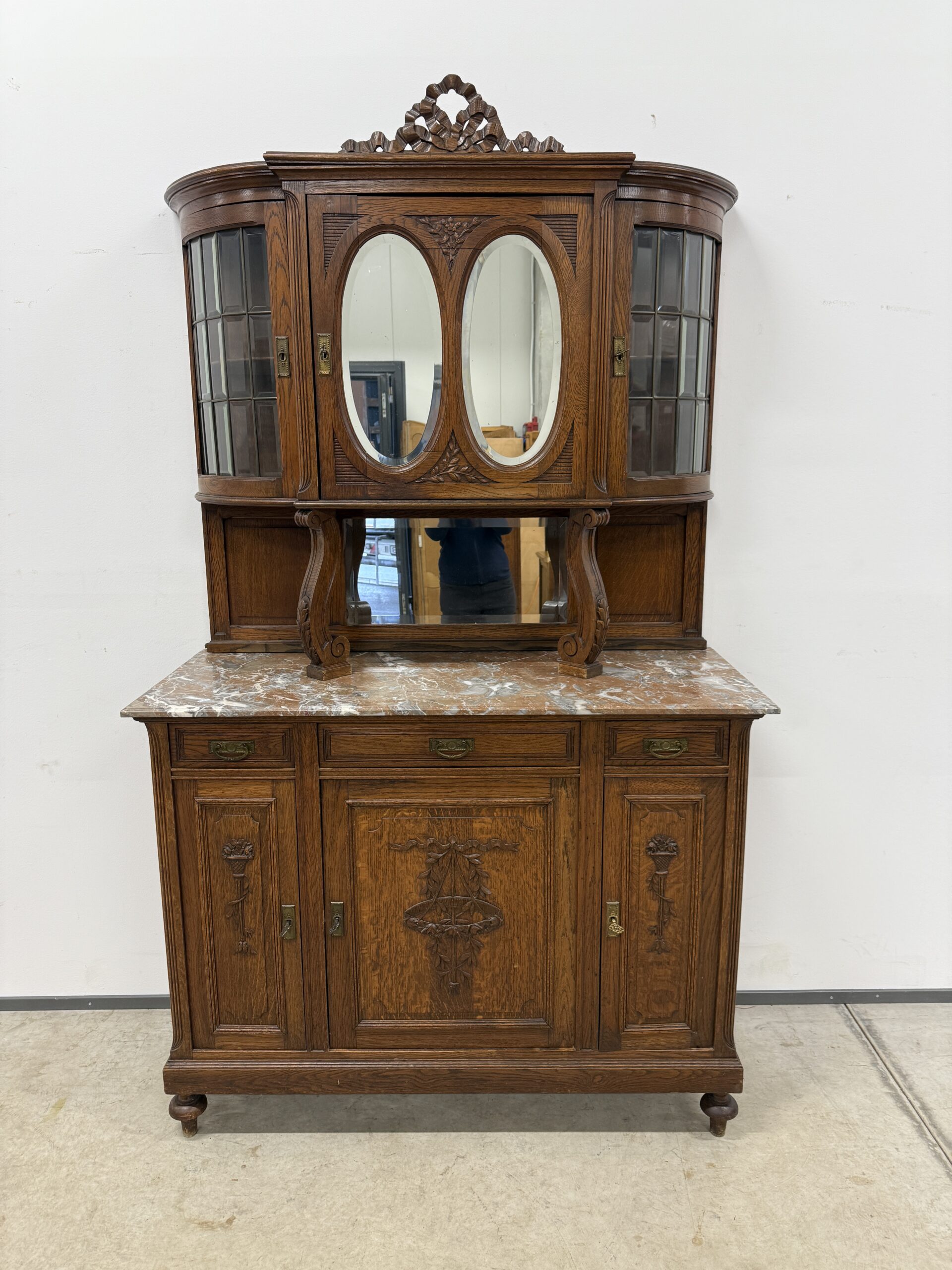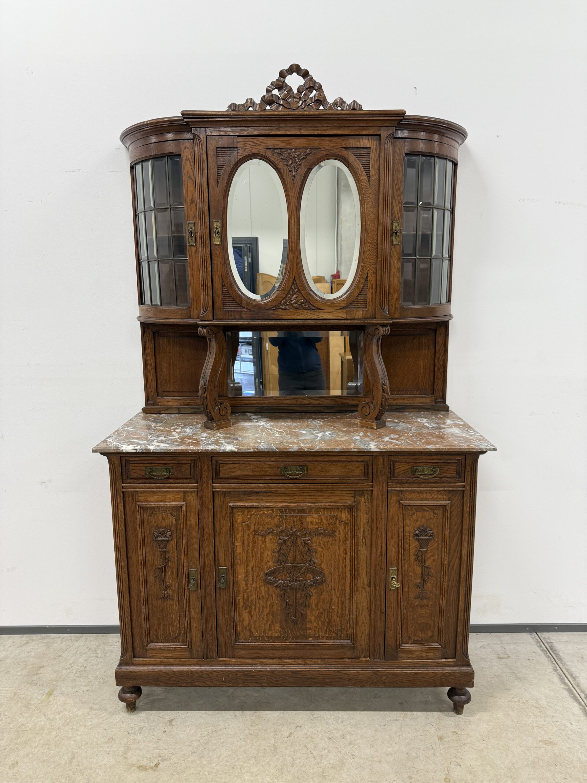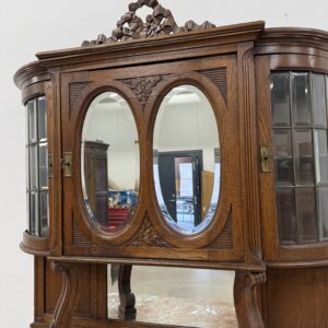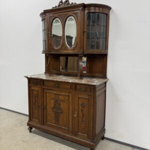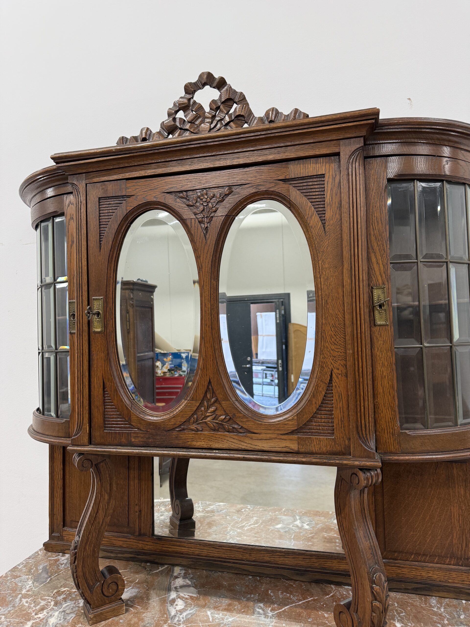 Kaunis sajandivanune puhvetkapp. Pilkupüüdvad faasitud servadega klaasid ning peeglid, kenad nikerdused raamil ja ustel. Leidub väiksemaid kulumis- ja kasutusjälgi, kuid üldmulje väga hea. Lukud töökorras, võtmed olemas. Transport kolmes osas.