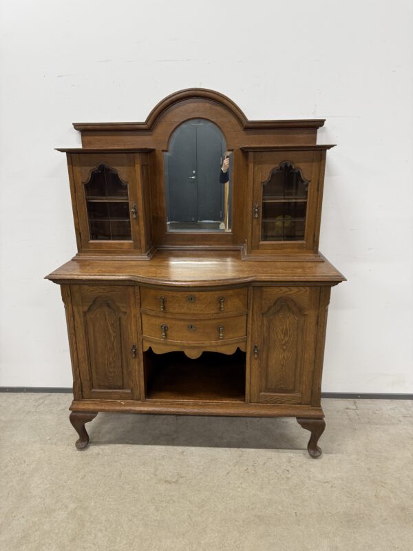 Kauni vormiga sajandivanune tammest puhvetkapp. Kenad faasitud servadega klaasid, peegel. Kaks mahukat sahtlit. Lukud töökorras, võtmed olemas. Transport kahes osas.